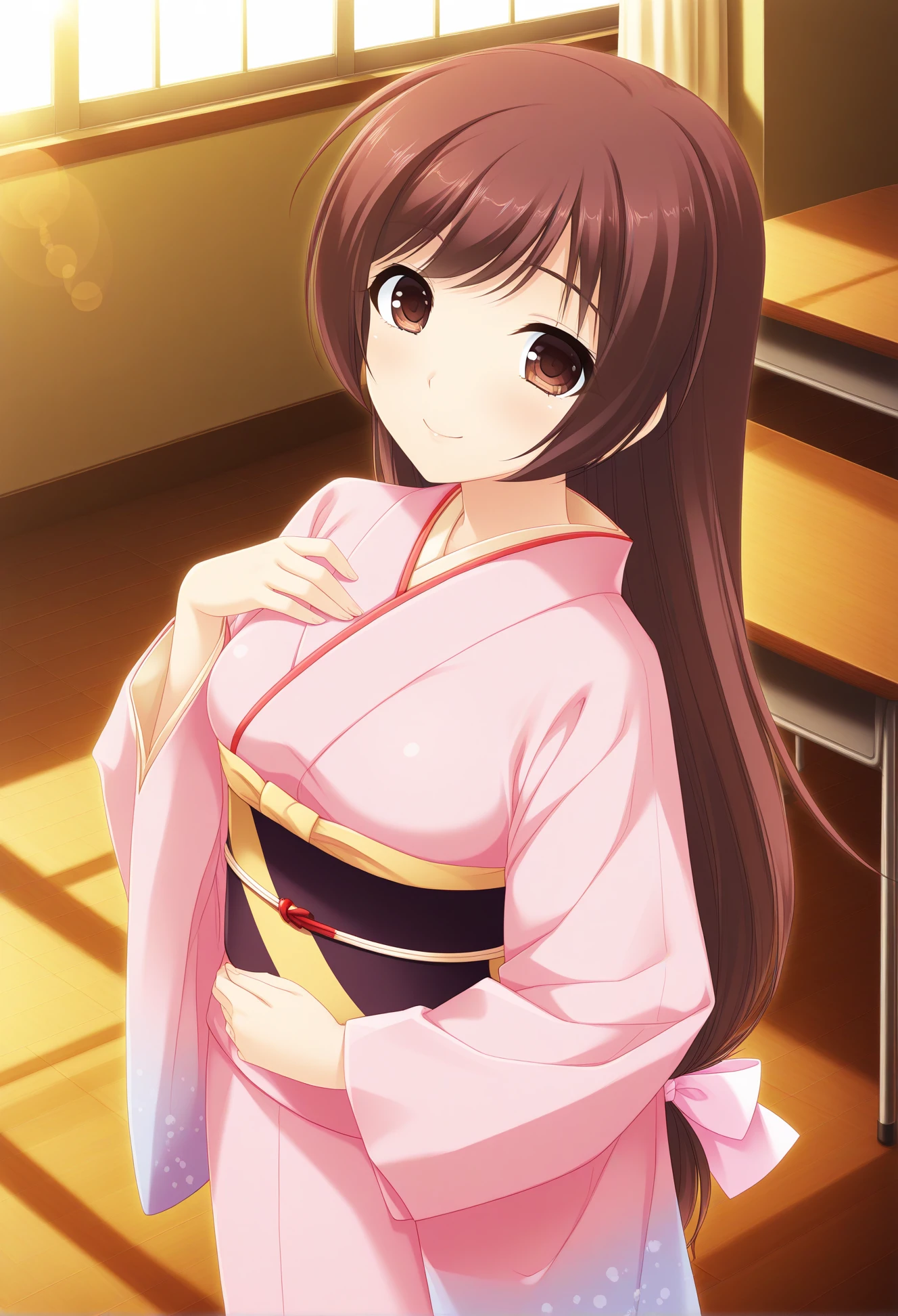 asuka_aoba, 1girl, solo, brown eyes, long hair, very long hair, brown hair, hair bow, bow, pink bow, medium breasts,