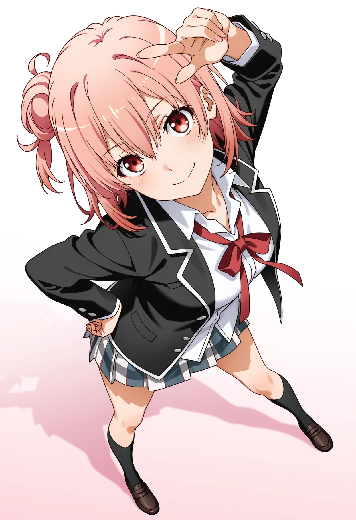 sobu high school uniform, black jacket, white shirt, open jacket, loose neck ribbon, red ribbon, plaid skirt, black kneehighs, loafers, ********************