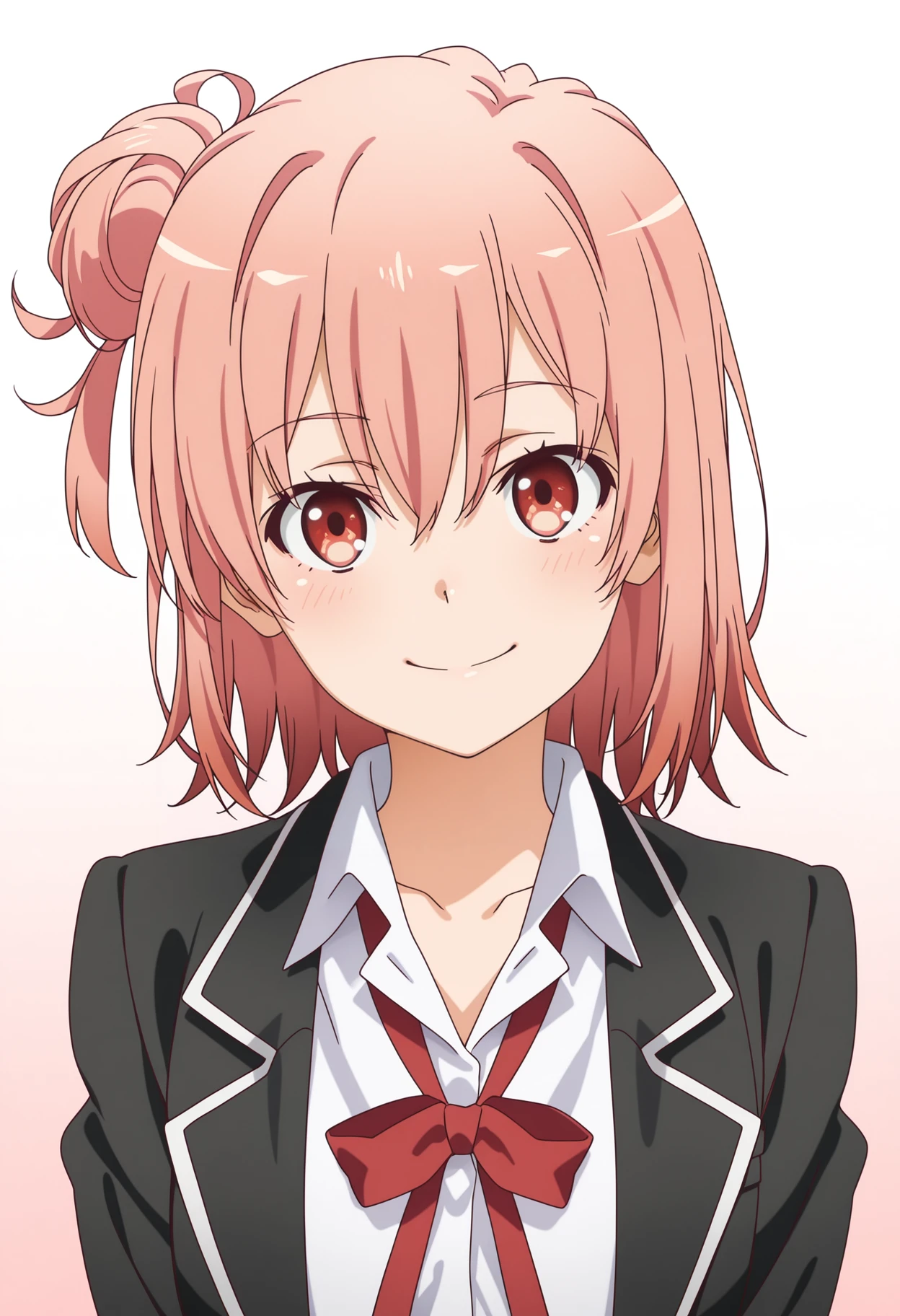 pink hair, single hair bun, single side bun, medium hair, hair between eyes, red eyes, anime coloring, anime screencapOutfit: