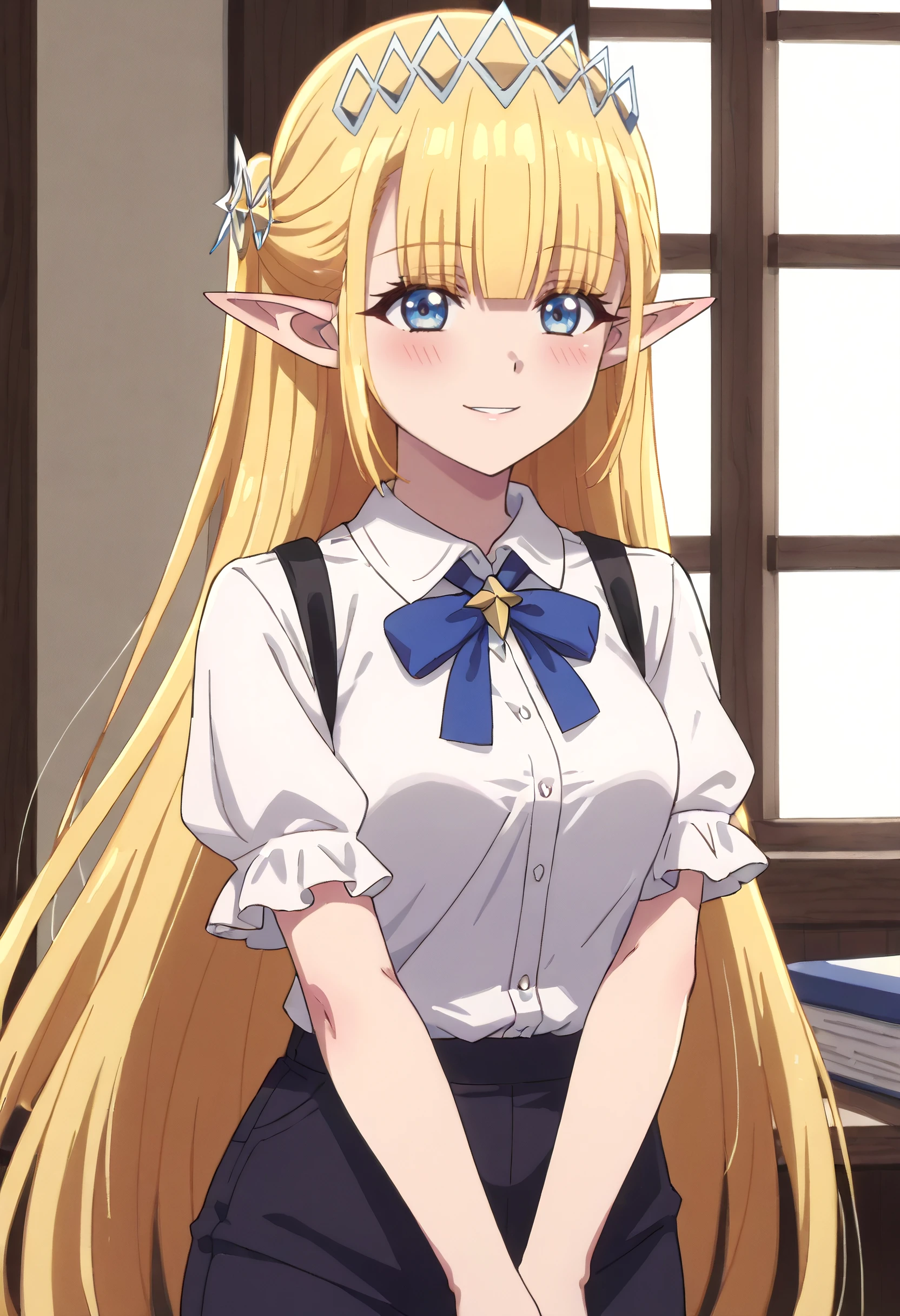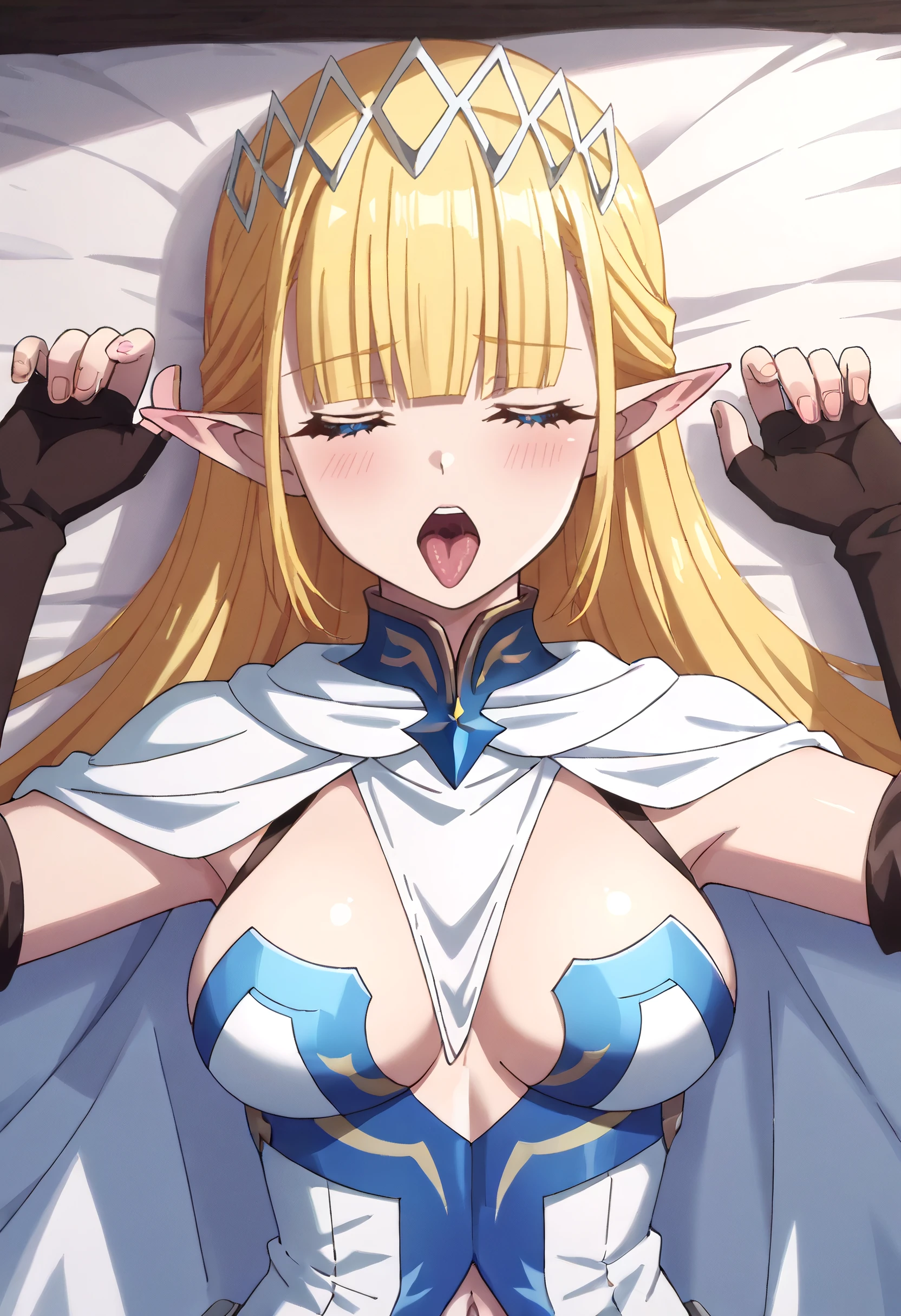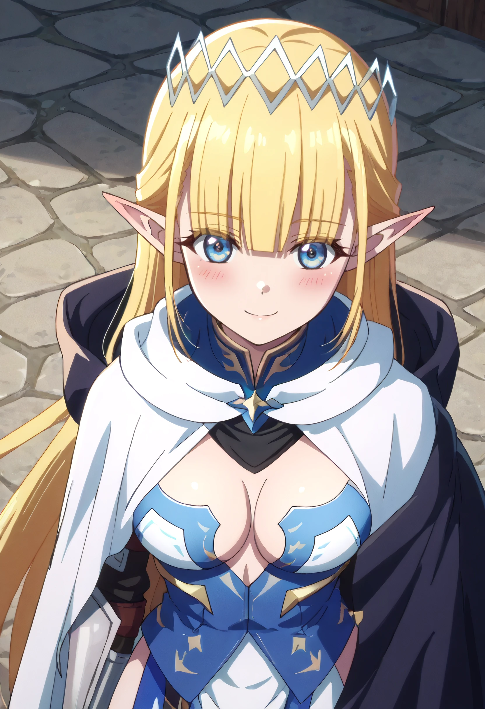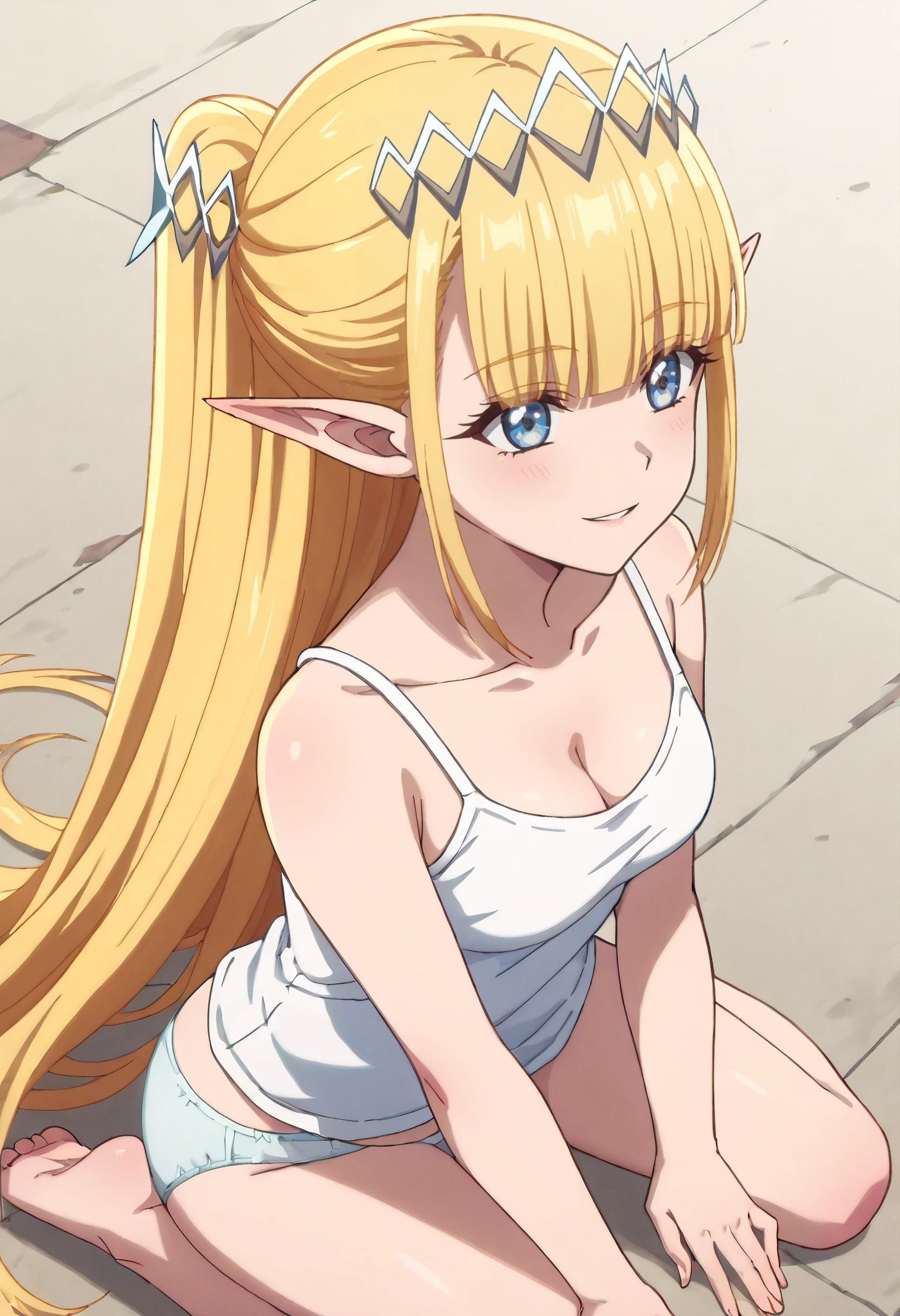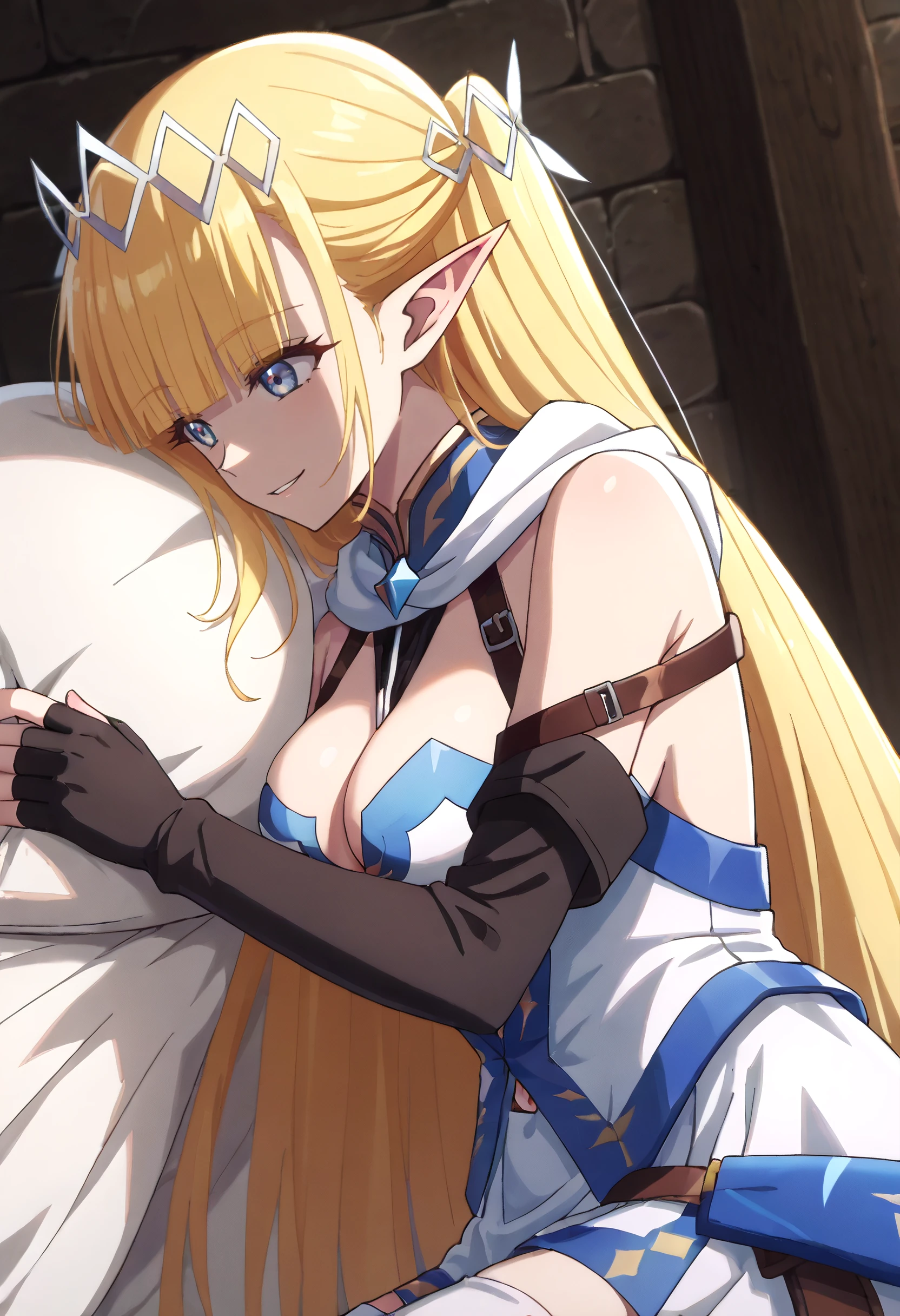 FFrSeras, long hair, blonde hair, bangs, pointy ears, long pointy ears, blue eyes, elf, eyebrows visible through hair, blunt bangs, very long hair,