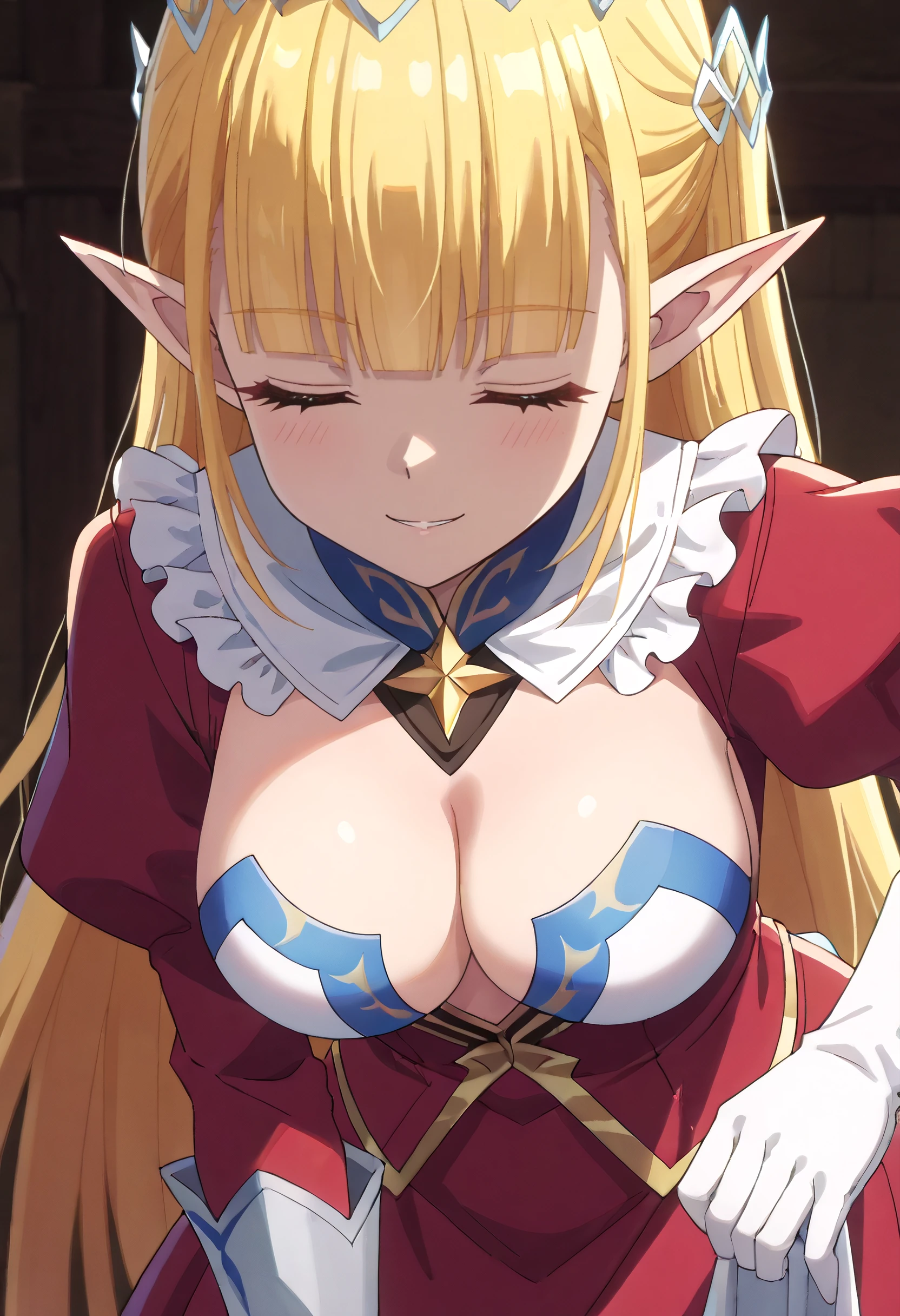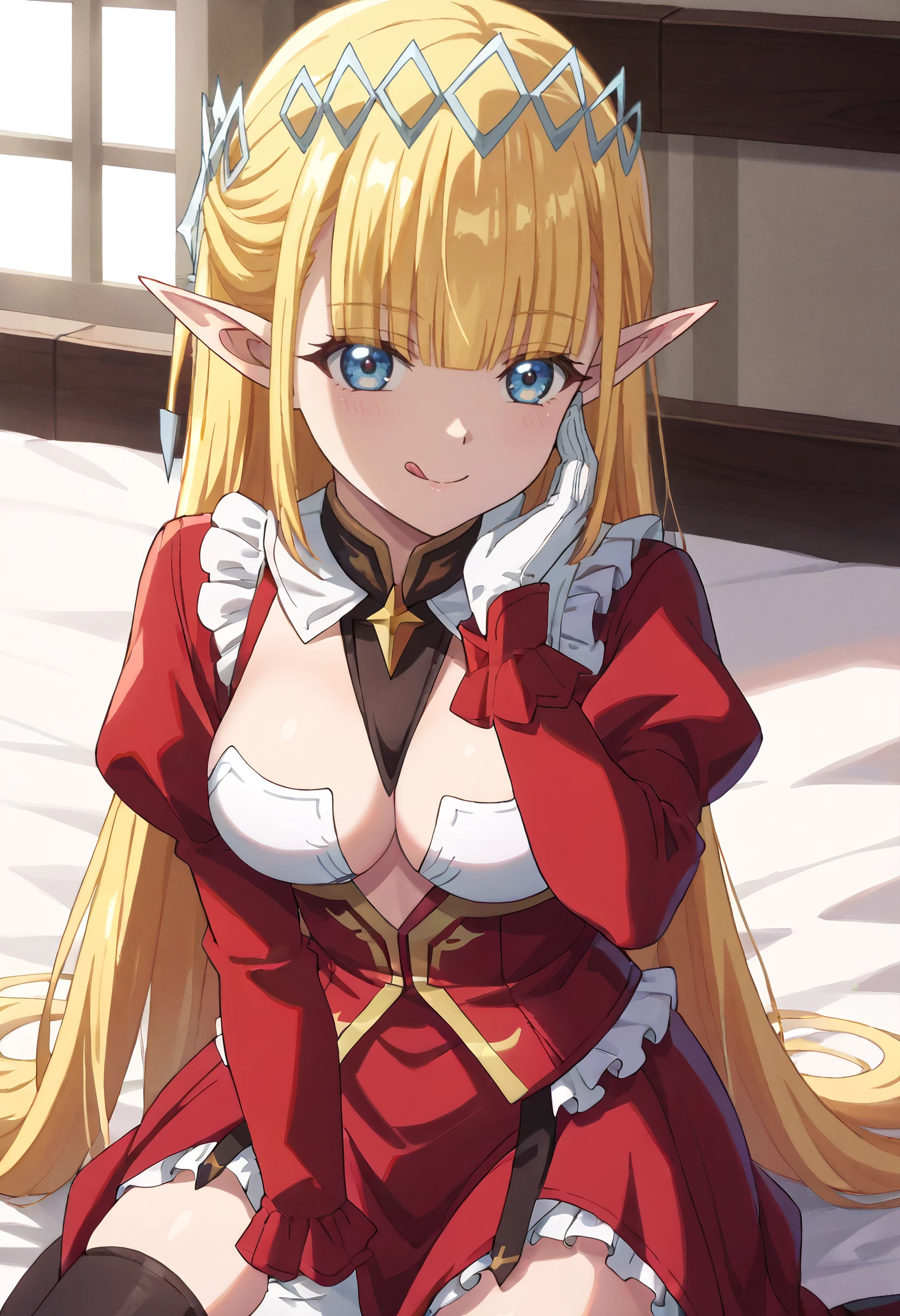 SerasDress, dress, puffy sleeves, frills, long sleeves, red dress, jewelry, cleavage, bow, hair ornament, gloves, ribbon, gem, white gloves, skirt, juliet sleeves, thighhighs, tiara, red skirt, black legwear, clothing cutout,