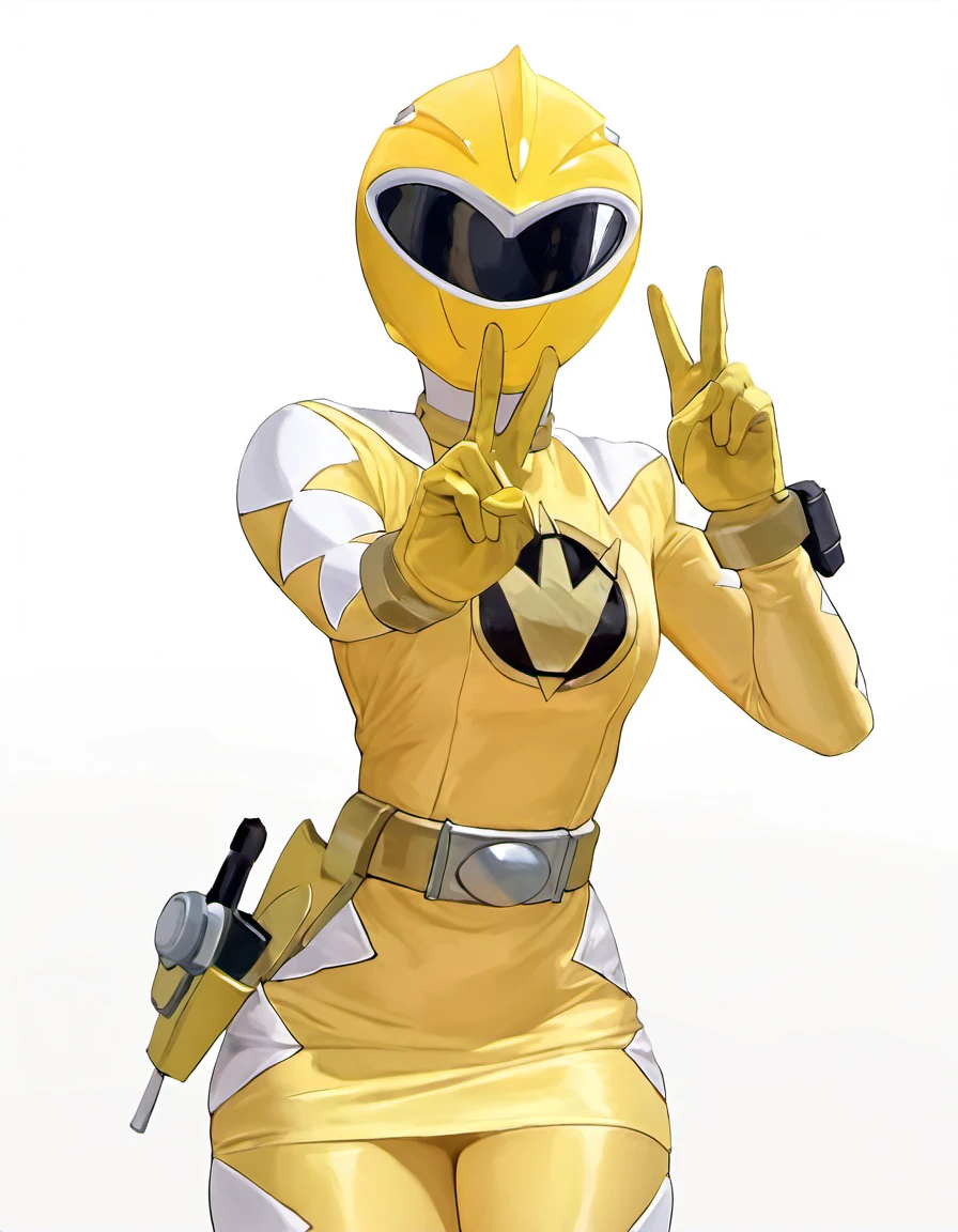 3.-Yellow dino ranger: Dinotyellow, robot, solo, DINYLOW helmet, DINYLOW bodysuit, breasts, yellow skirt, DINYLOW belt, DINYLOW gloves, DINYLOW boots