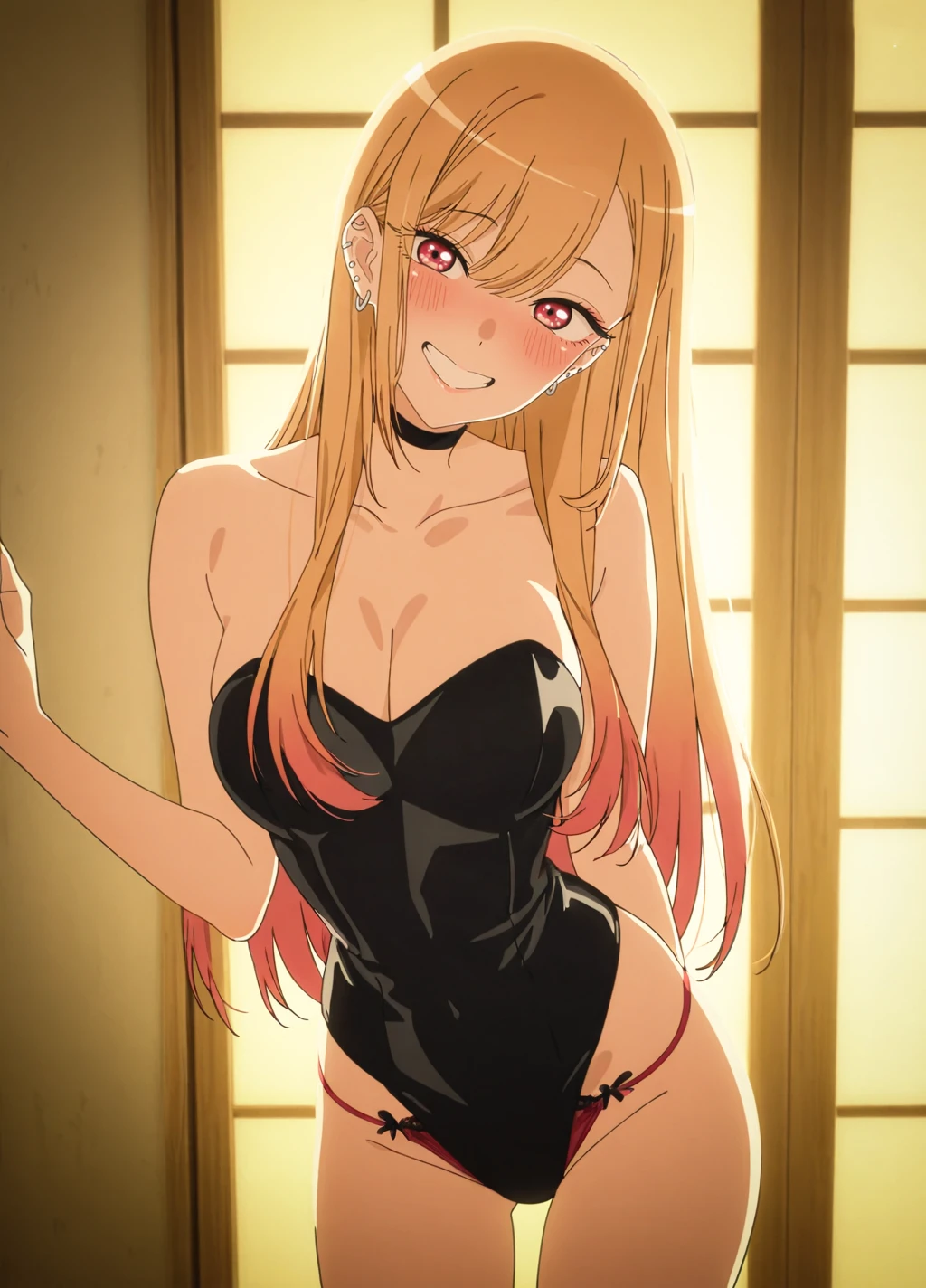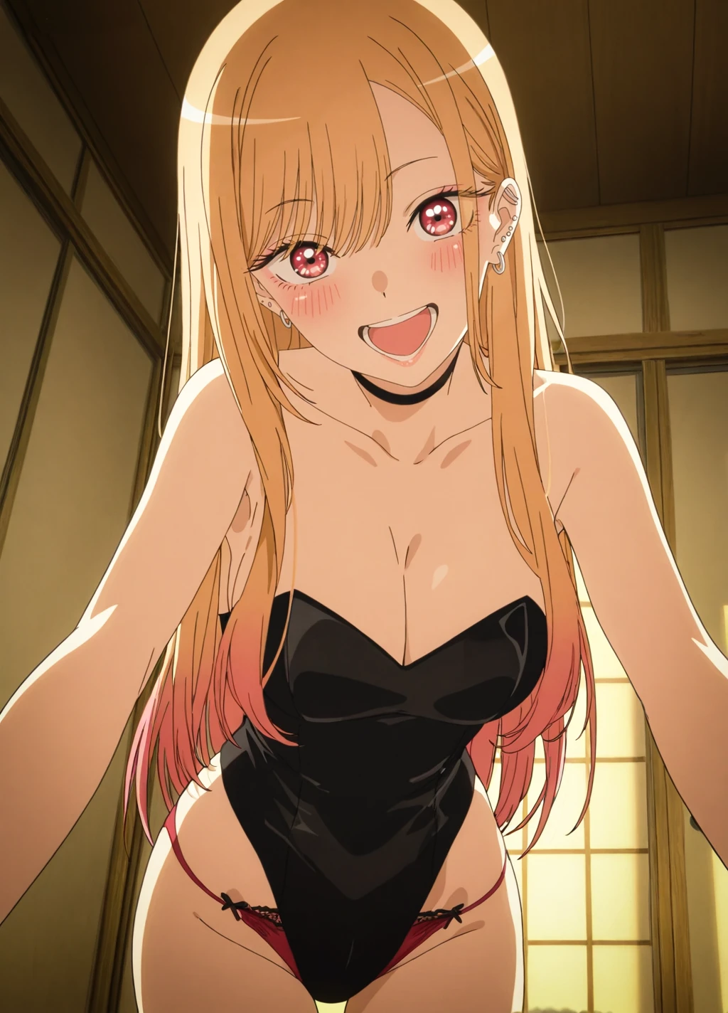 marinbu1, 1girl, kitagawa marin, solo, blonde hair, breasts, long hair, underwear, panties, cleavage, jewelry, earrings, red eyes, ear piercing, multicolored hair, piercing, cowboy shot, leotard, strapless, gradient hair, red panties, large breasts,