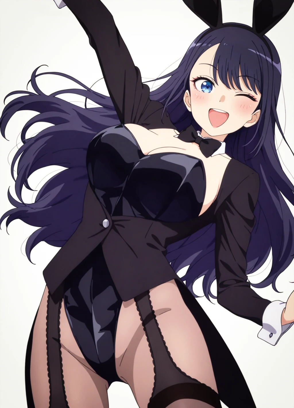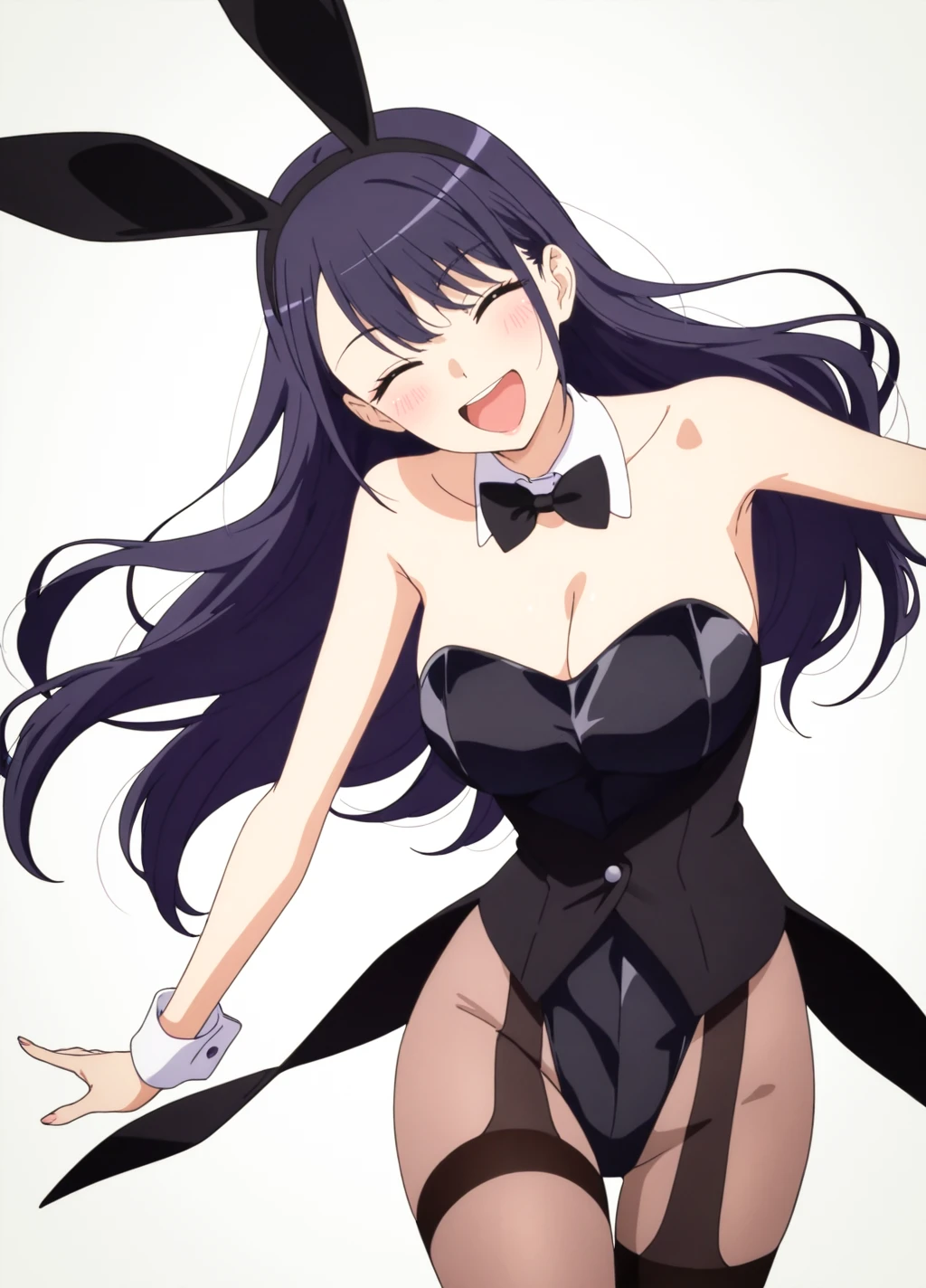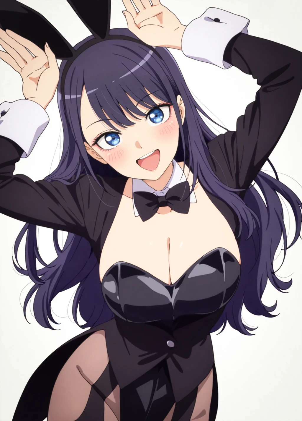 marinbu2, 1girl, animal ears, rabbit ears, solo, playboy bunny, breasts, long hair, pantyhose, bow, bowtie, fake animal ears, cleavage, leotard, black hair, detached collar, large breasts, thighhighs,long sleeves,blue eyes,