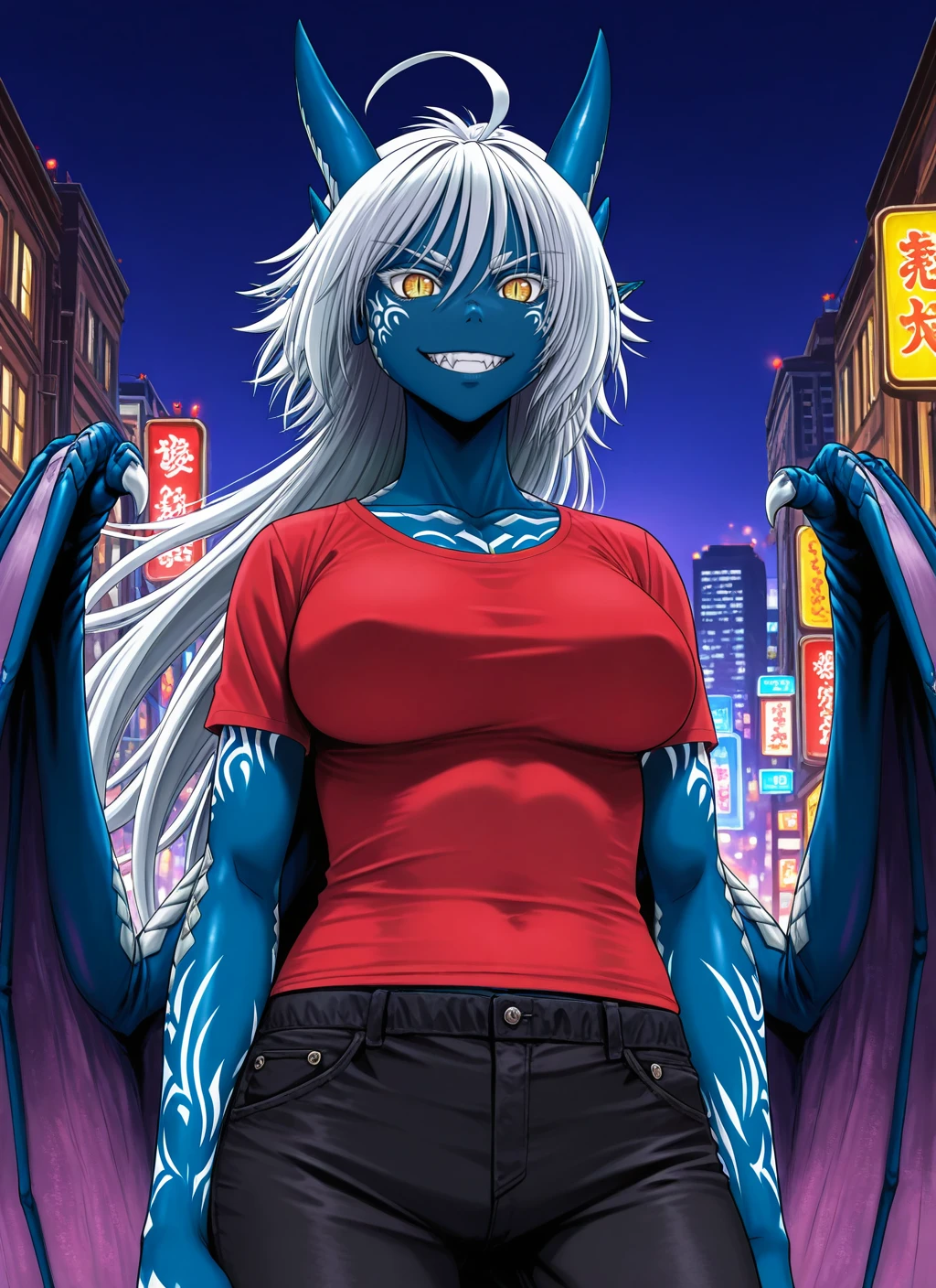 Giselle: gsll, monster girl, dragon girl, dragon wings, pointy ears, horns, blue skin, white tattoos, yellow eyes, slit pupils