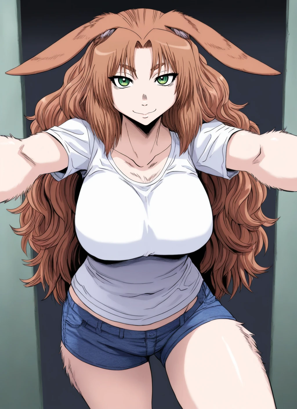 Delilah: deli, monster girl, rabbit girl, rabbit ears, green eyes, brown hair, long hair, wavy hair, brown fur