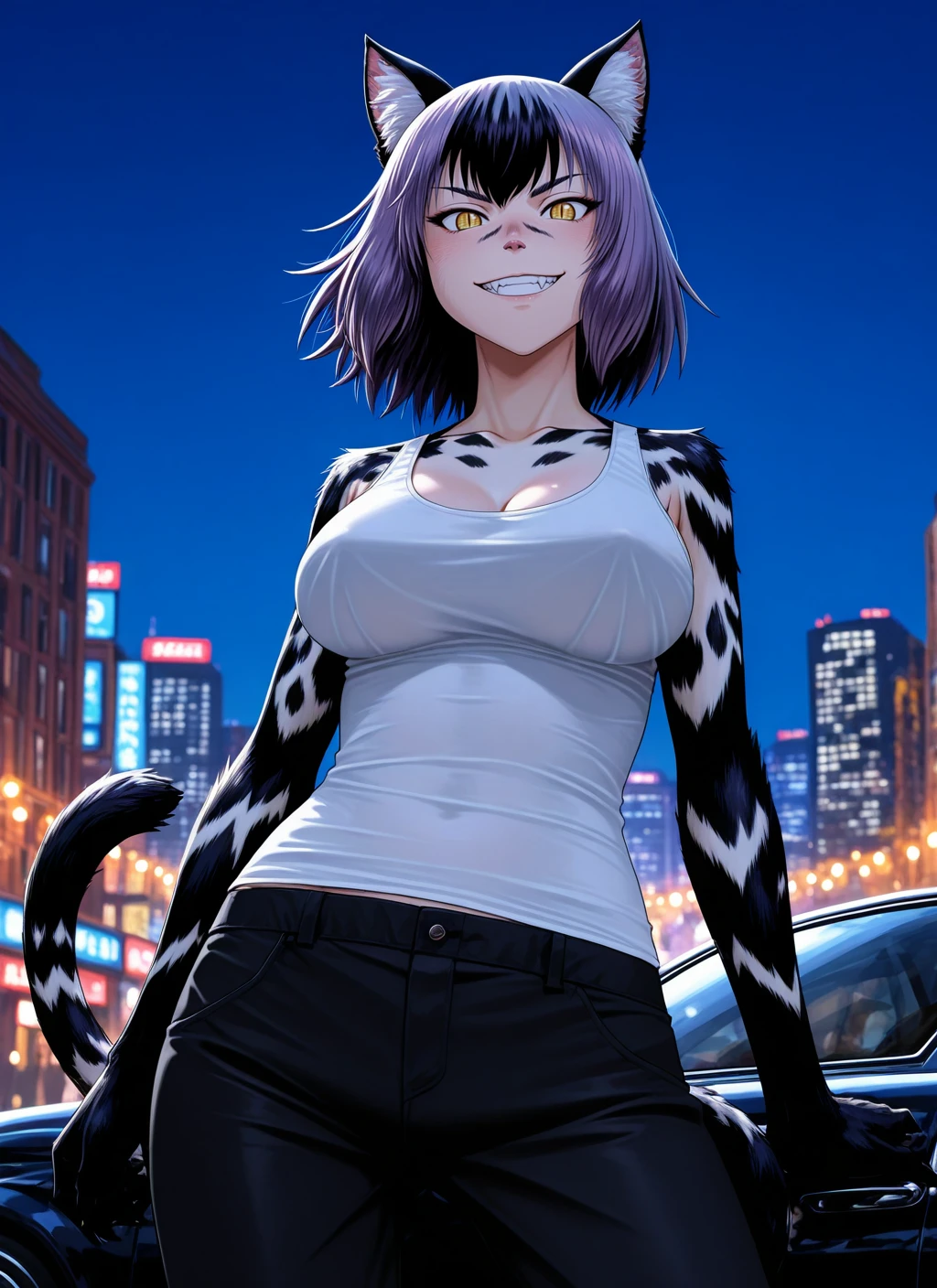 Persia: prsi, monster girl, cat girl, cat ears, cat tail, purple hair, yellow eyes, slit pupils, spotted fur, black fur, glasses