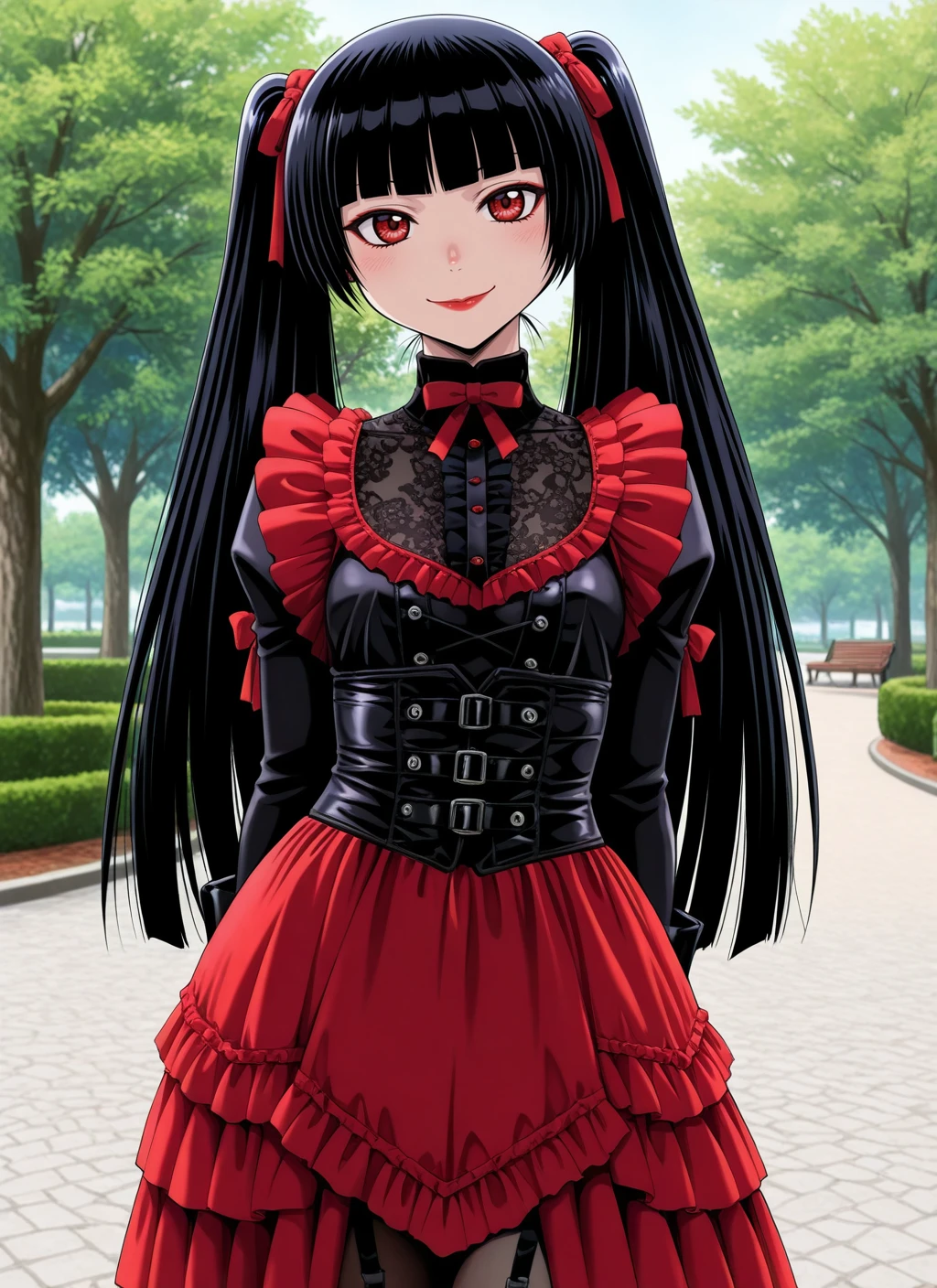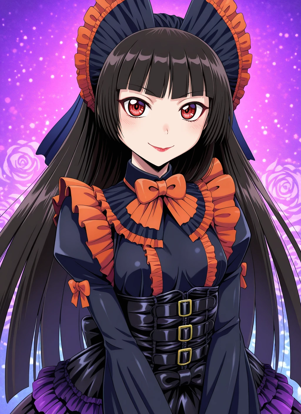 Rori: r0ri, red lips, red eyes, black hair long hair, goth outfit // goth outfit is optional