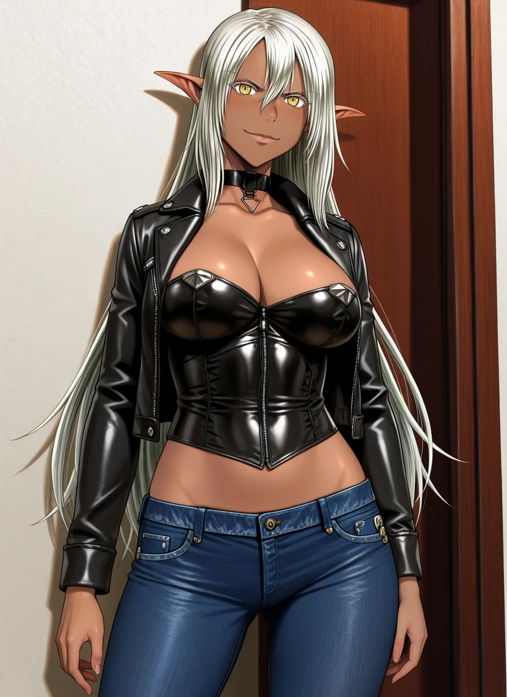 Ducy: ducy, dark elf, dark skin, pointy ears, yellow eyes, white hair, long hair