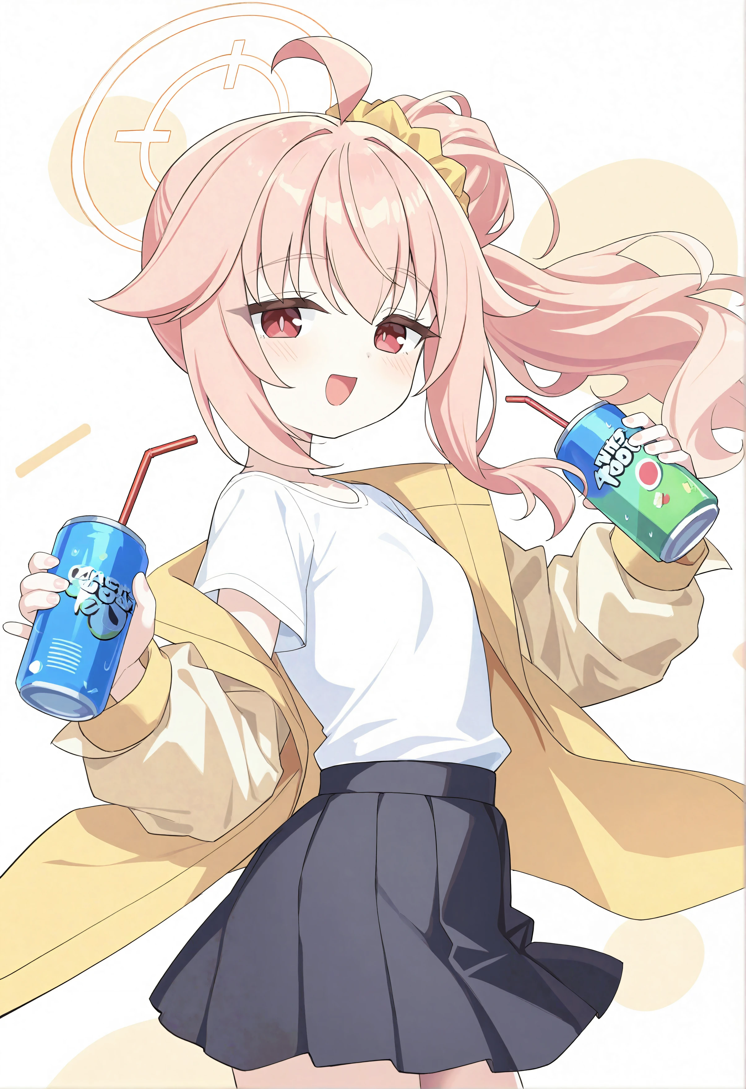 1girl,solo,natsu(blue_archive),natsu_(band)(blue_archive),blue_archive,from side,halo, side ponytail, pink hair, long sleeves, solo, red eyes, open mouth, smile, cup, white shirt, holding cup, black skirt, yellow jacket, looking at viewer, holding drink, drink, holding bottle, jacket, holding can, skirt, shirt tucked in, drinking straw, ahoge, long hair, holding,very awa,masterpiece,best quality,highres,absurdres,high detail, ultra-detailed