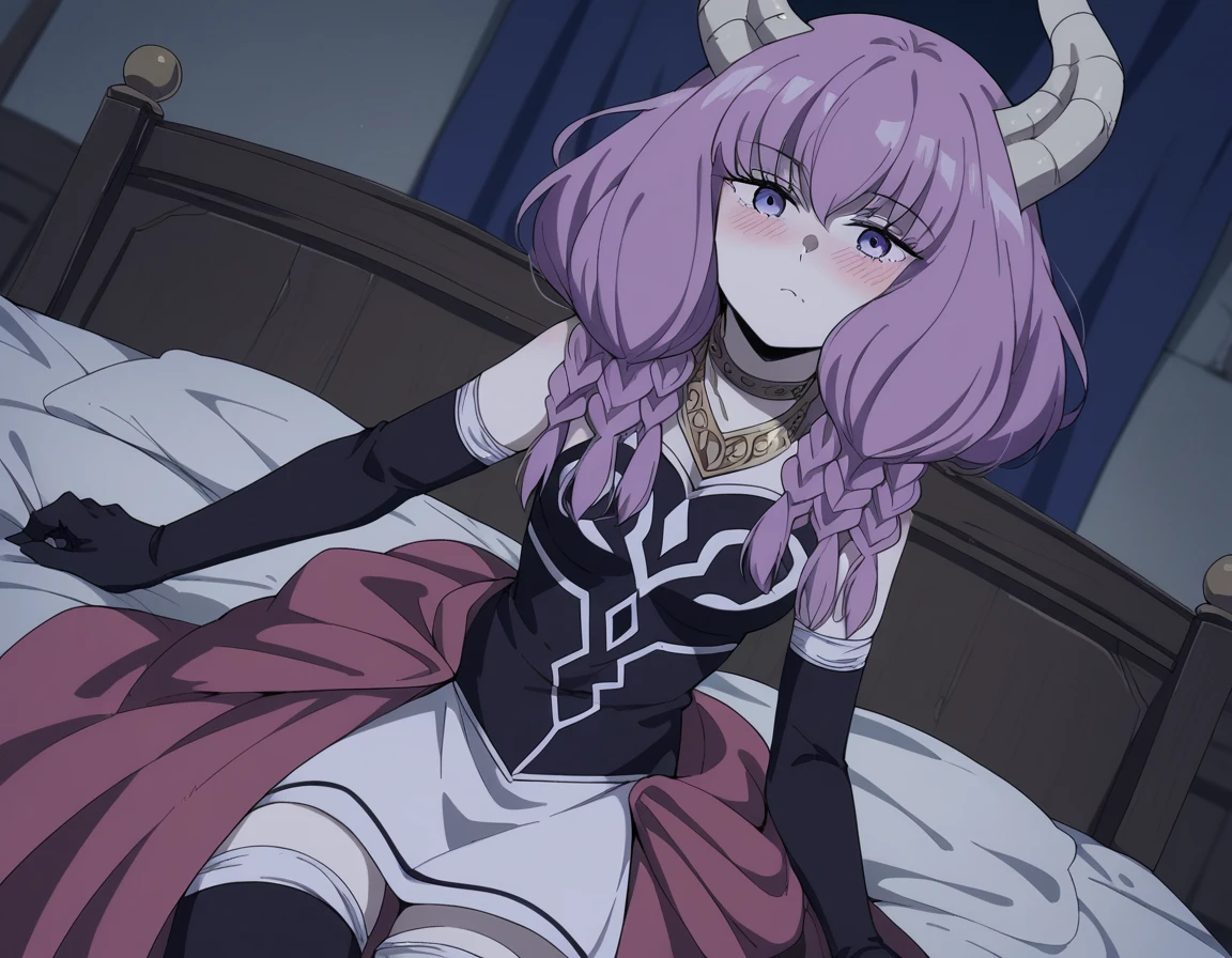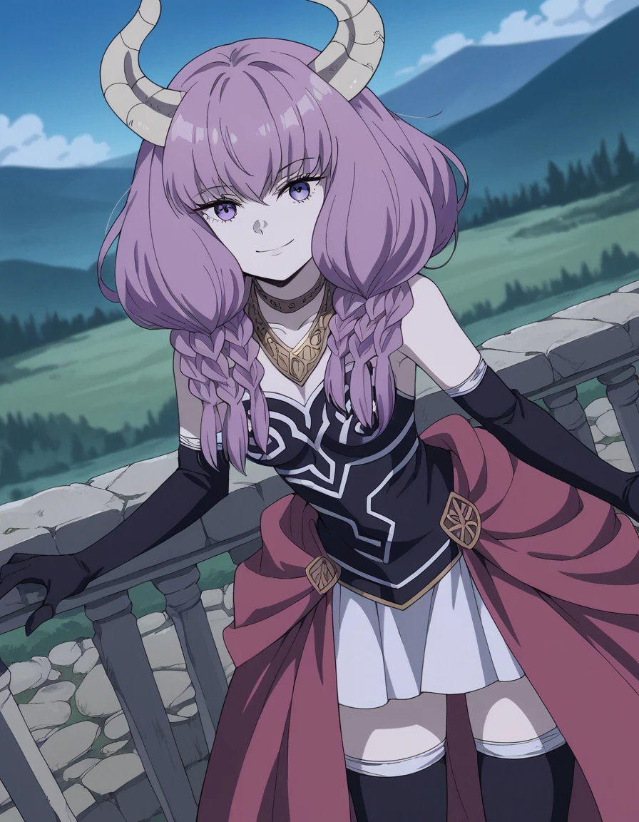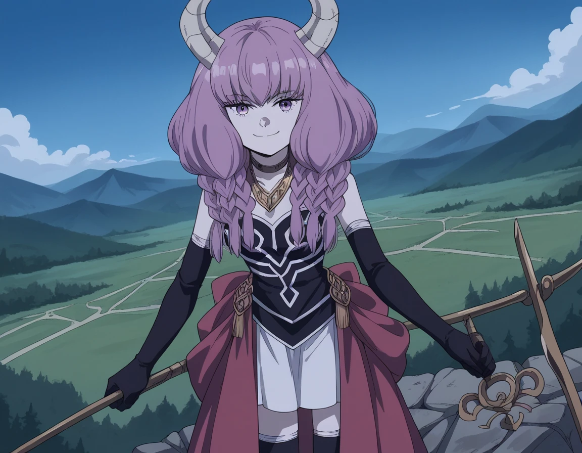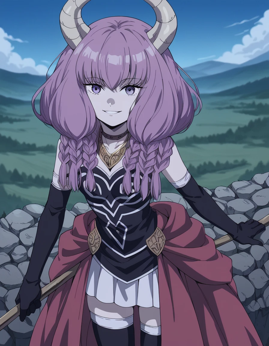 aura the guillotine, long hair, purple eyes, purple hair, braid, horns, twin braids,