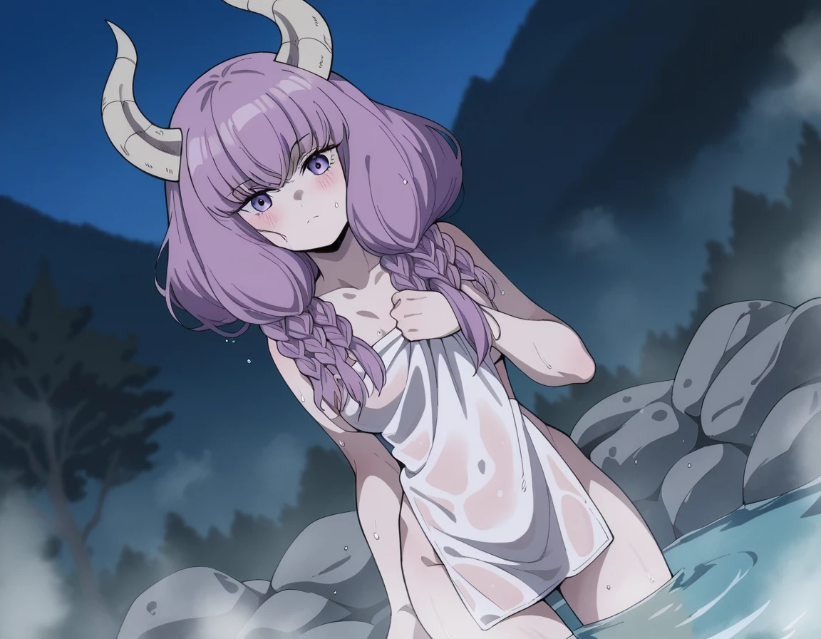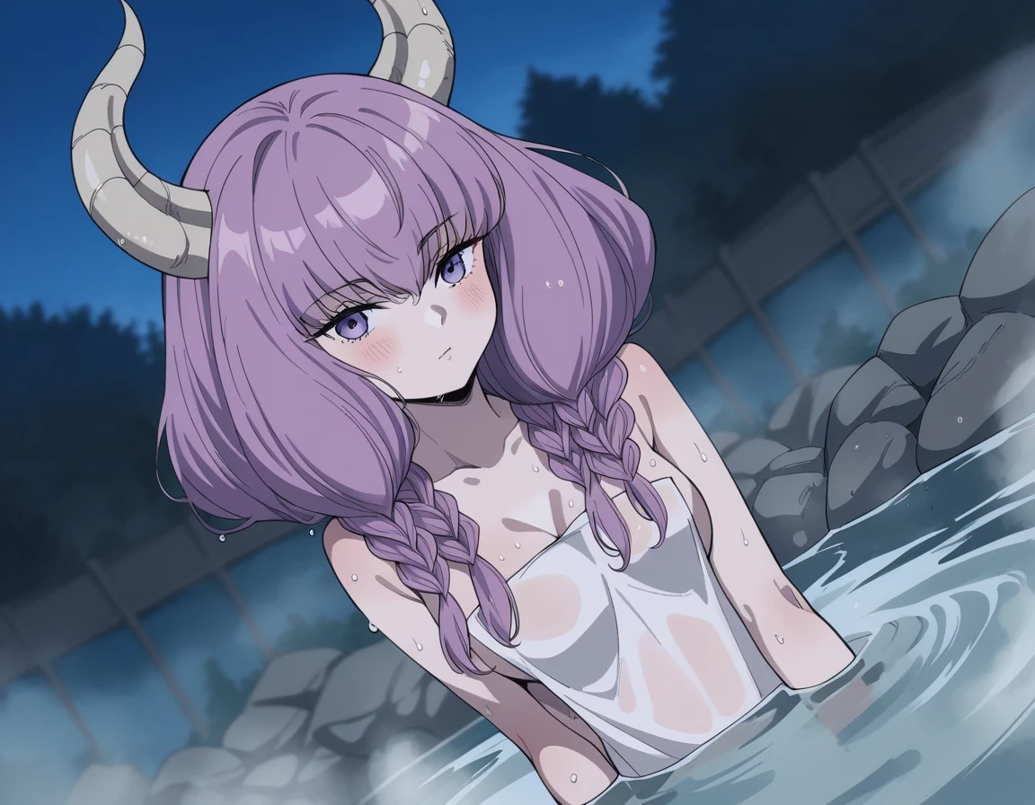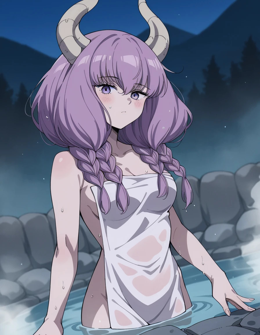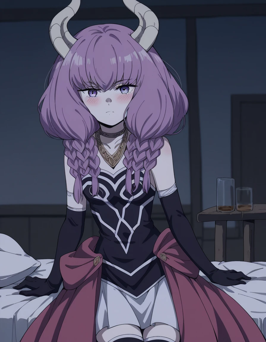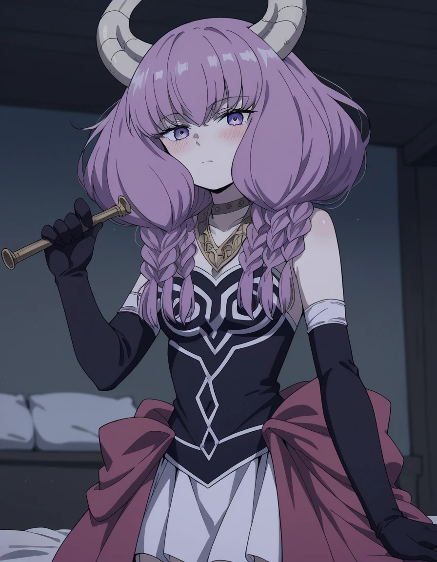 aura the guillotine, long hair, purple eyes, purple hair, braid, horns, twin braids,