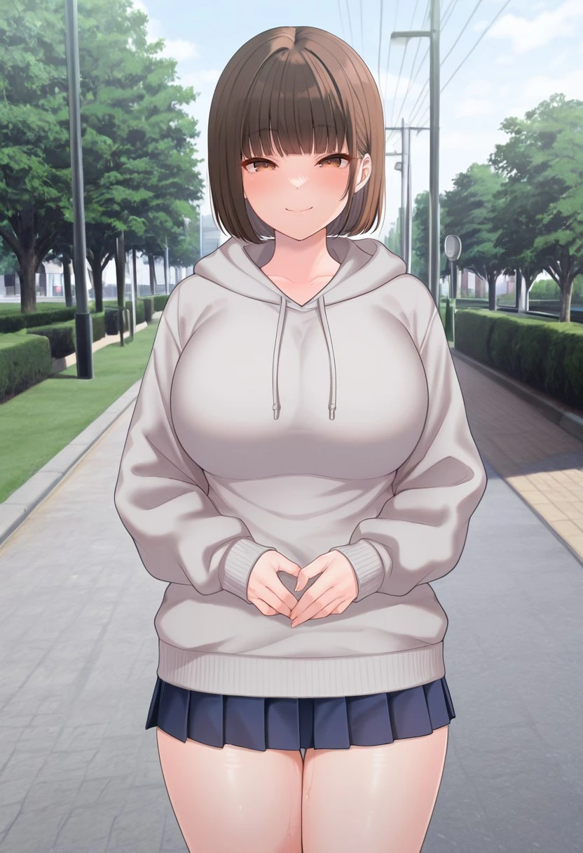 brown hair, short hair, large breasts, bangs, brown eyes,
