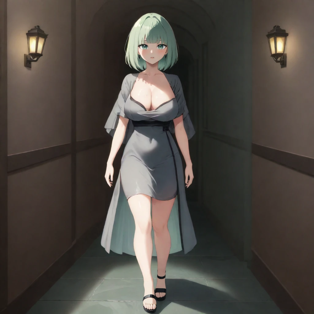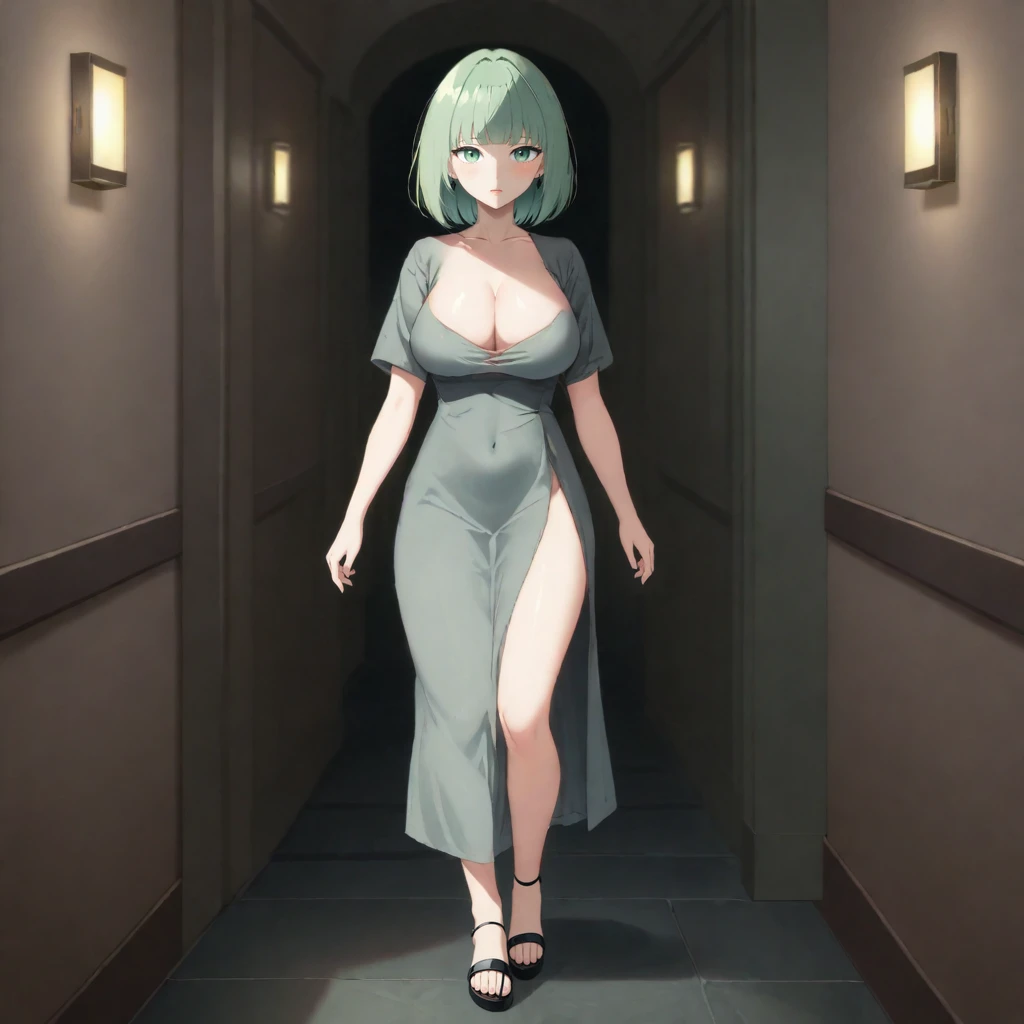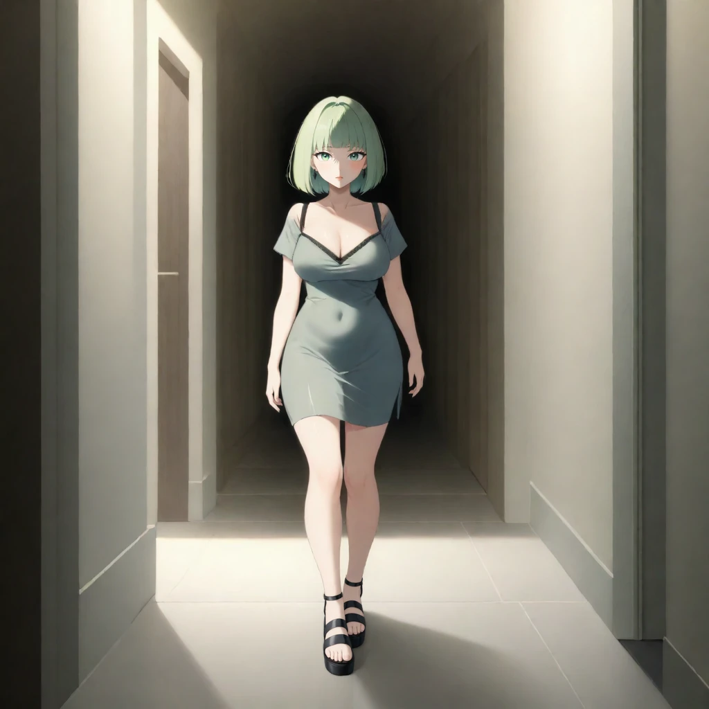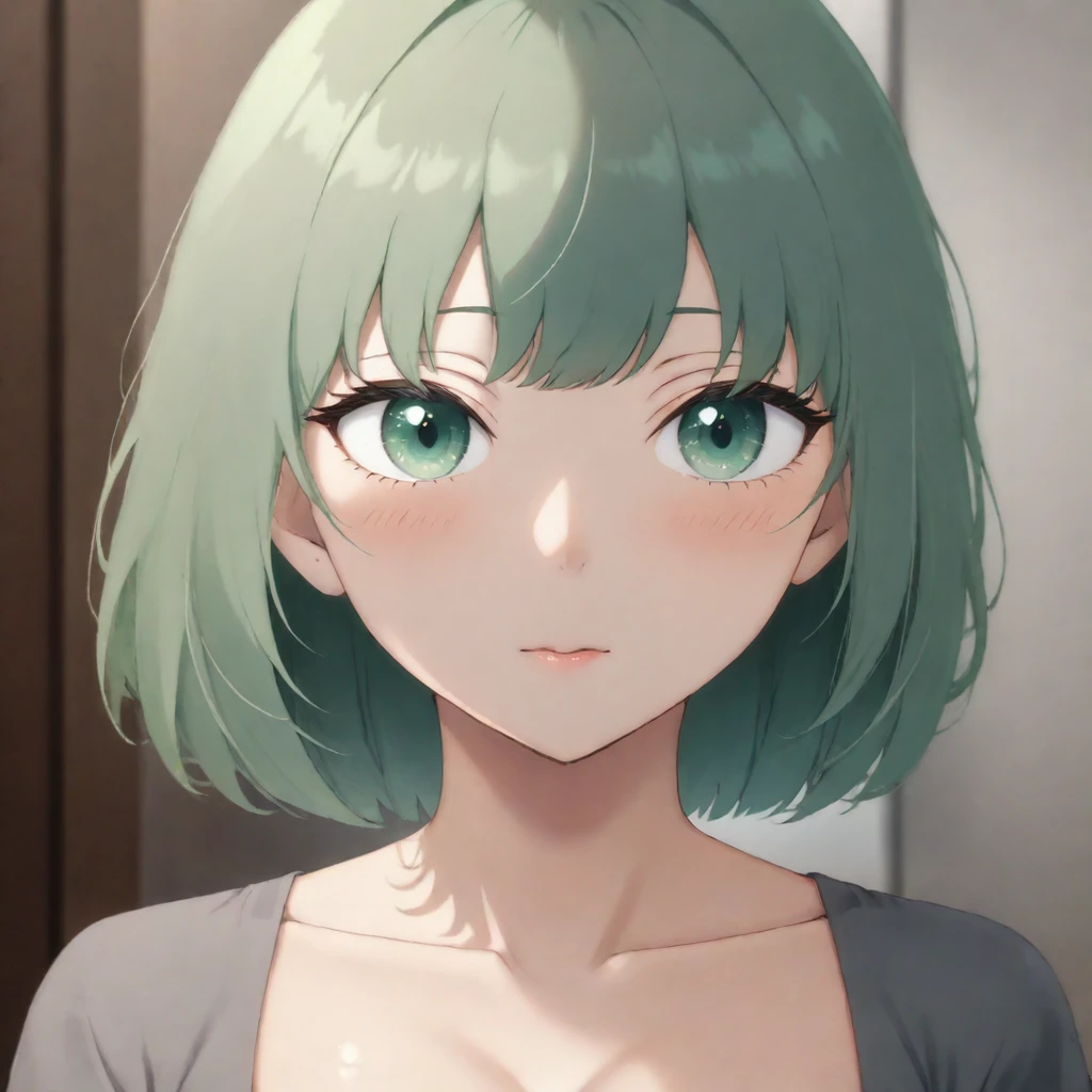 "Kawakami Sadayo, short messy hair, yellow striped shirt, jean skirt"
