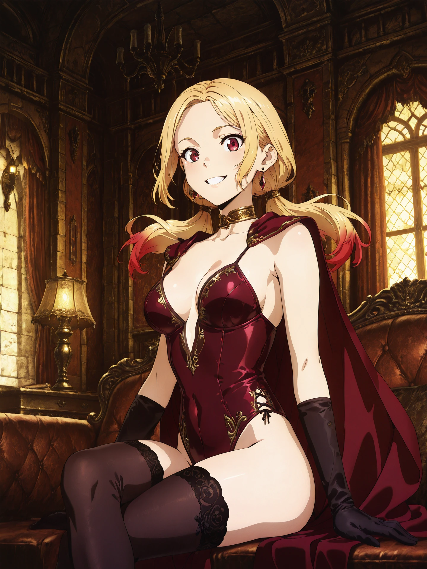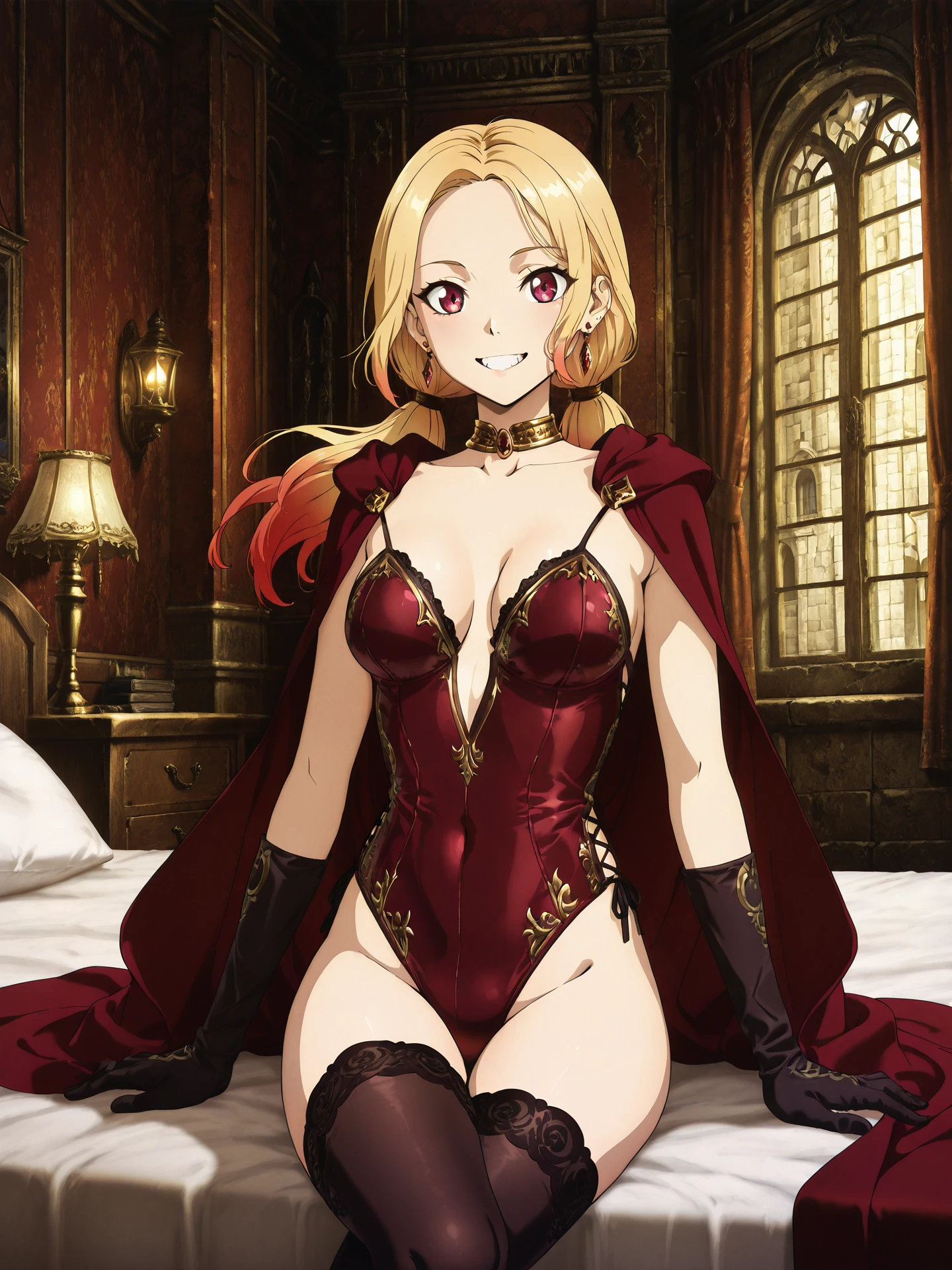 lilith_dd2, blonde hair, blonde hair with red tips, colored tips, long hair, low twintails, sidelocks, earrings, jewelry, medium breasts