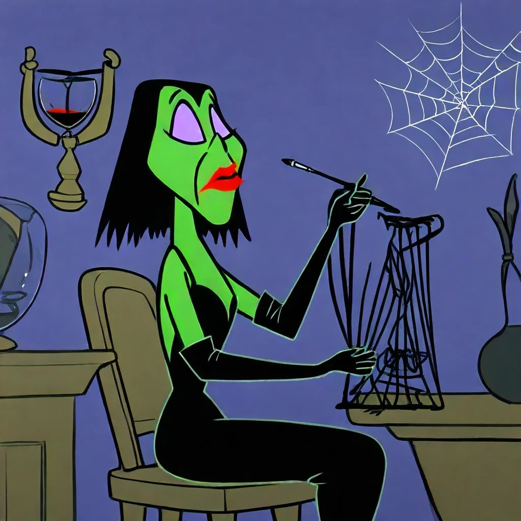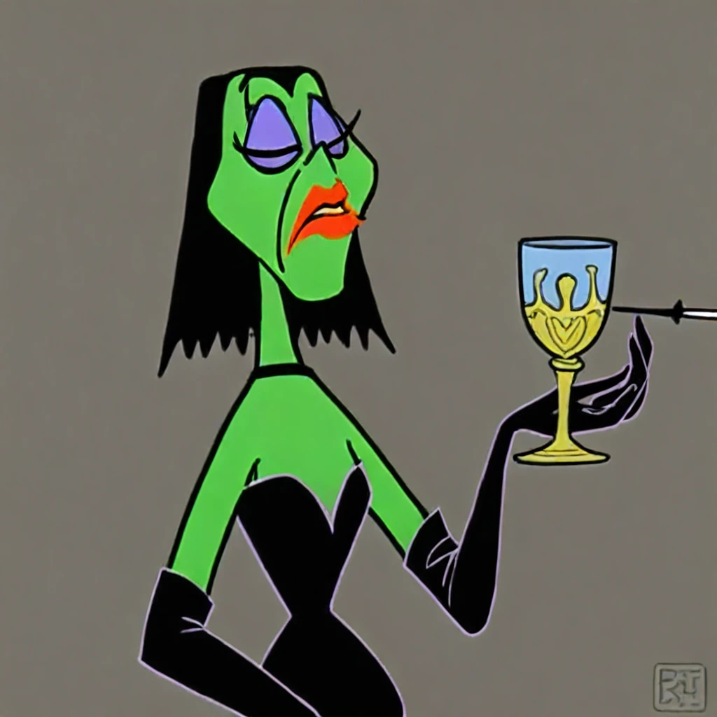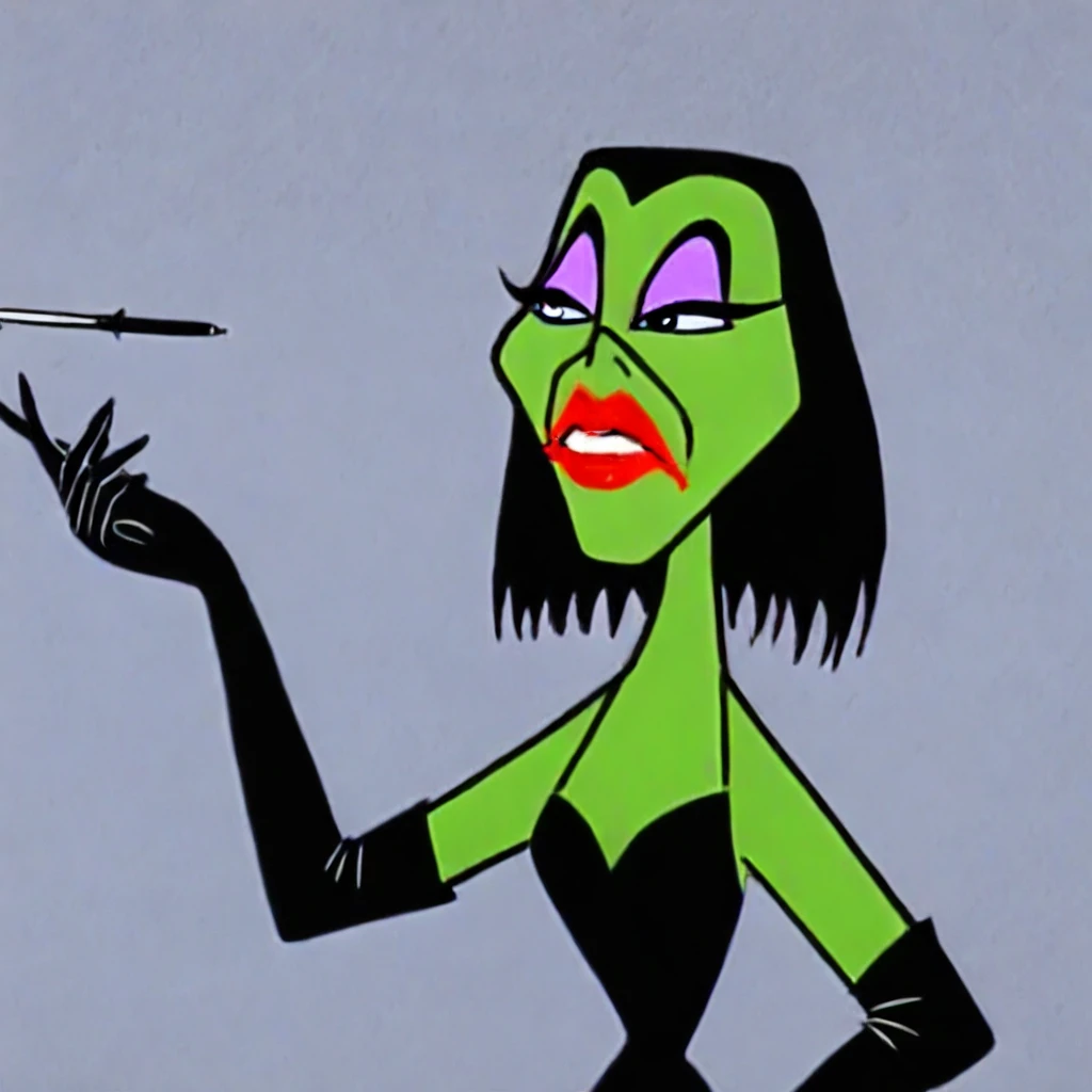 Goonda, green skin, black hair, long hair, makeup, lipstick, black dress, choker, elbow gloves