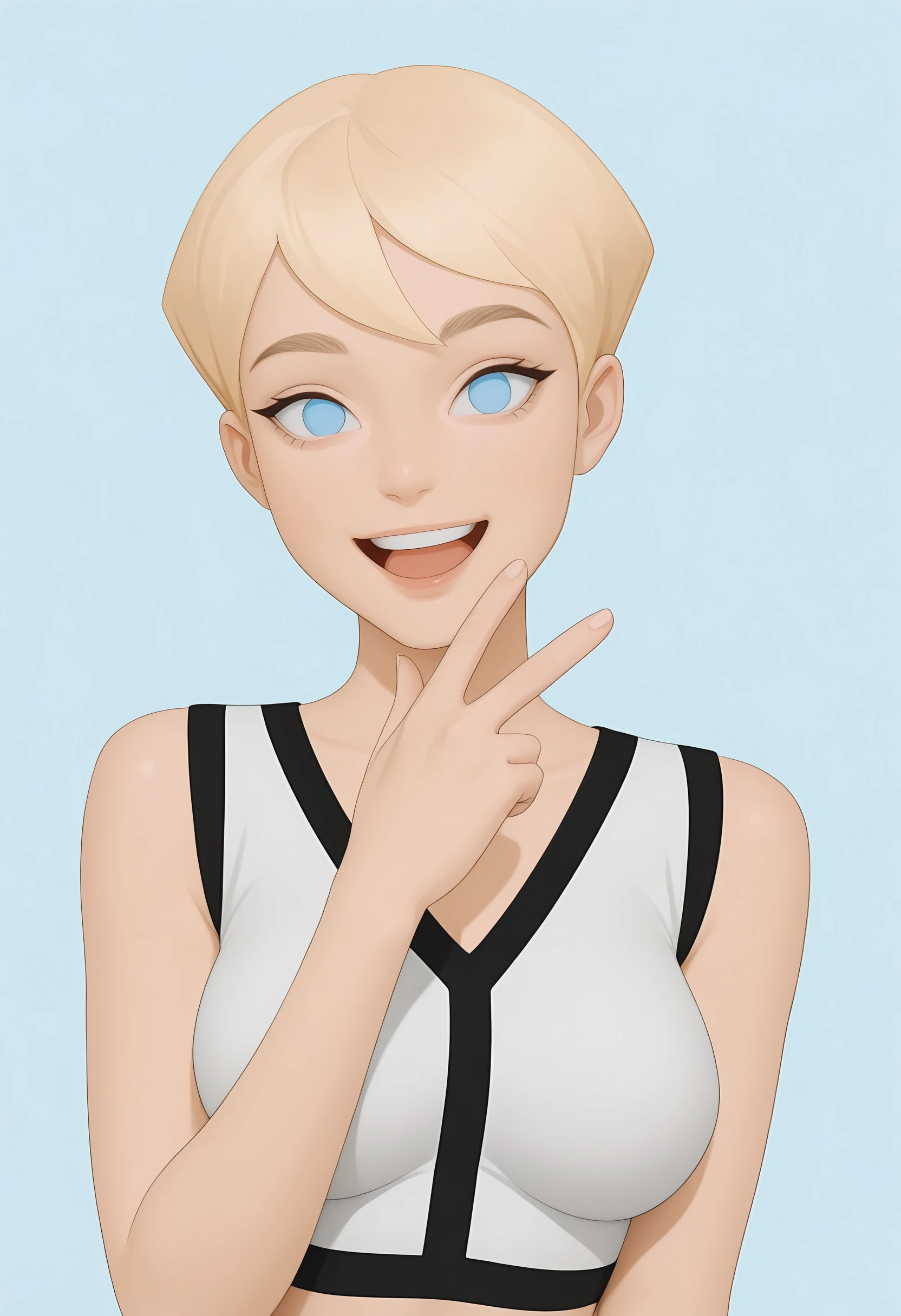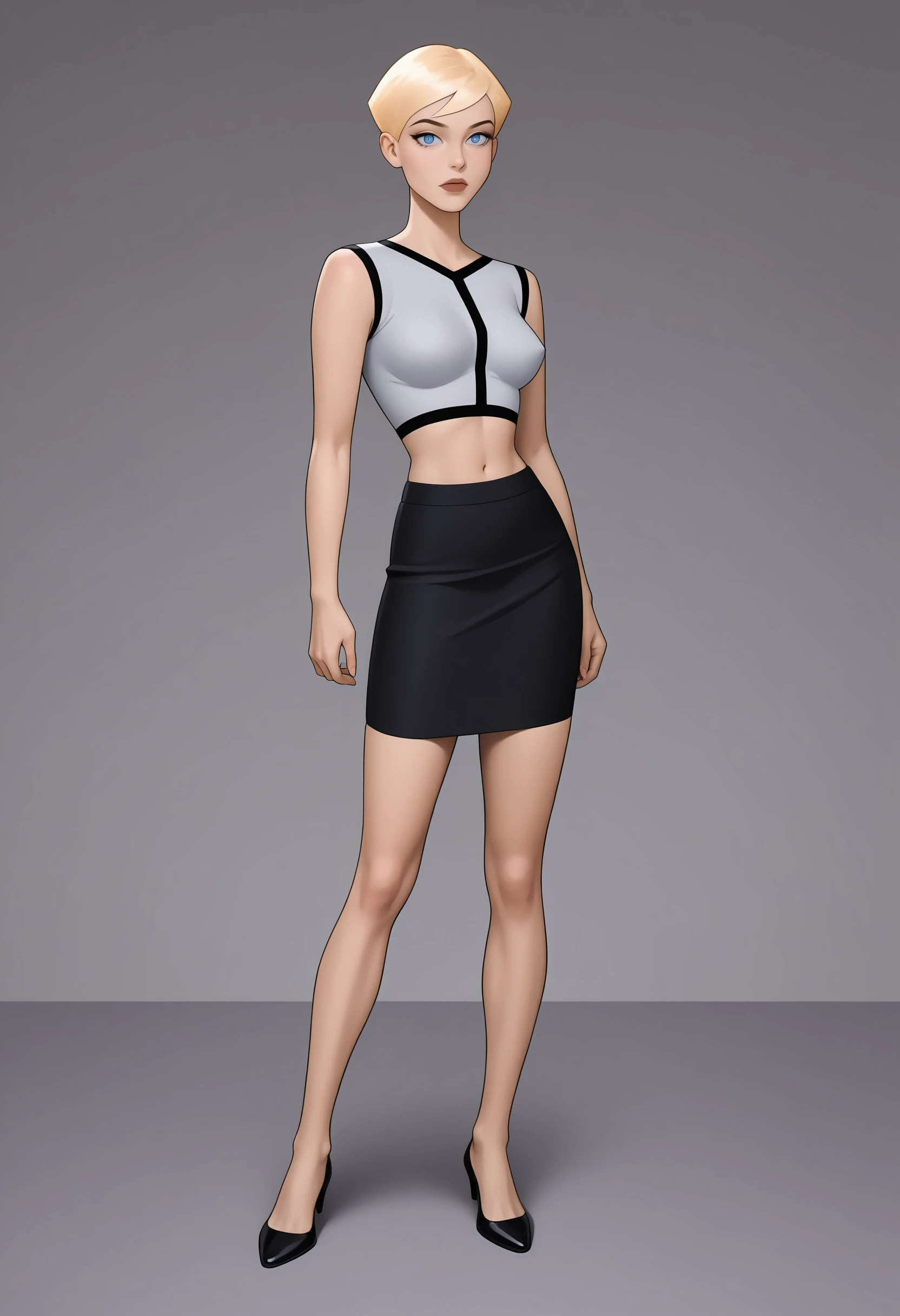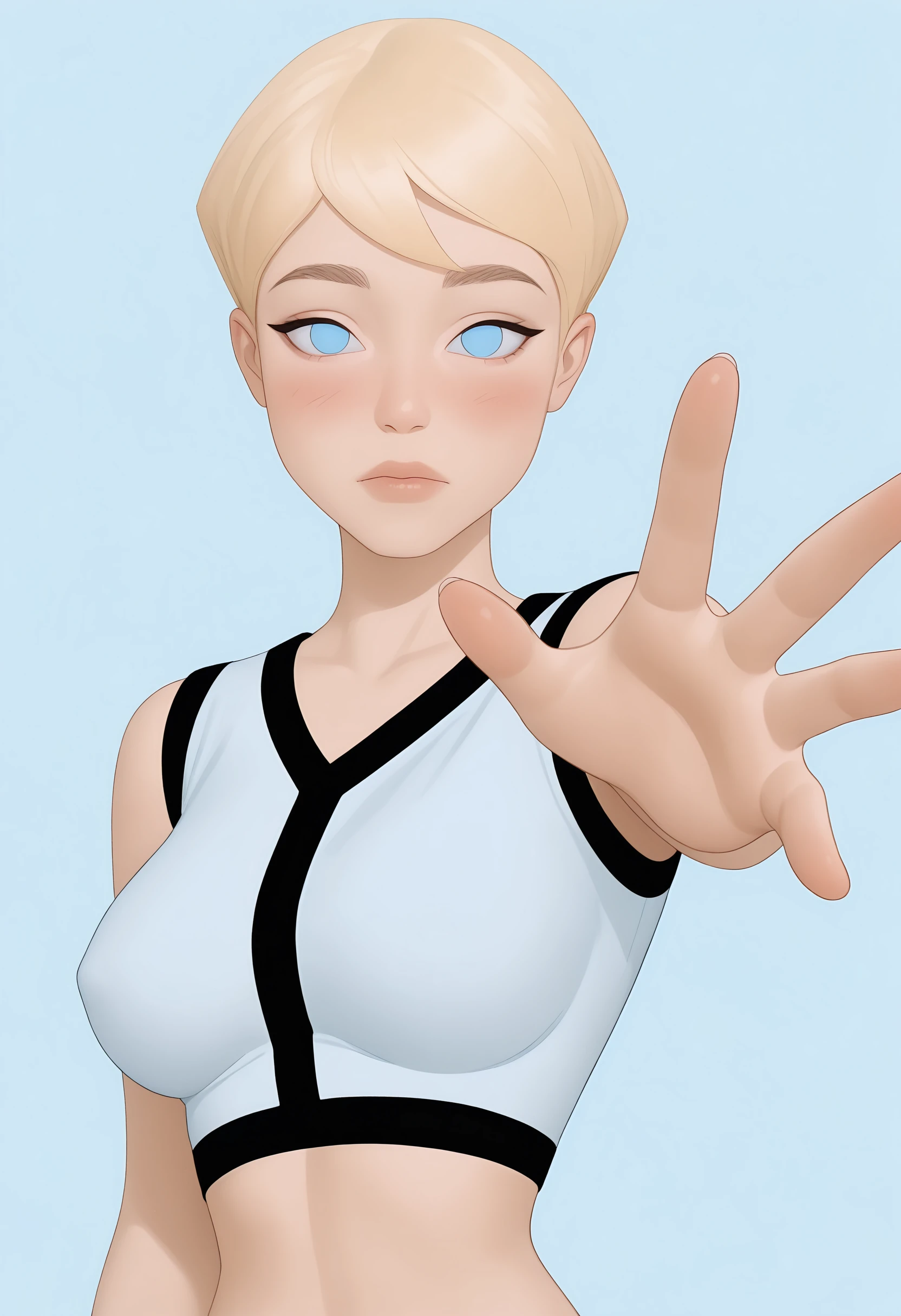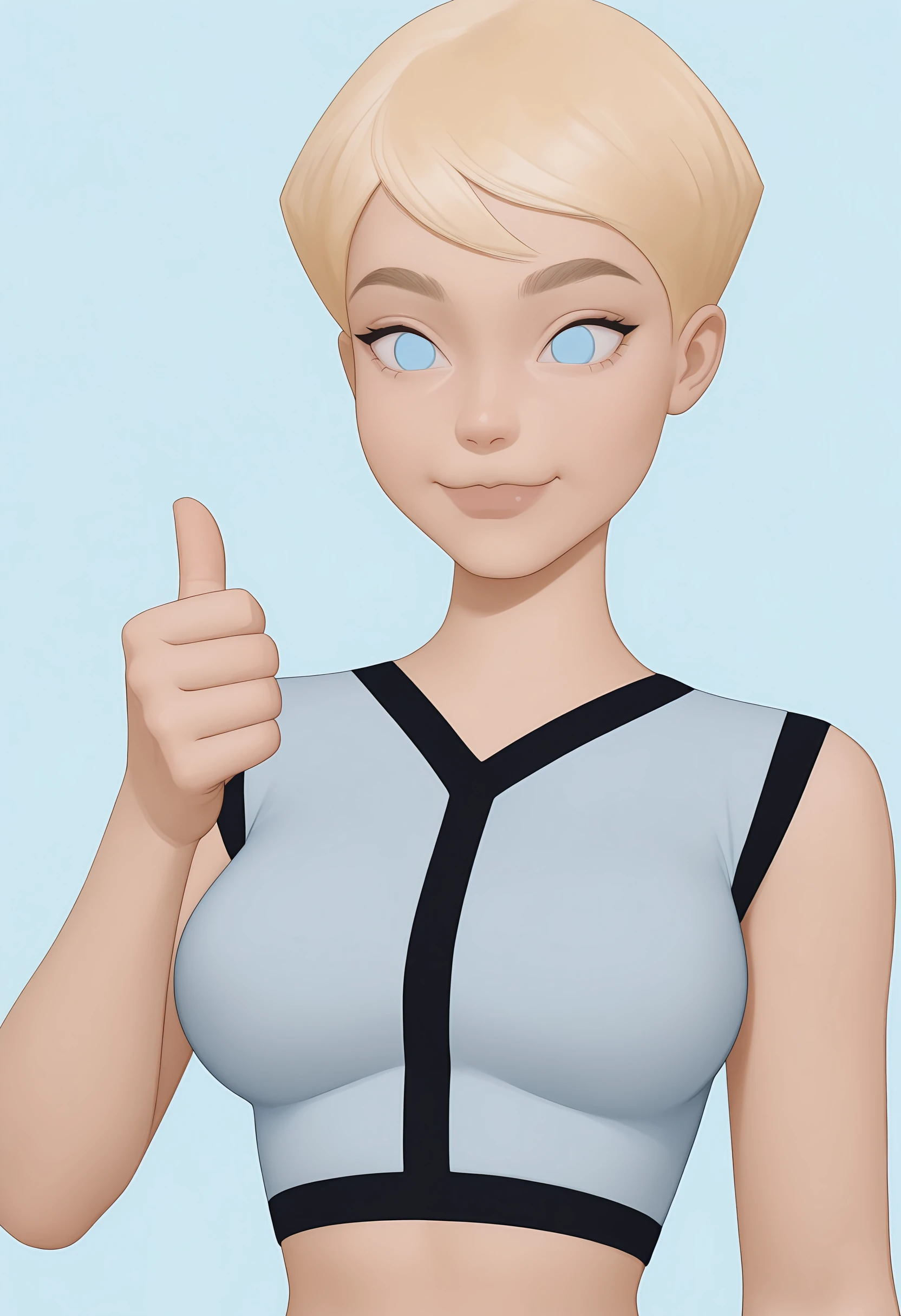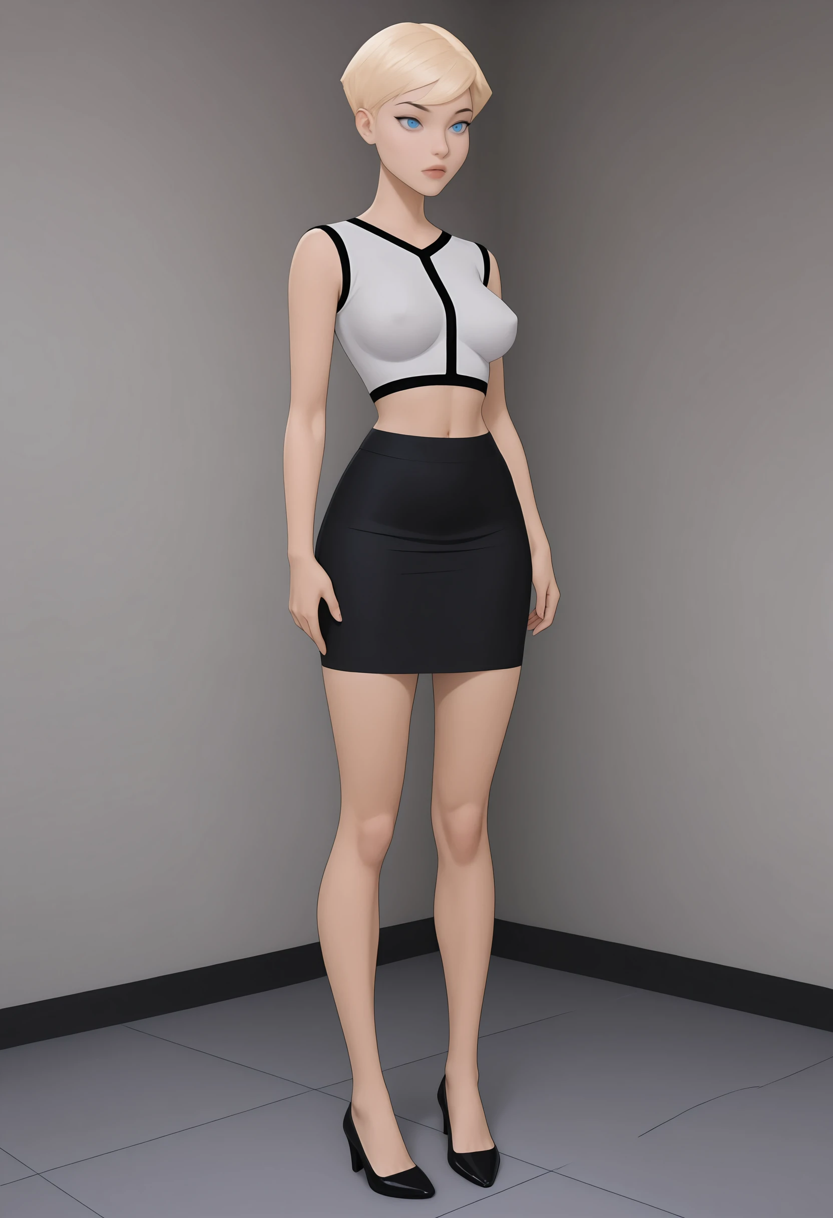 • ch3ilf, 1girl, blonde hair, short hair, blue eyes, sleeveless, crop top, breasts, skirt