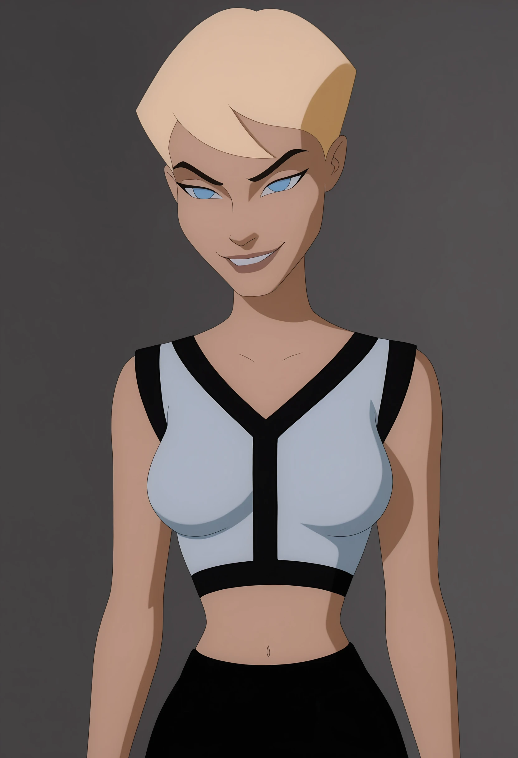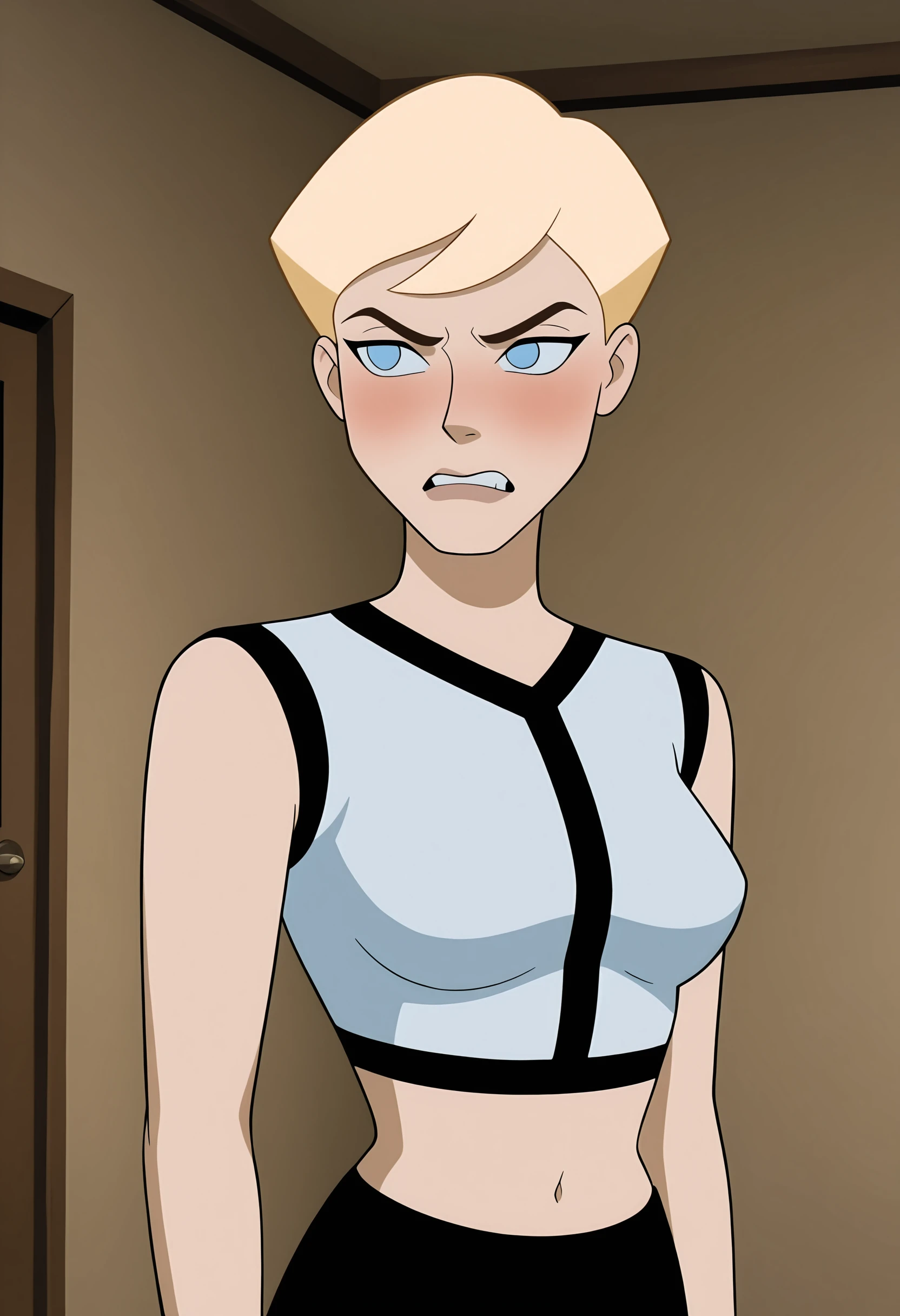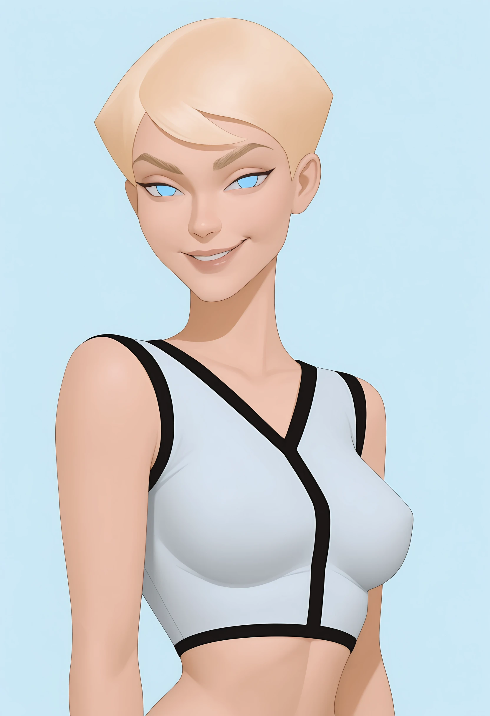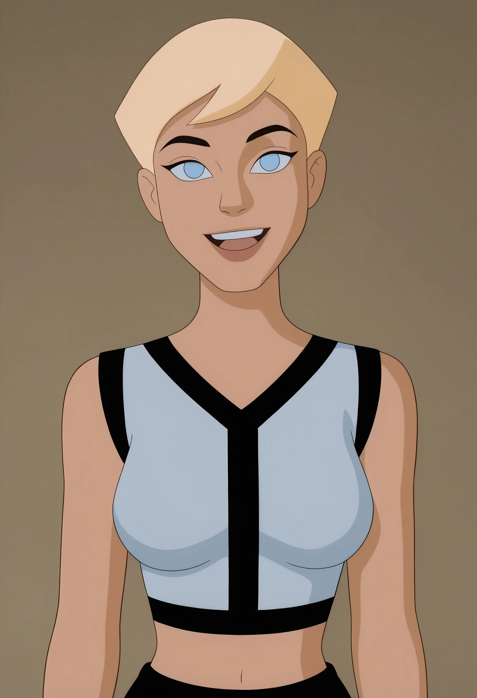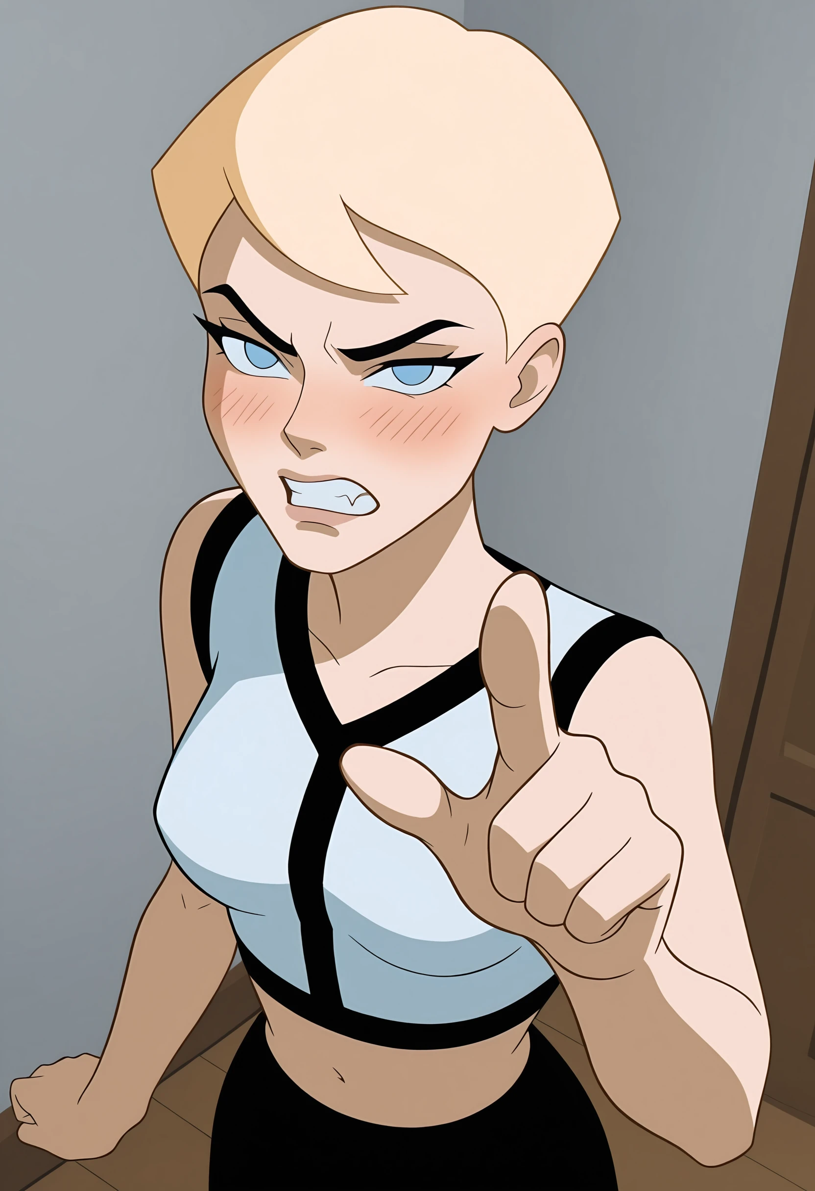 • ch3ilf, 1girl, blonde hair, short hair, blue eyes, sleeveless, crop top, breasts, skirt