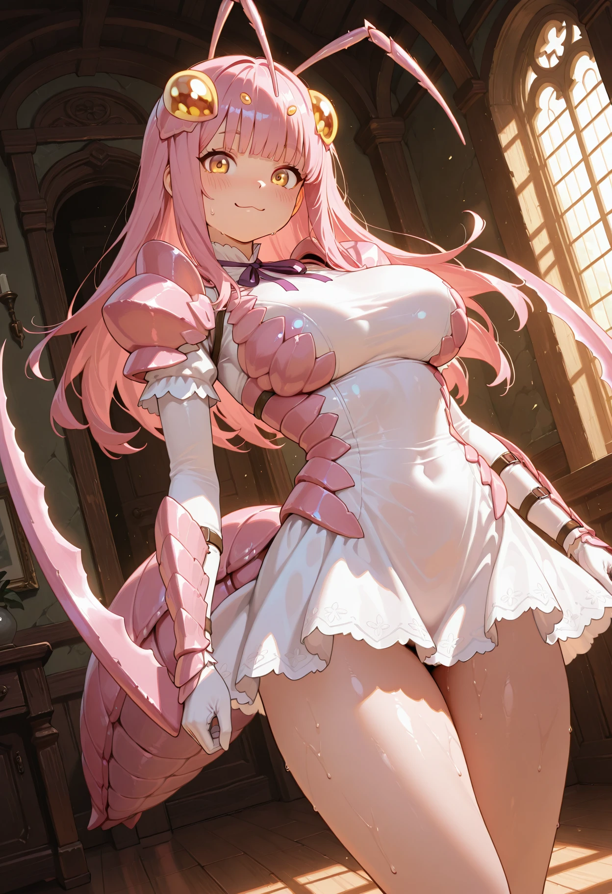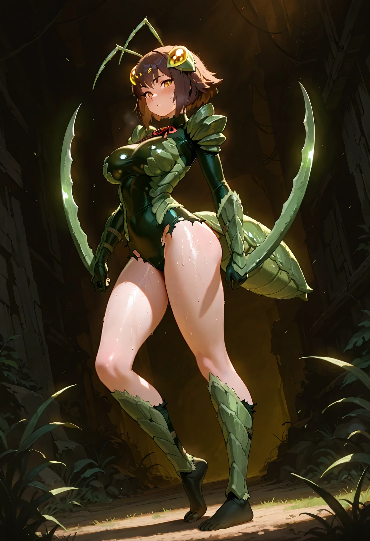 mantismge, brown hair, short hair, bangs, yellow eyes, large breasts🛡️ Insect Armor & Clothes: