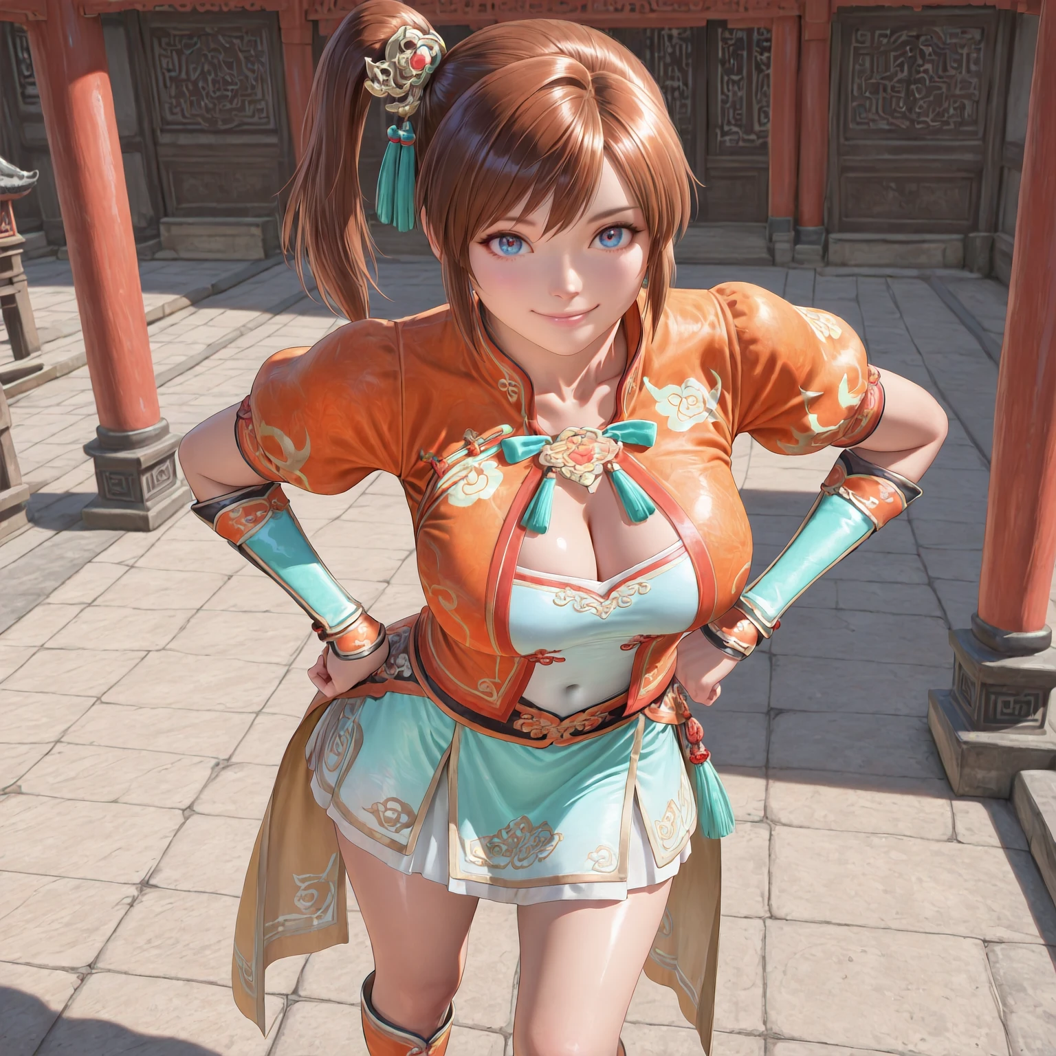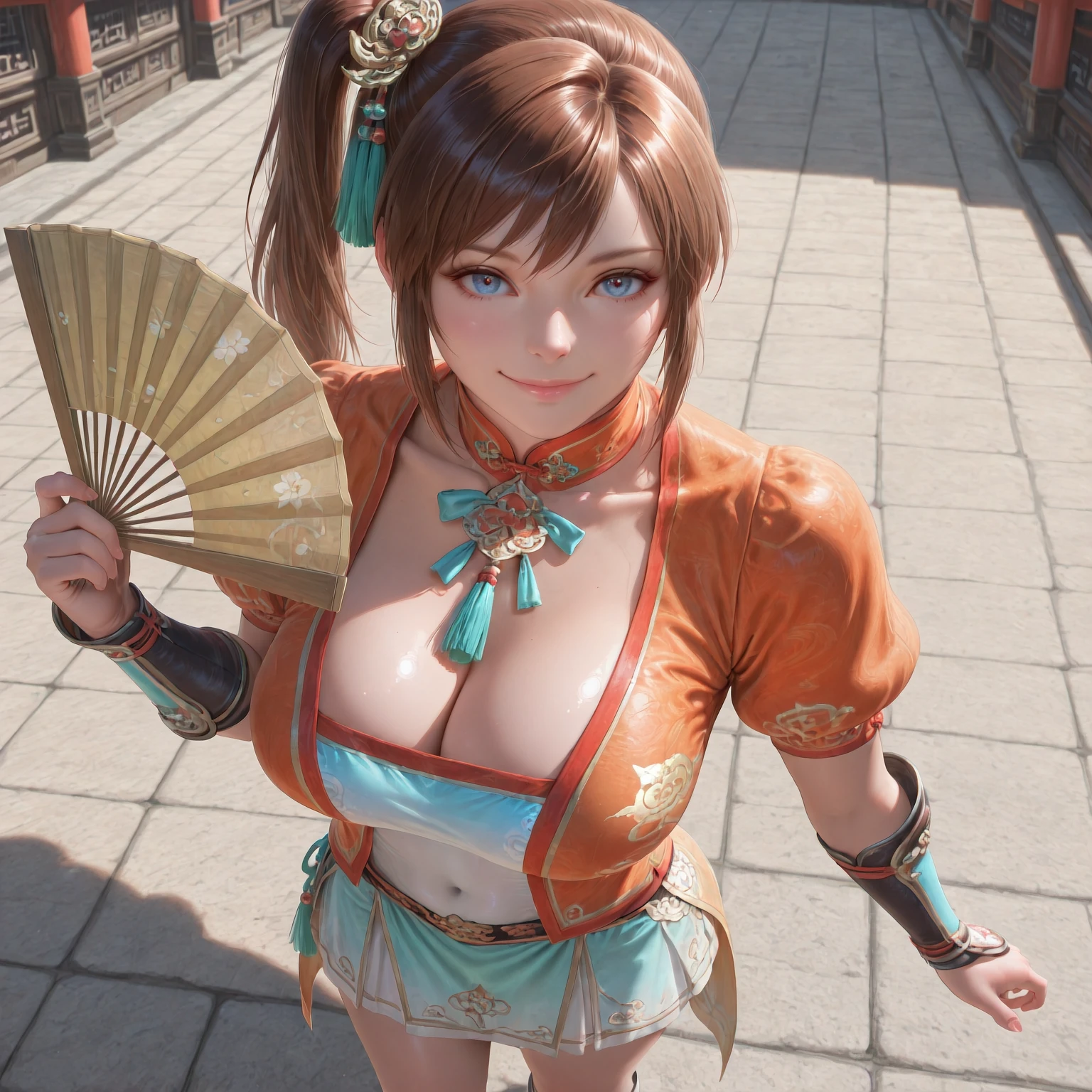 XiaoQiao,1girl,solo,hand fan,brown hair,ponytail,folding fan,boots,skirt,puffy sleeves,holding,knee boots,vambraces,blue eyes,short sleeves,chinese clothes,