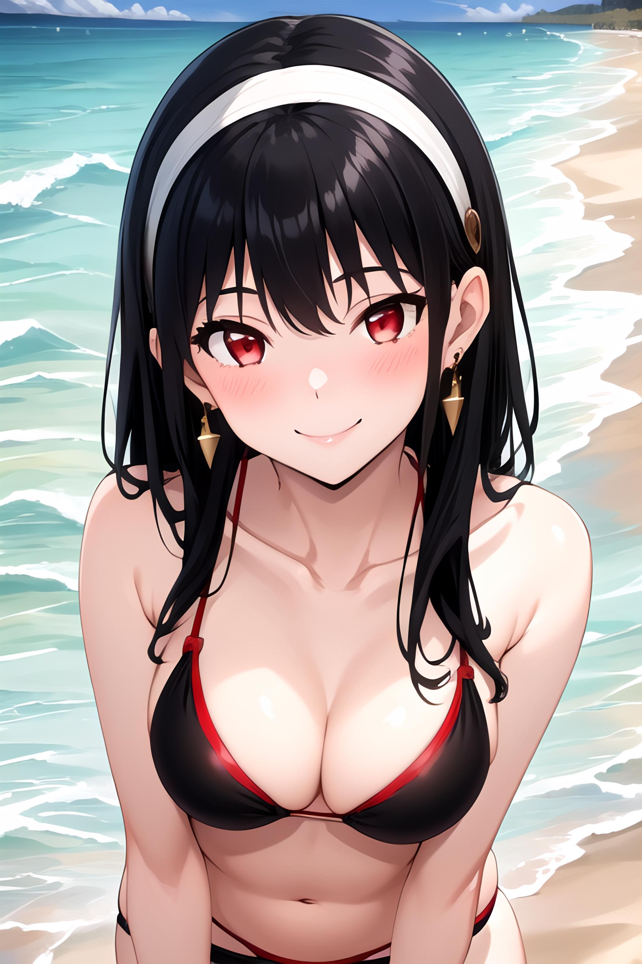 But you can also add: 1girl, red_eyes, hairband,black_hair, large_breasts or red_sweater