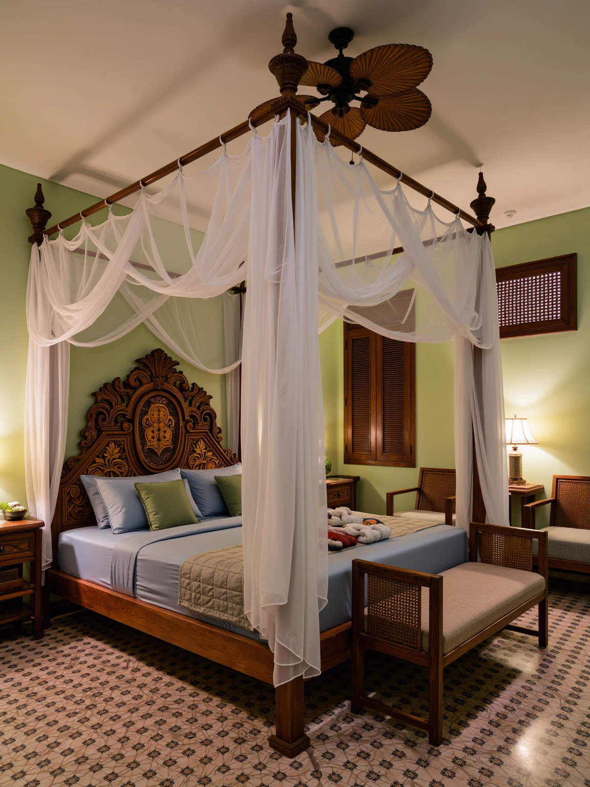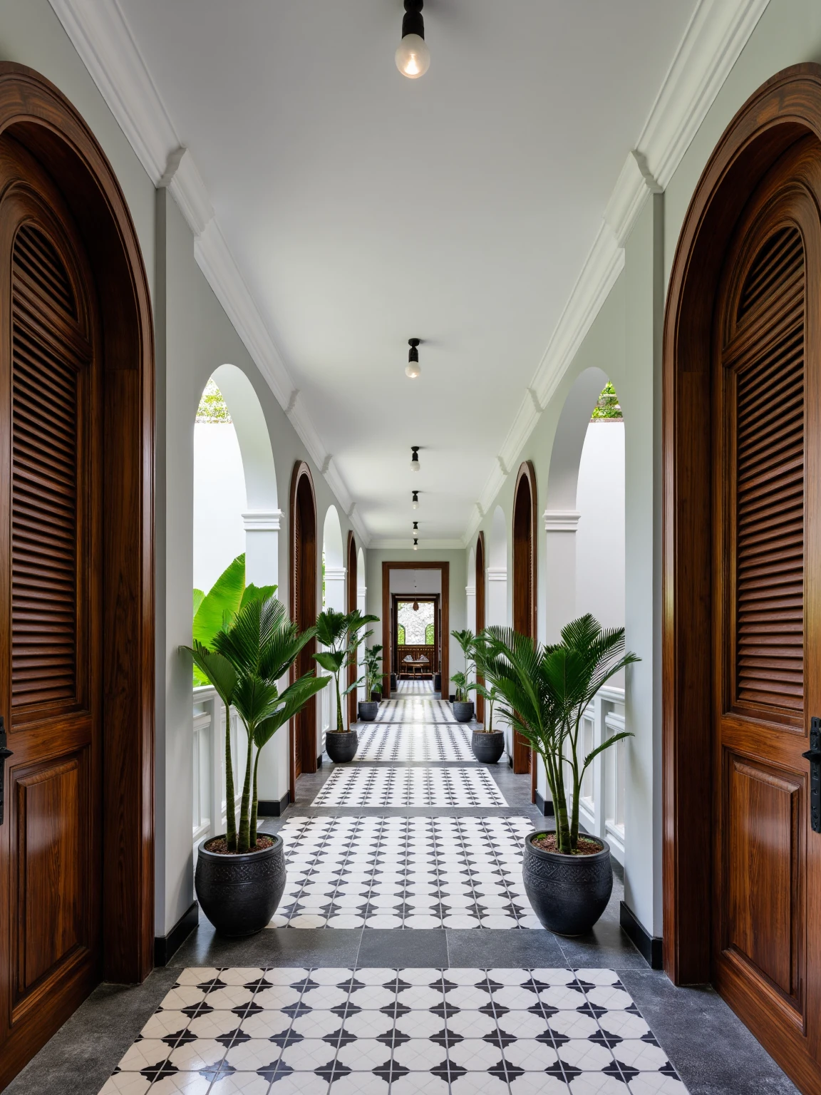 - Yếu tố kiến trúc: arched doorways, colonial ceiling fans, wooden shutters, patterned encaustic tiles
