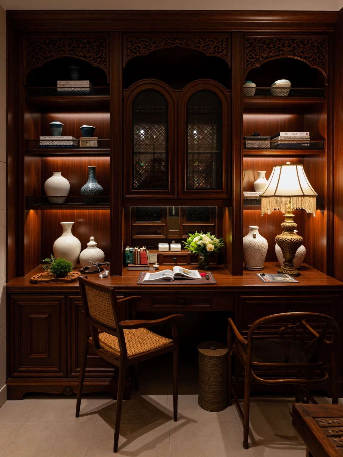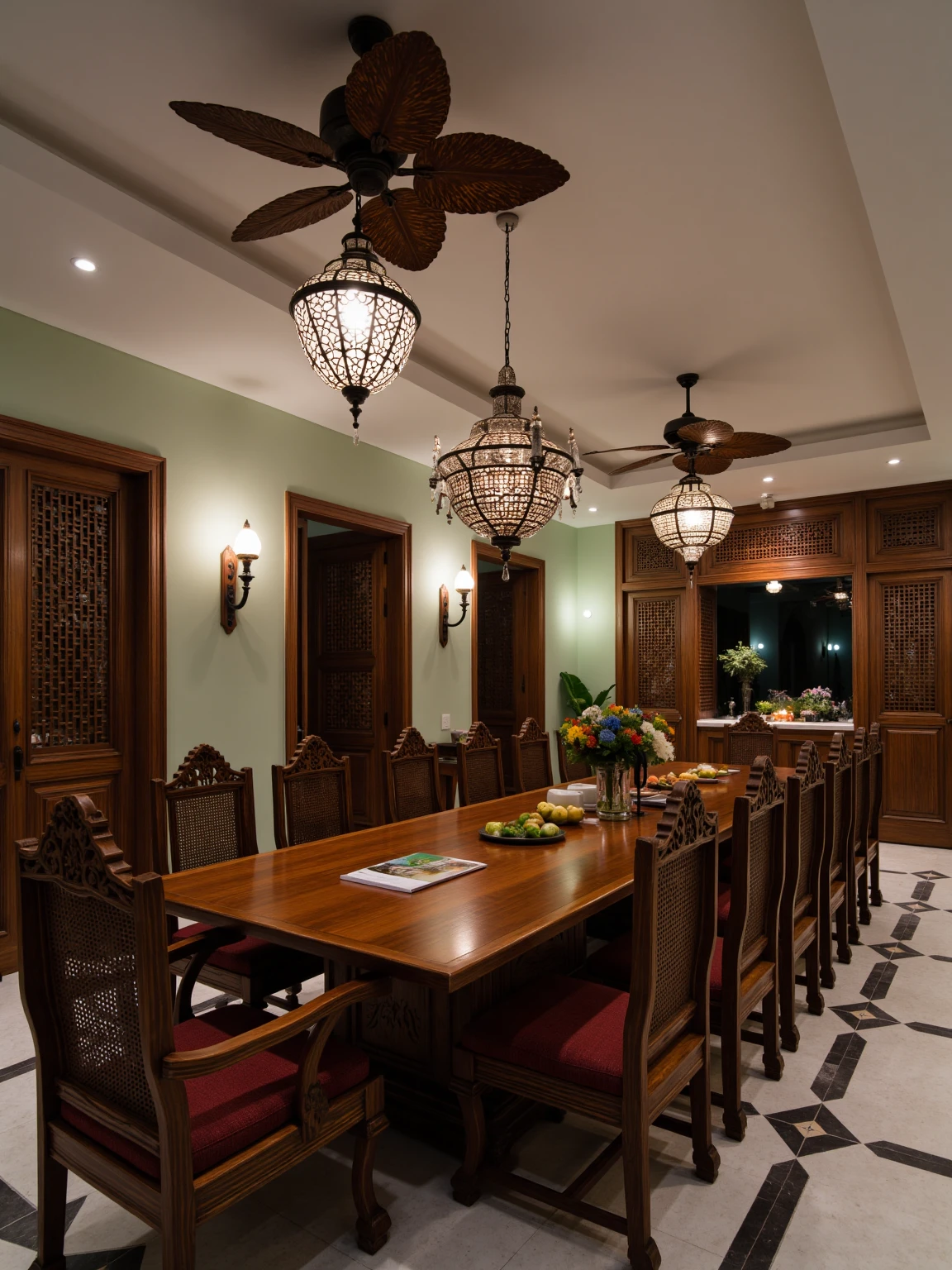 - Mô tả vật liệu đặc trưng: dark wood, rattan furniture, ceramic tiles, carved wooden panels, brass fixtures