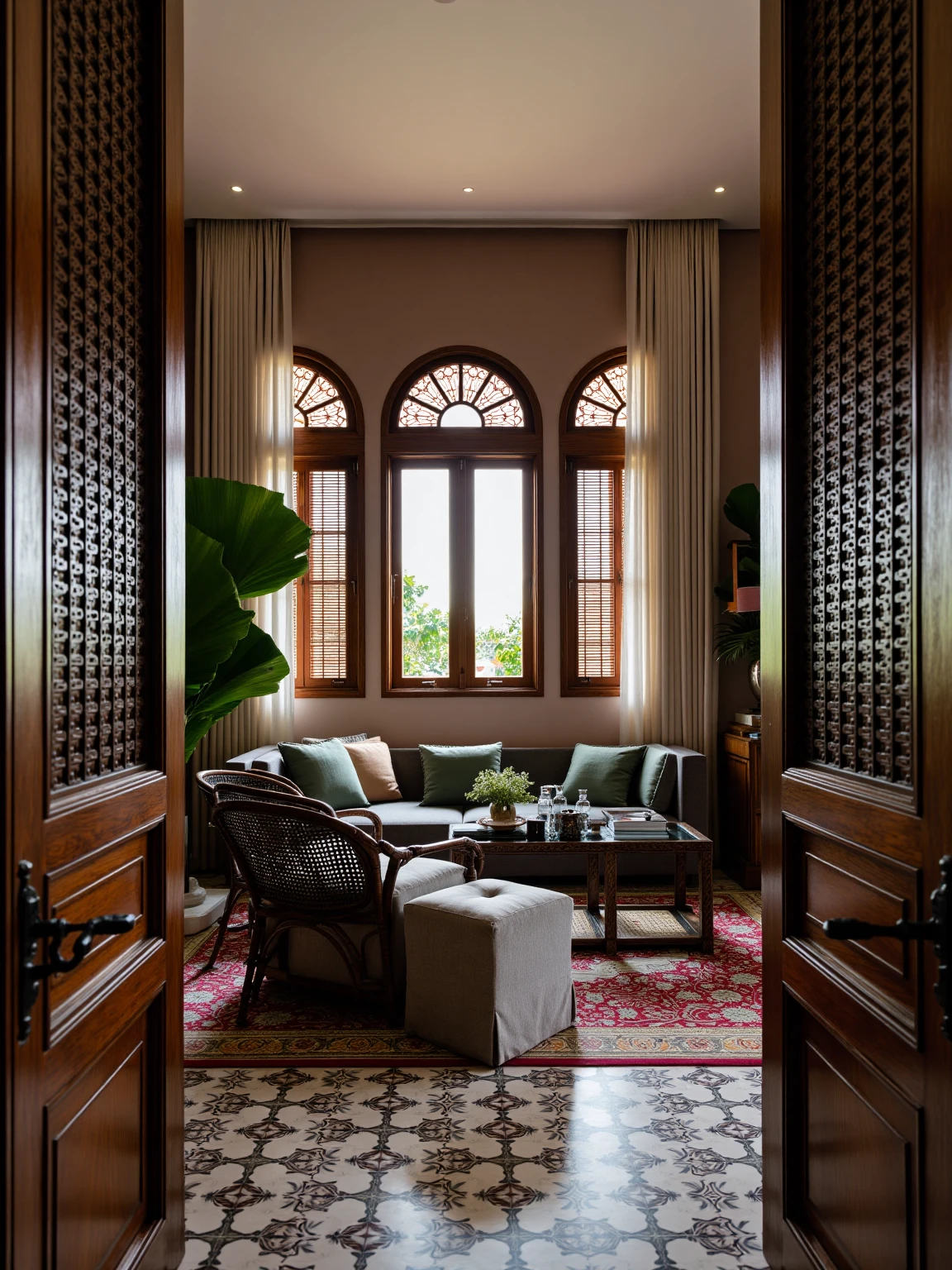 For example: Indochinese interior design, A luxurious Indochinese-style living room featuring dark wooden furniture with intricate carvings, rattan chairs, and patterned encaustic tile flooring. Large arched windows framed by elegant curtains let in warm golden light, creating a nostalgic yet sophisticated ambiance.