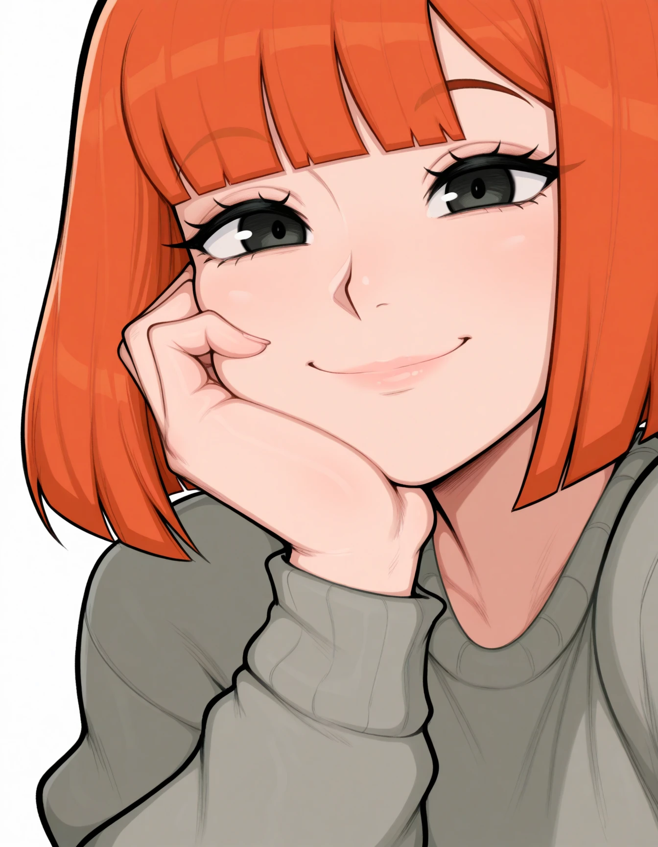 - Character Tags: orange hair, short hair, bob cut, blunt bangs, black eyes
