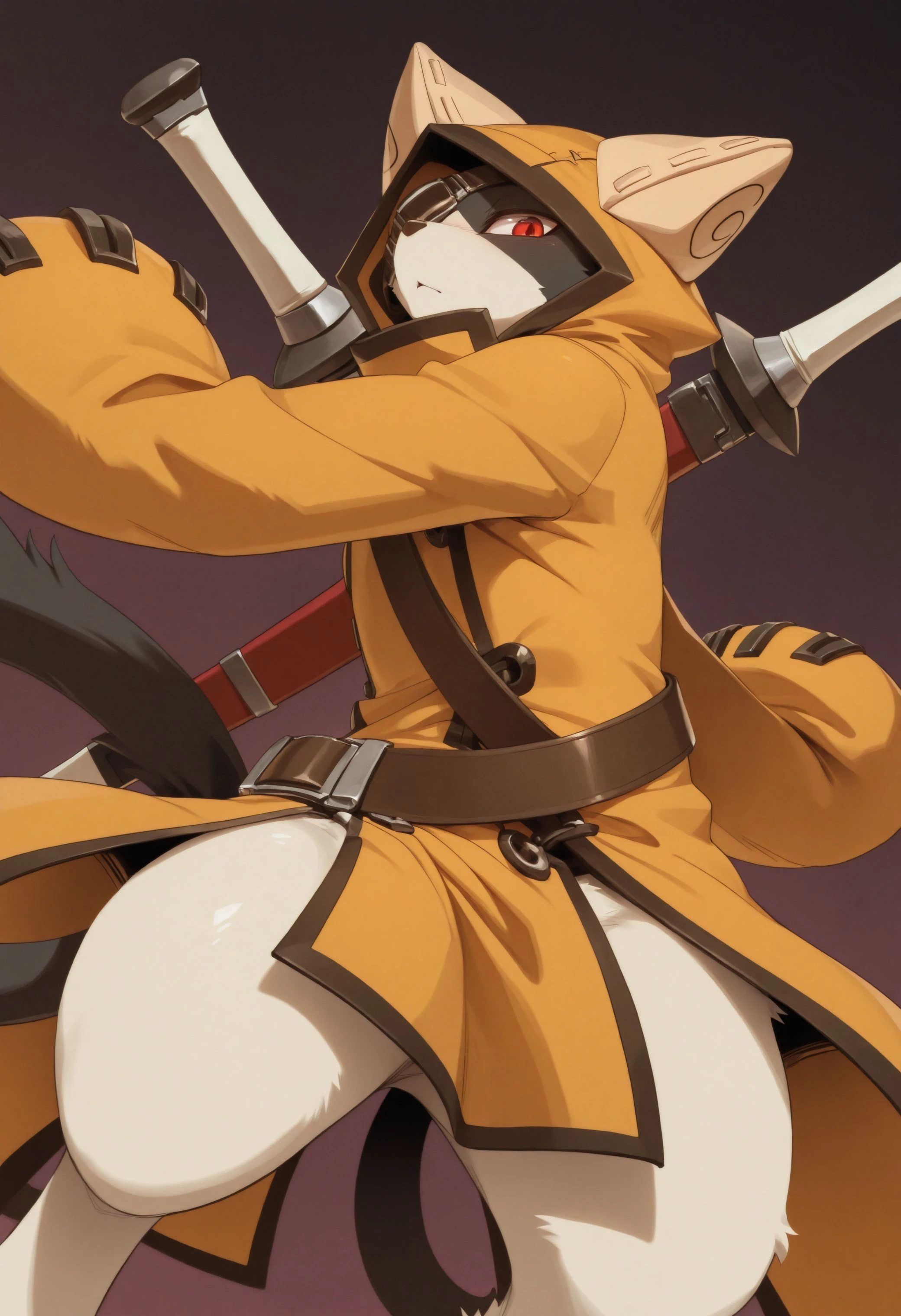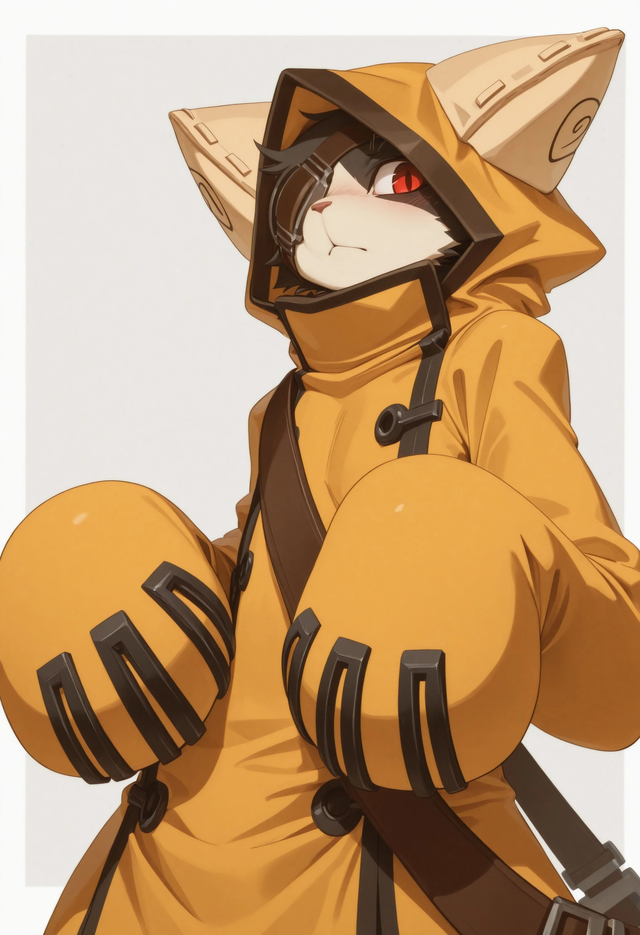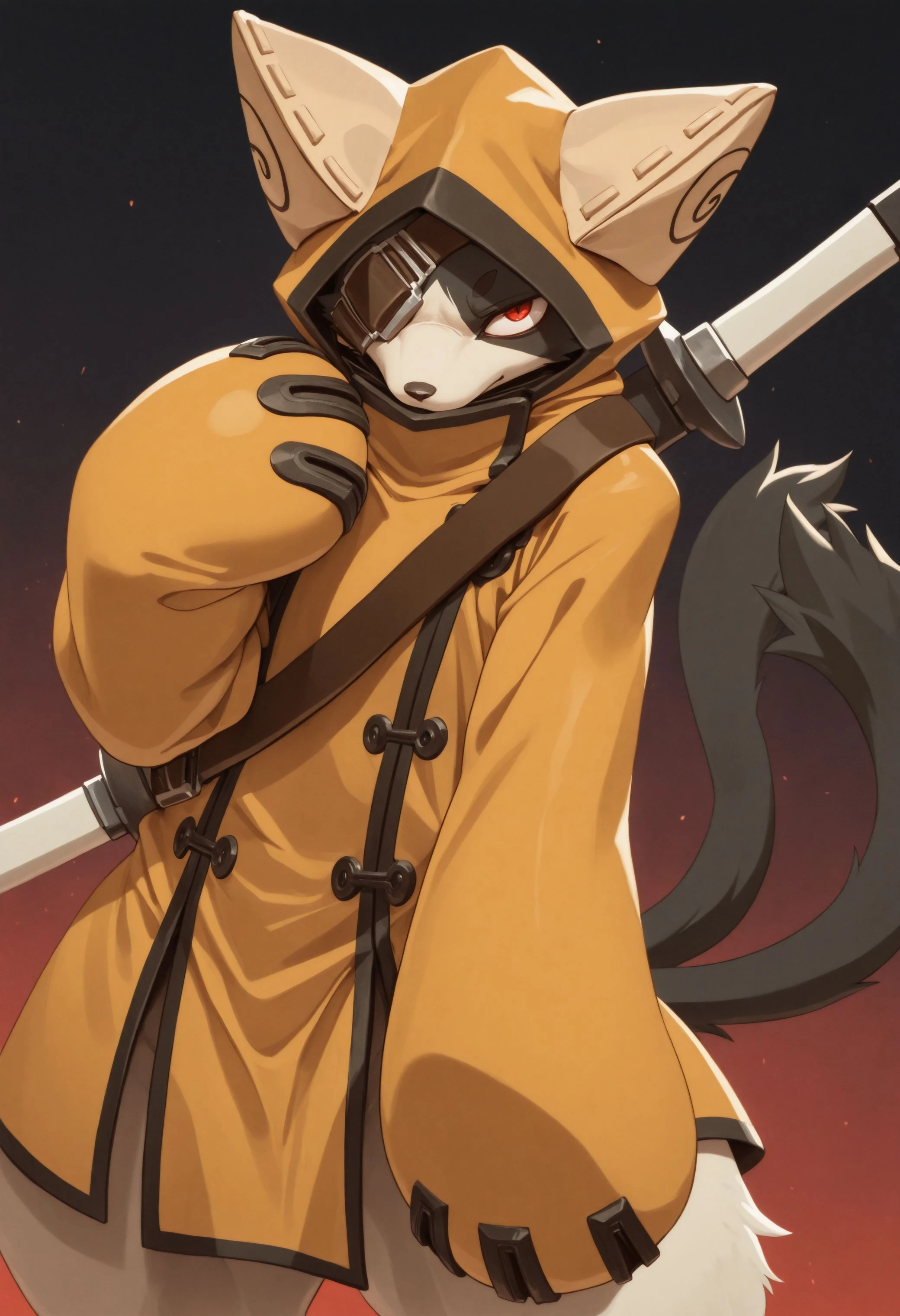 Illustrious: masterpiece, hires, 4k, best quality, high quality, amazing quality, high resolution, jub31bl4zblu3, kaka (blazblue), furry male, furry, 1boy, solo, red eyes, 2 tails, eyepatch, animal hood, clothing, looking at viewer, simple background, ...your tags...Illustrious: bad quality, bad anatomy, crossed arms, malformed limbs, signature, watermarkDescription