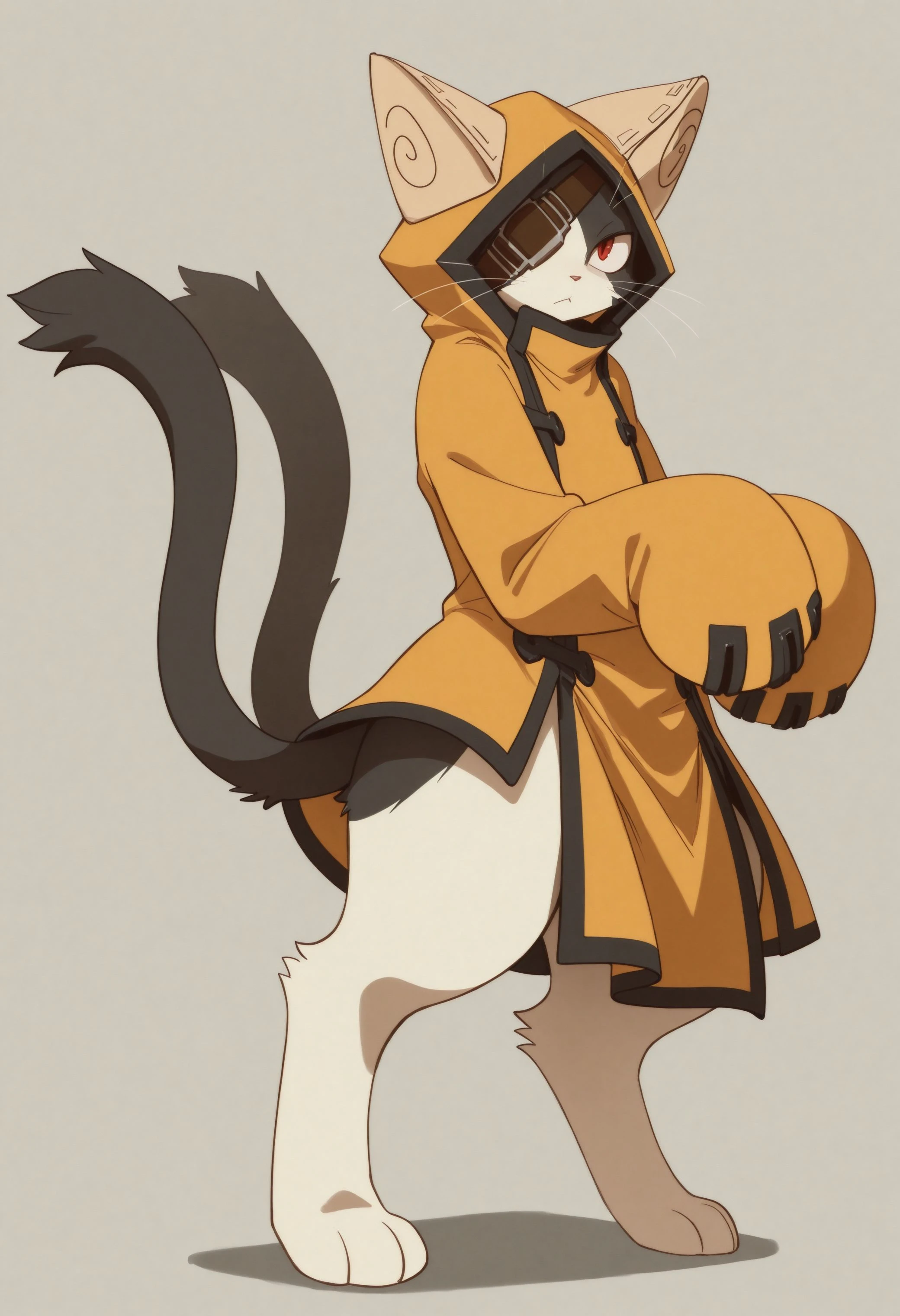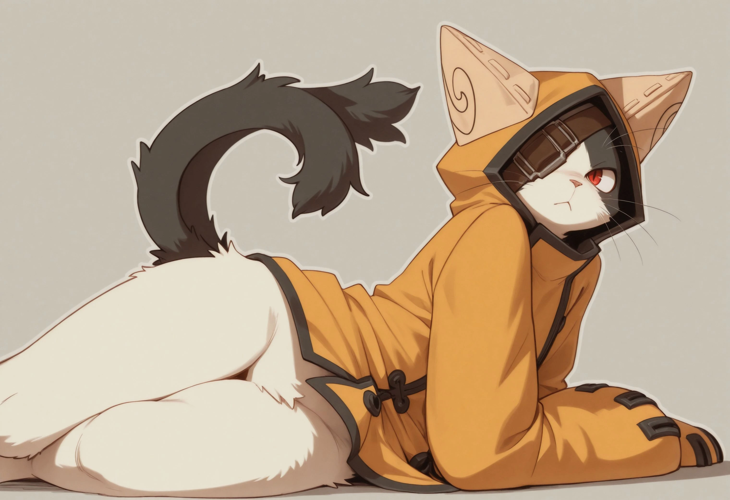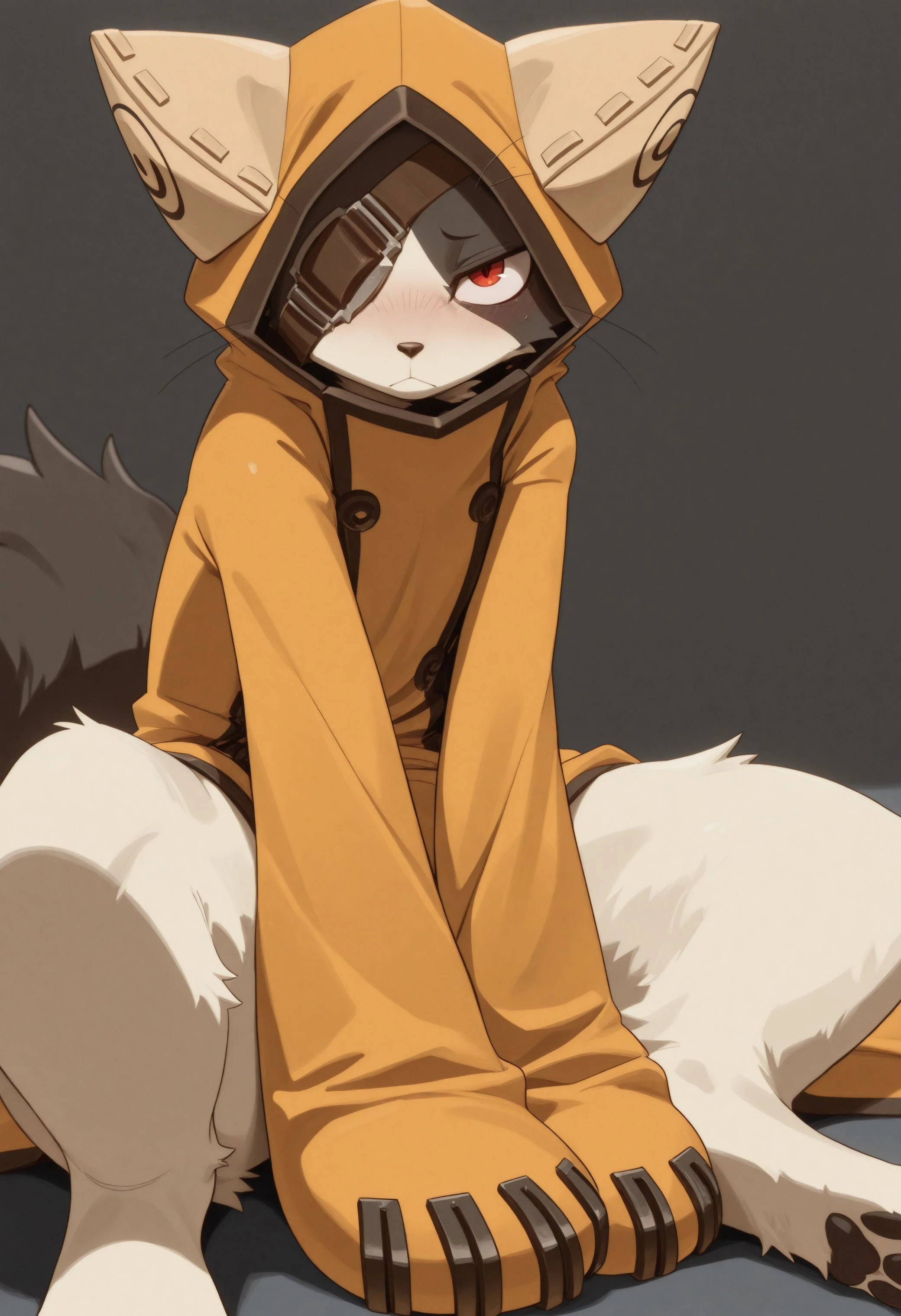 Illustrious: masterpiece, hires, 4k, best quality, high quality, amazing quality, high resolution, jub31bl4zblu3, kaka (blazblue), furry male, furry, 1boy, solo, red eyes, 2 tails, eyepatch, animal hood, clothing, looking at viewer, simple background, ...your tags...Illustrious: bad quality, bad anatomy, crossed arms, malformed limbs, signature, watermarkDescription