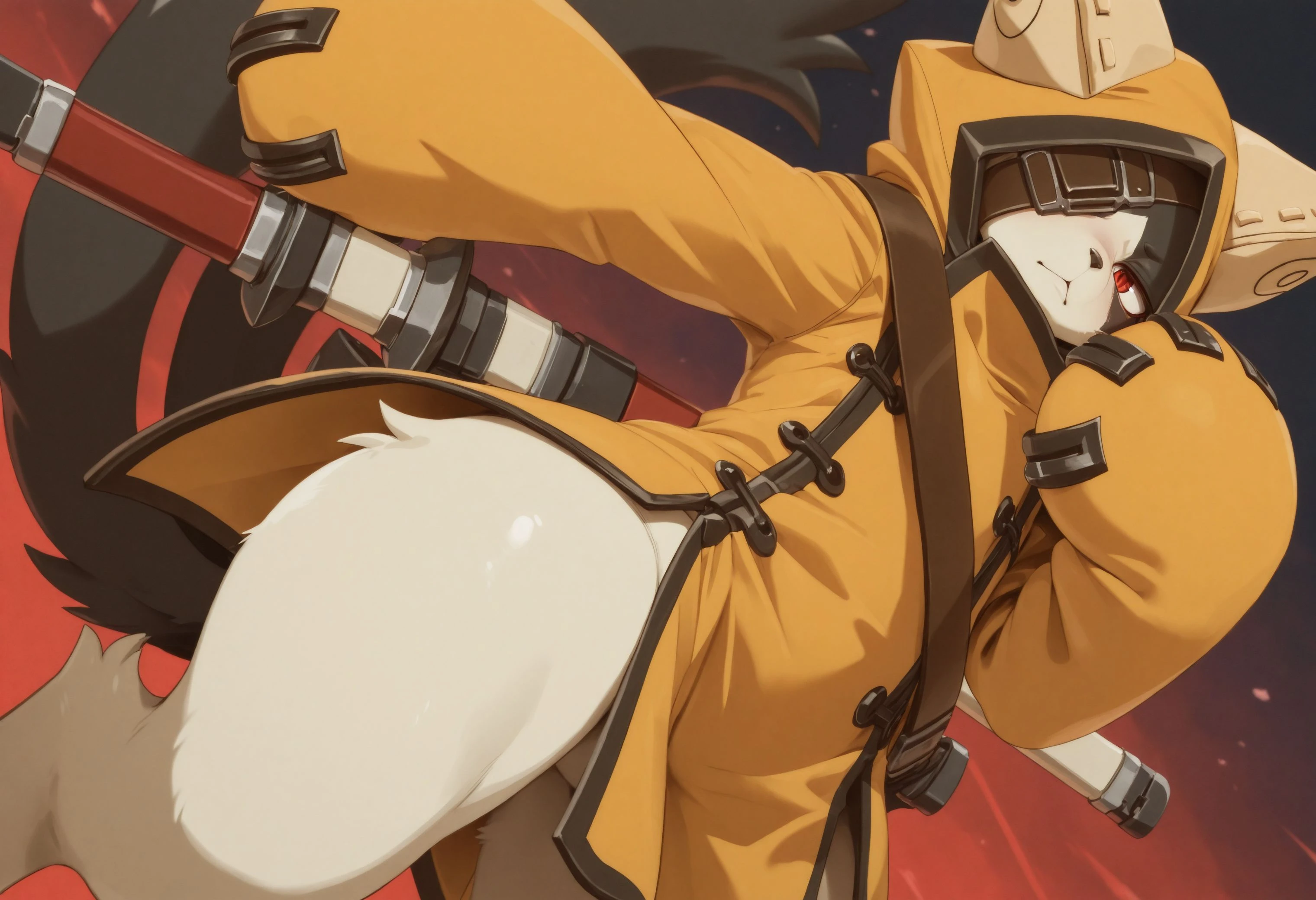 jub31bl4zblu3, kaka (blazblue), furry male, furry, 1boy, solo, red eyes, 2 tails, eyepatch, animal hood, clothing, weapon, katana