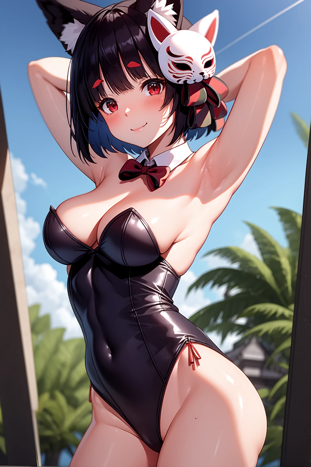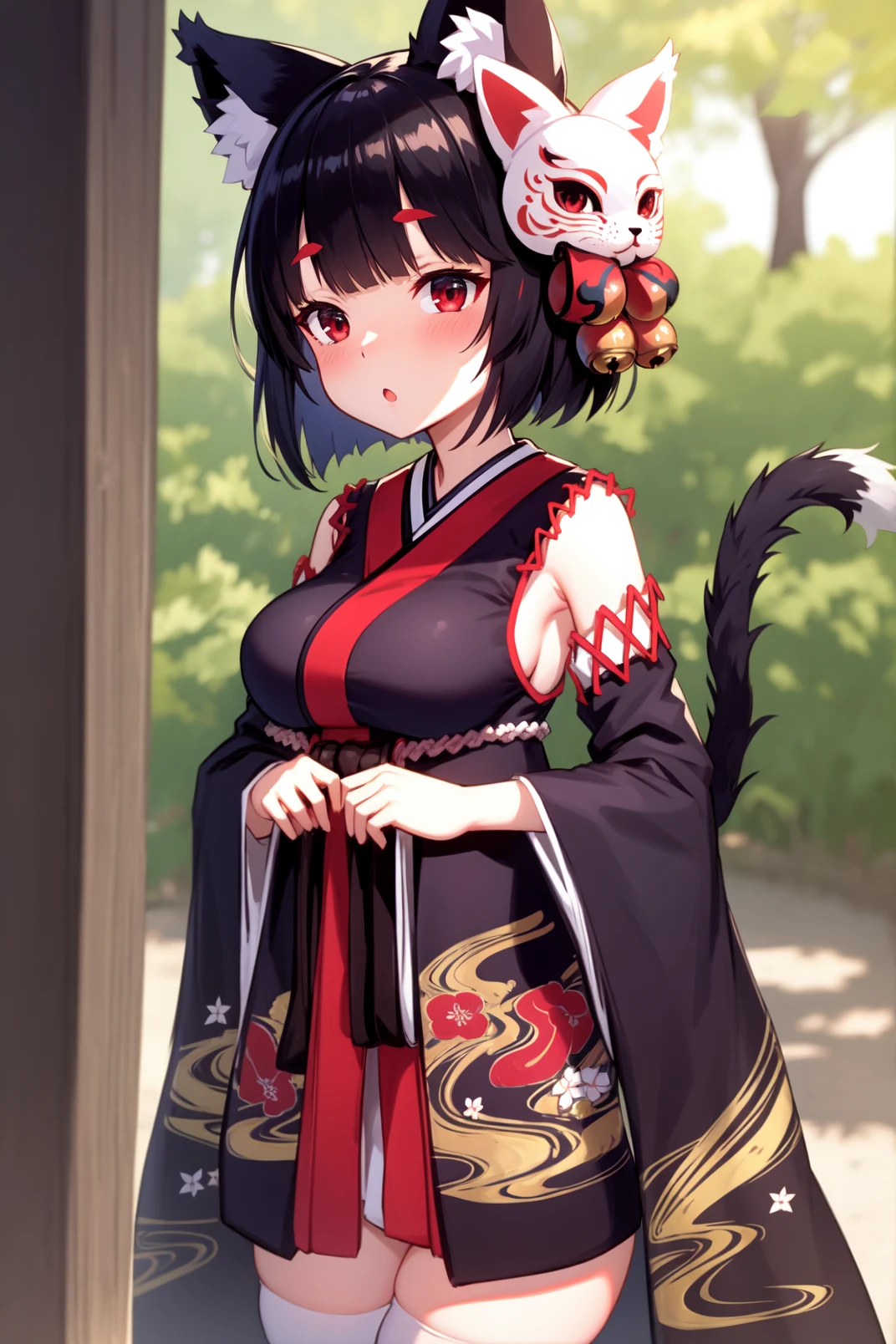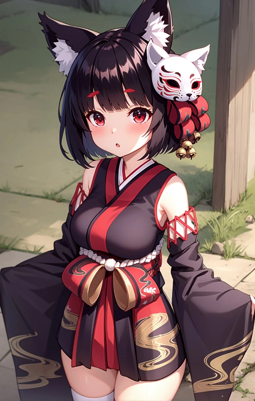 mask on head, cat mask, black kimono, short kimono, sideboob, wide sleeves, white thighhighs, cat bell, jingle bell, floral print, obi bow
