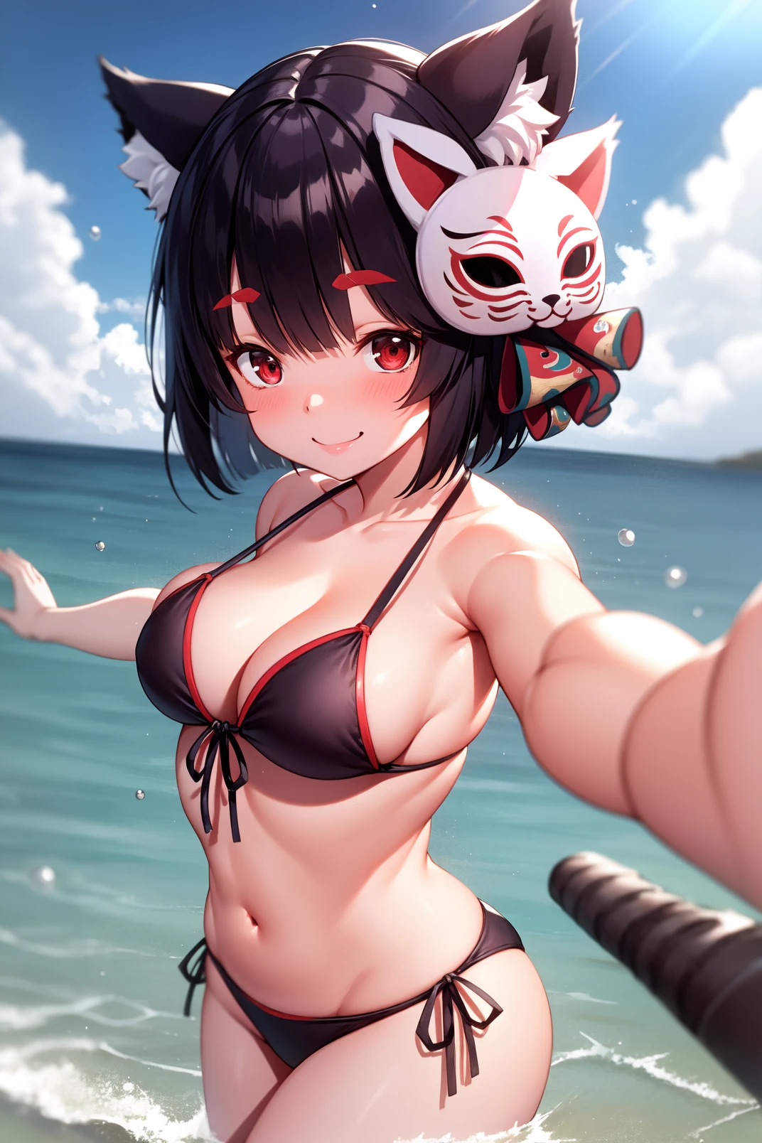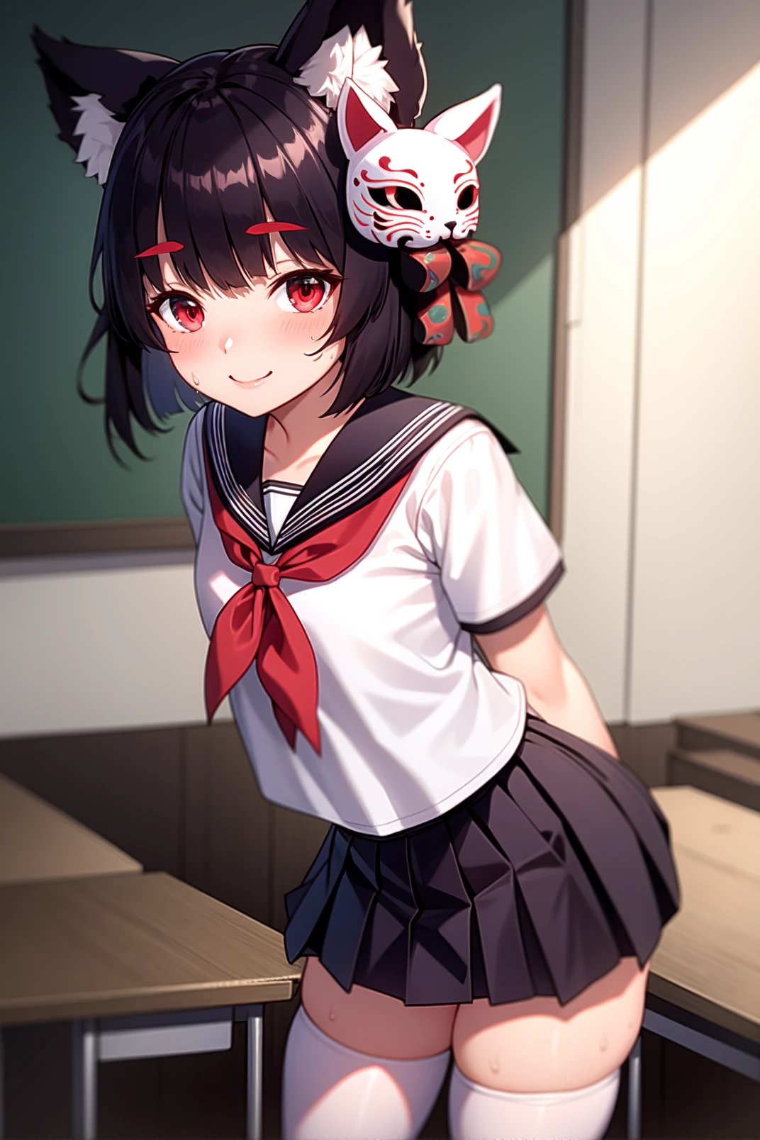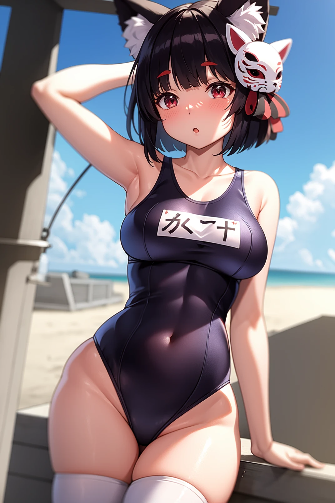 mask on head, cat mask, black kimono, short kimono, sideboob, wide sleeves, white thighhighs, cat bell, jingle bell, floral print, obi bow