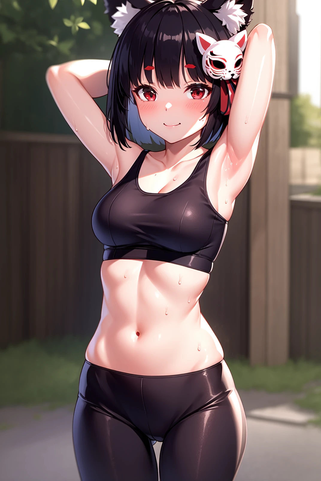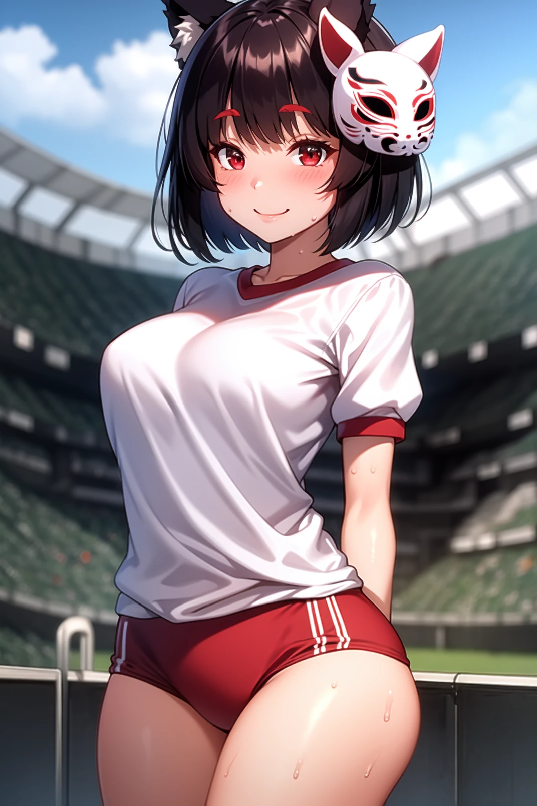appearance: yamashiro, red eyes, black hair, short hair, bangs, mismatched eyebrow, cat ears, cat tail