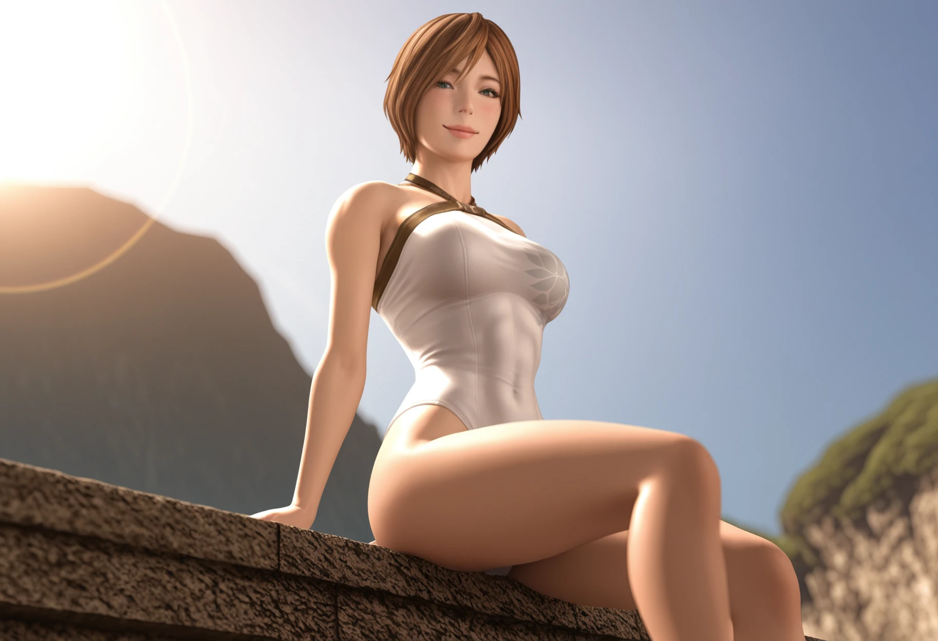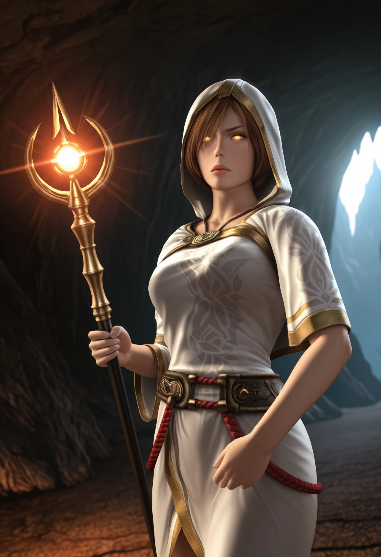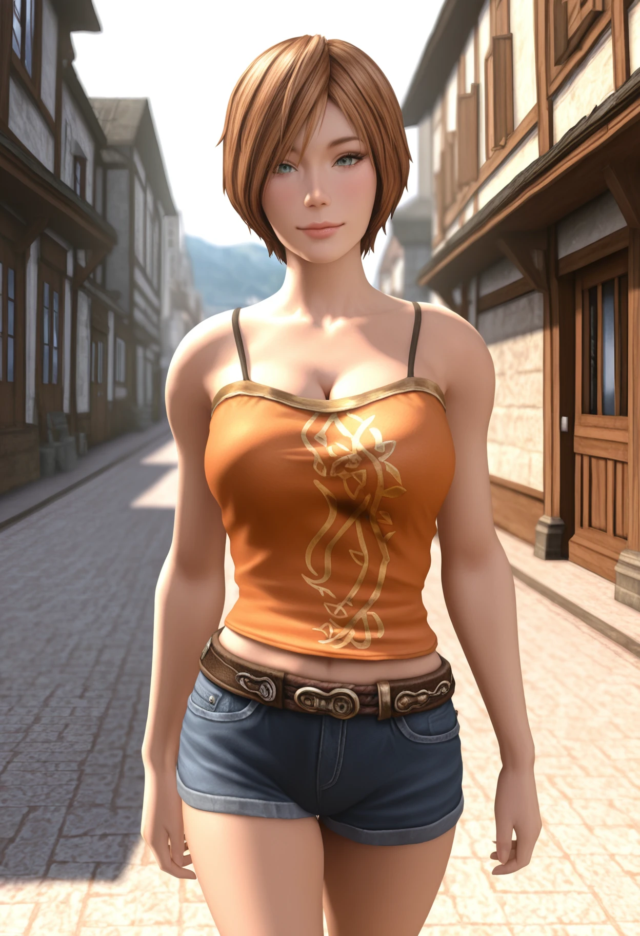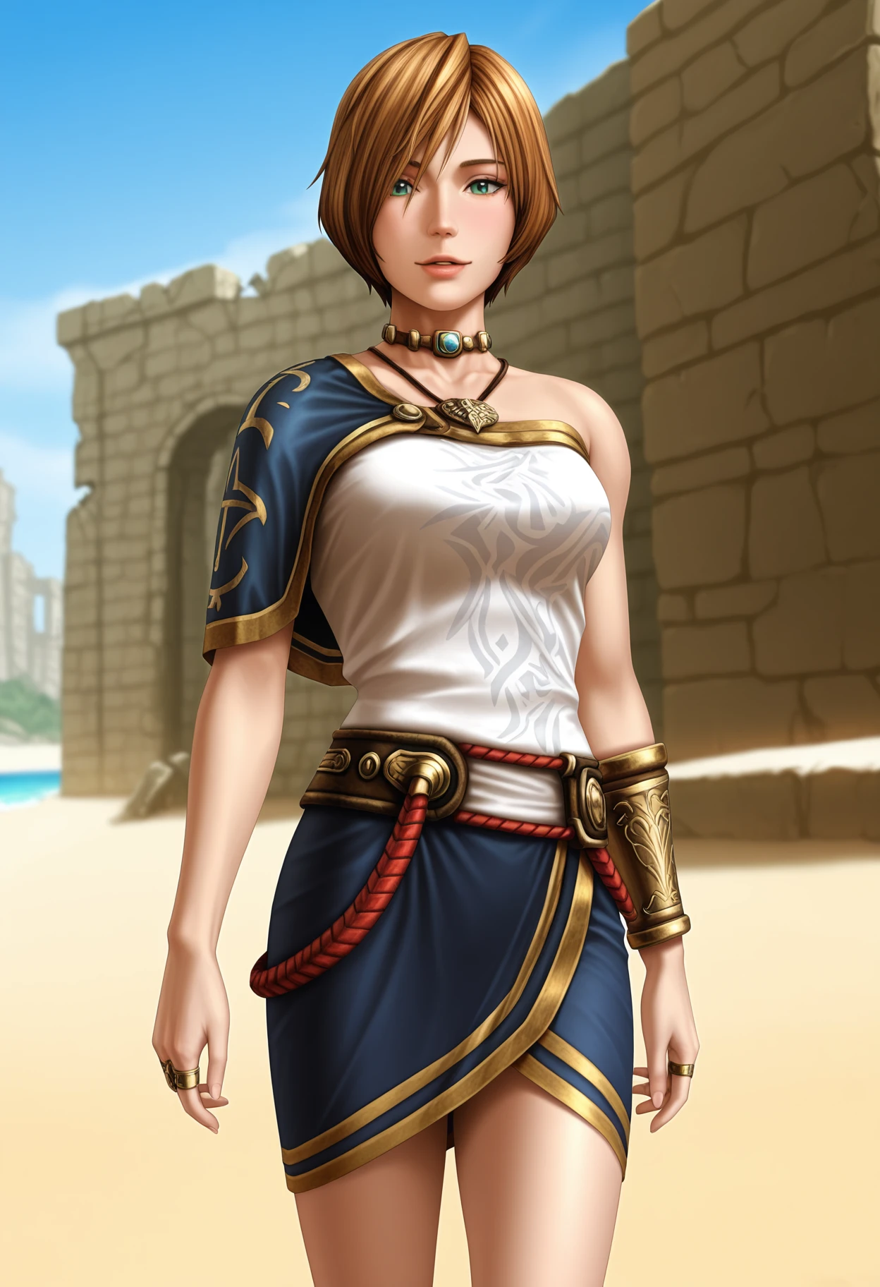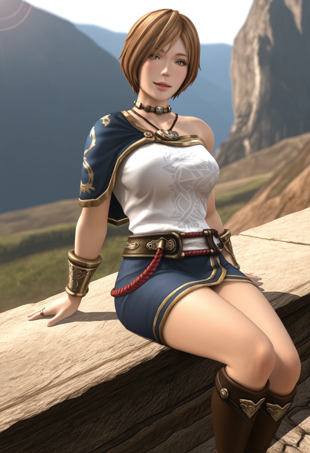 choker, necklace, blue capelet, white shirt, sleeveless shirt, bracer, ring, belt, blue skirt, pencil skirt, knee boots, brown footwear