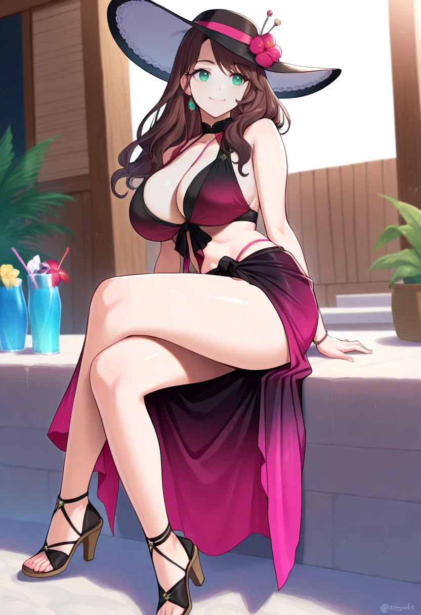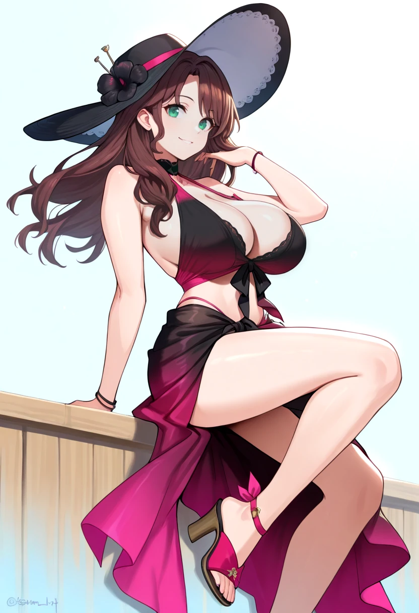 Summer: black bikini, brown hair, green eyes, high heel sandals, jewelry, long hair, sarong, sun hat, gradient clothing, pink straps, bare shoulders, sleeveless, hair sticks, black hat, pink halter