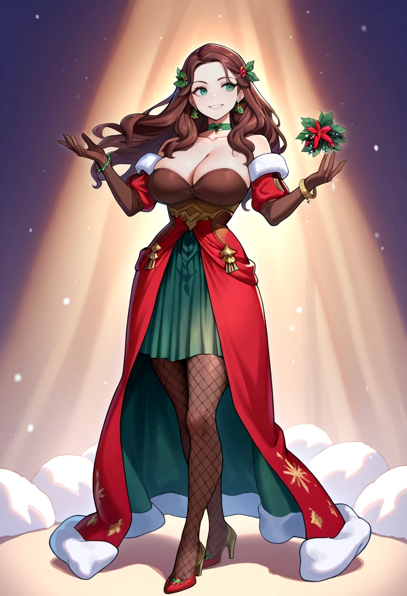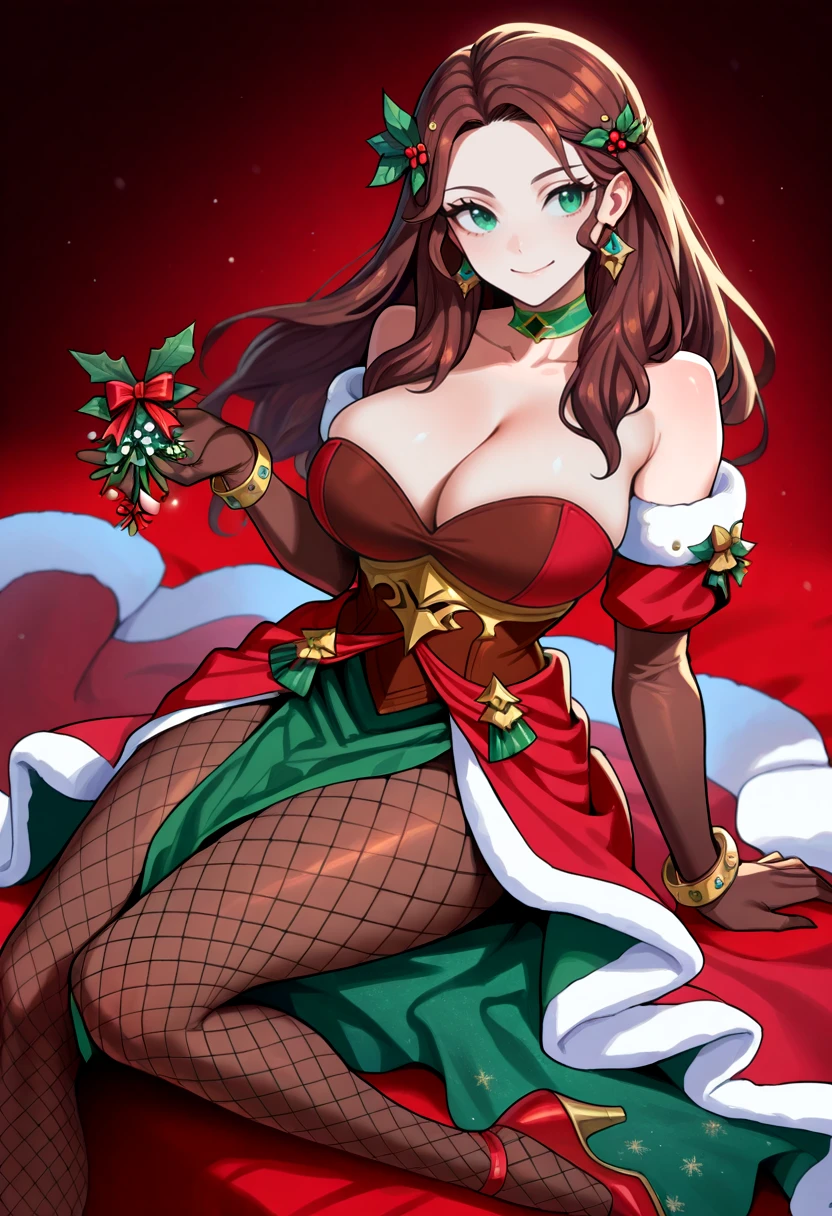 Winter: bare shoulders, bracelet, brown hair, cleavage, collarbone, detached sleeves, earrings, brown elbow gloves, brown bustier, green choker, green eyes, hair ornament, high heels, jewelry, large breasts, long hair, mistletoe, red dress, red showgirl skirt, green skirt, white fur trim, fishnet pantyhose,