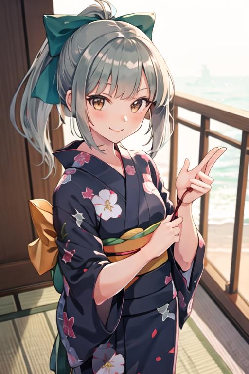 ponytail, bangs, brown_eyes, bow, hair_bow, green_hair, grey_hair, serafuku, smile