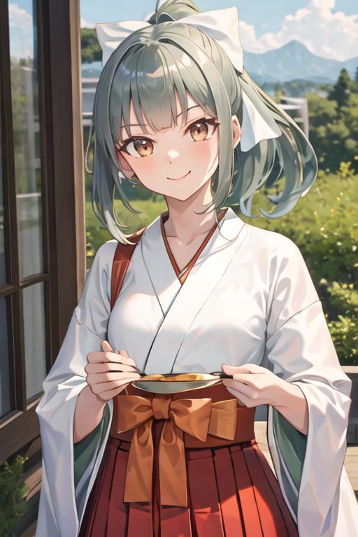 The trigger word is yuubari_kantaicollection, and the recommended tags are best quality, masterpiece, highres, solo, {yuubari_kantaicollection:1.15}, ponytail, bangs, brown_eyes, bow, hair_bow, green_hair, grey_hair, serafuku, smile.