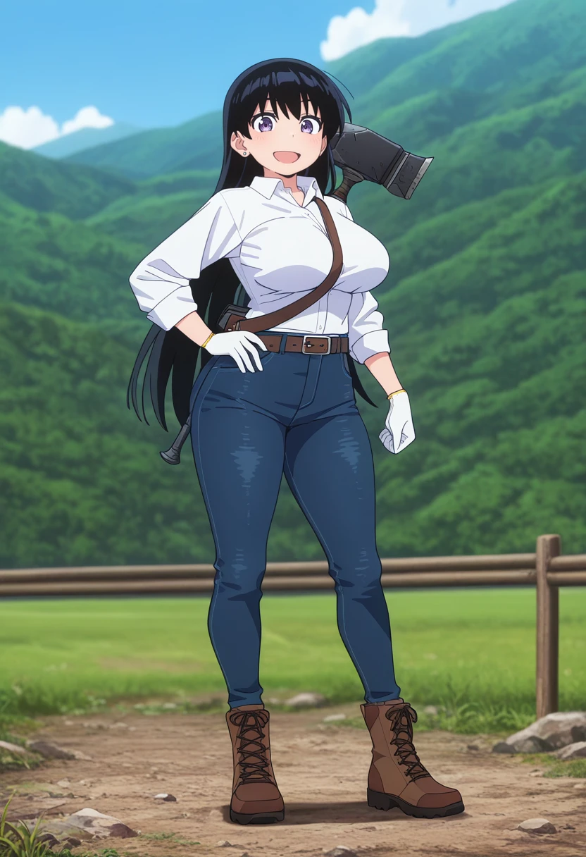 huge weapon, hammer, weapon on back, strap between breasts,