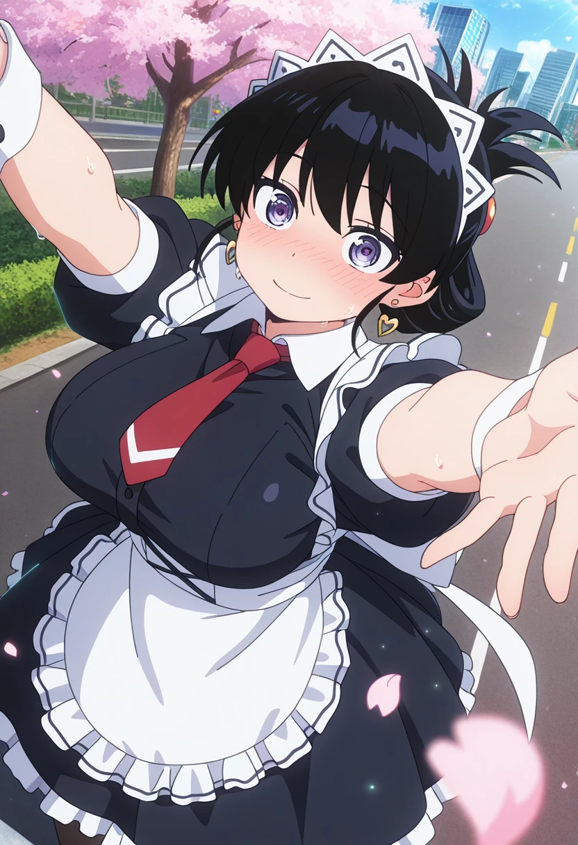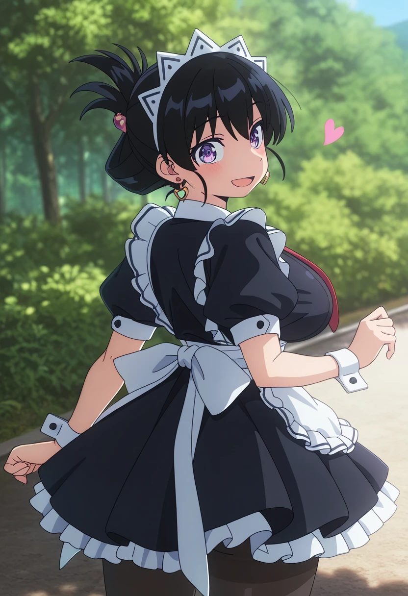 nagiww, light purple eyes, black hair, short hair, folded ponytail, heart earrings, large breasts,