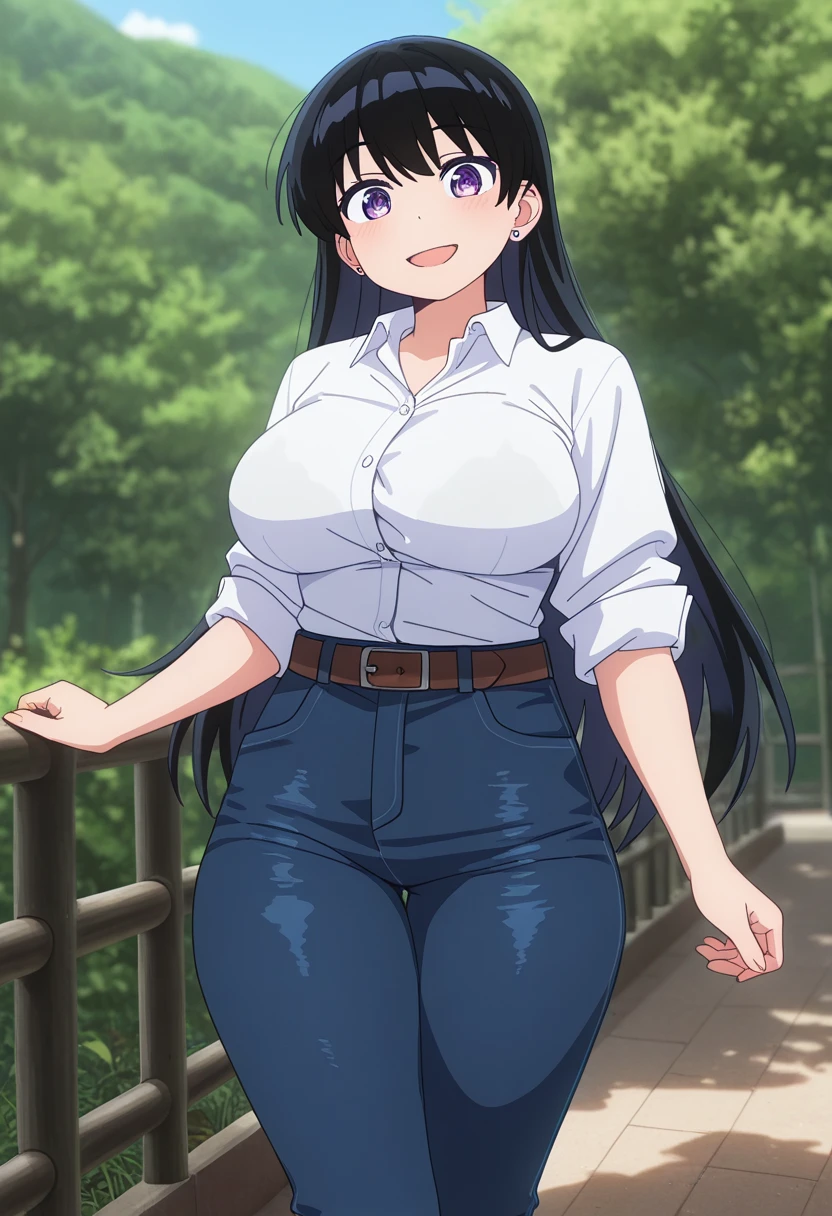 nagiww, light purple eyes, black hair, long hair, stud earrings, large breasts,