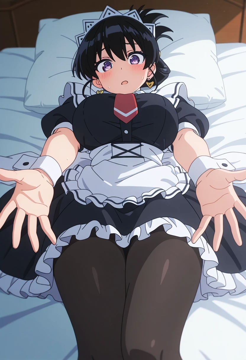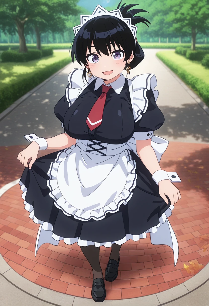maid, maid headdress, red necktie, black dress, frilled dress, puffy short sleeves, wrist cuffs, maid apron, frilled apron, white apron, black pantyhose, black footwear,
