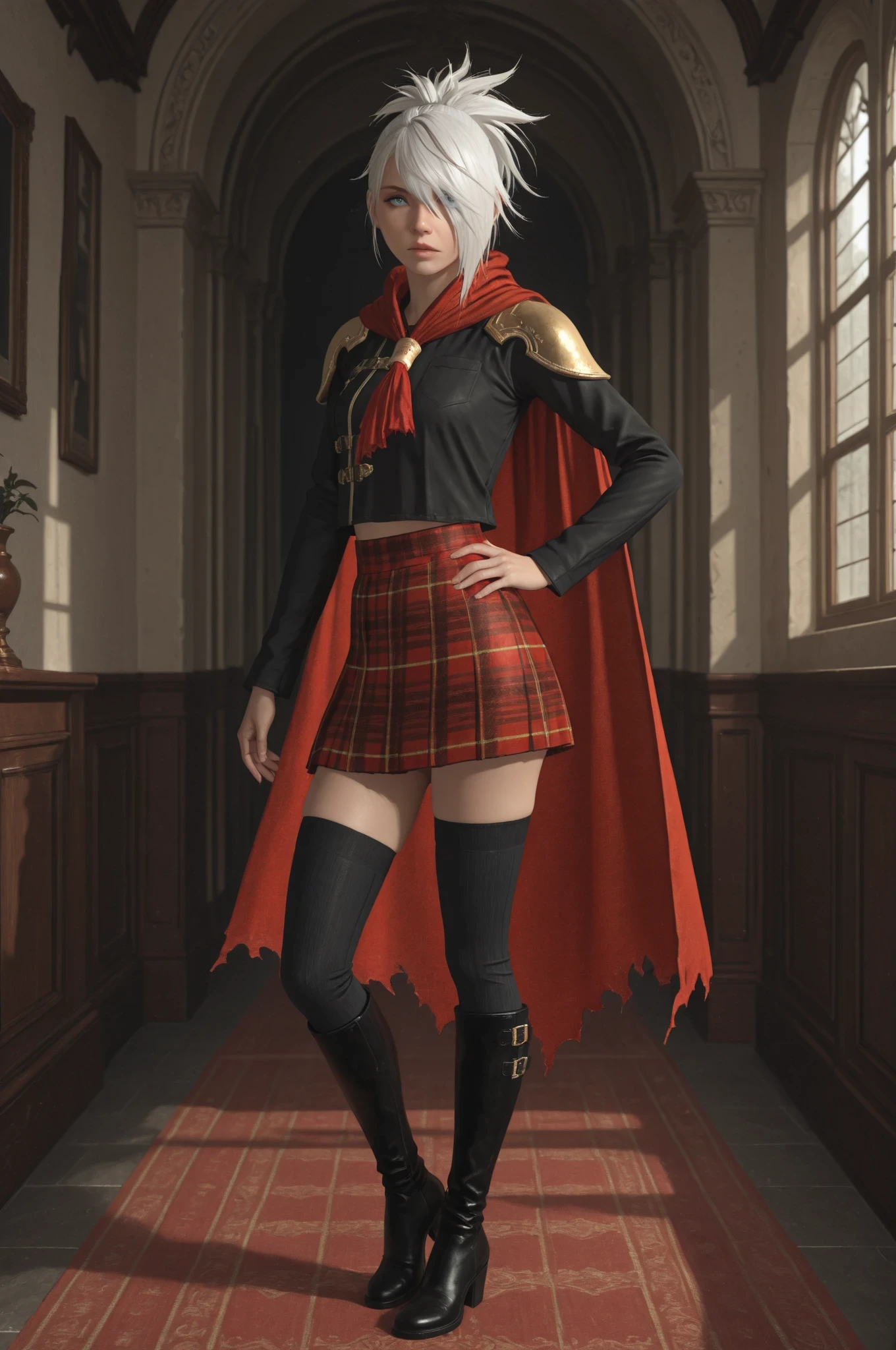 shoulder armor, cape, black shirt, gold trim, plaid skirt, black thighhighs, knee boots,