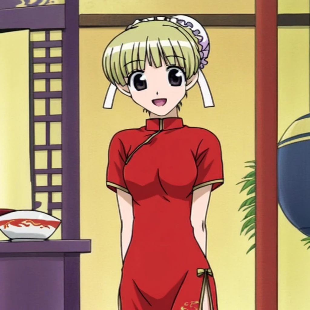Sarah Adiemus, Sarah, Blonde hair, Dark violet eyes, short hair, 1girl, solo, chinese clothes, china dress, bun cover, dress, hair bun, bowl, smile, side slit, single hair bun, open mouth