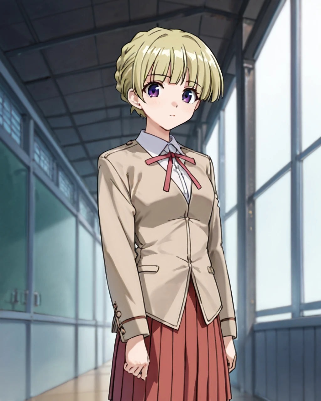 Sarah Adiemus, Sarah, Blonde hair, Dark violet eyes, short hair, 1girl, solo, school uniform, skirt, long sleeves, pleated skirt, red skirt, standing, ribbon, jacket, braid