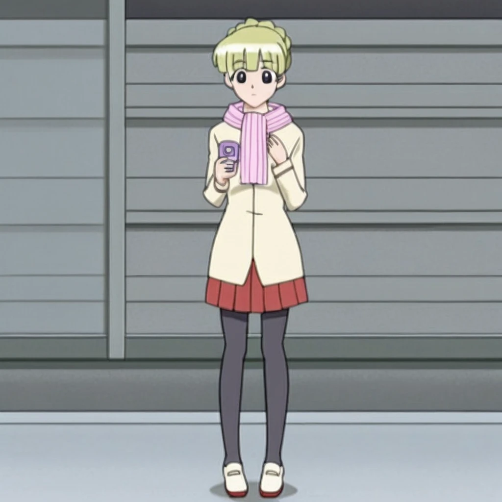 Sarah Adiemus, Sarah, Blonde hair, Dark violet eyes, short hair, 1girl, solo, pantyhose, scarf, phone, skirt, black pantyhose, cellphone, shoes