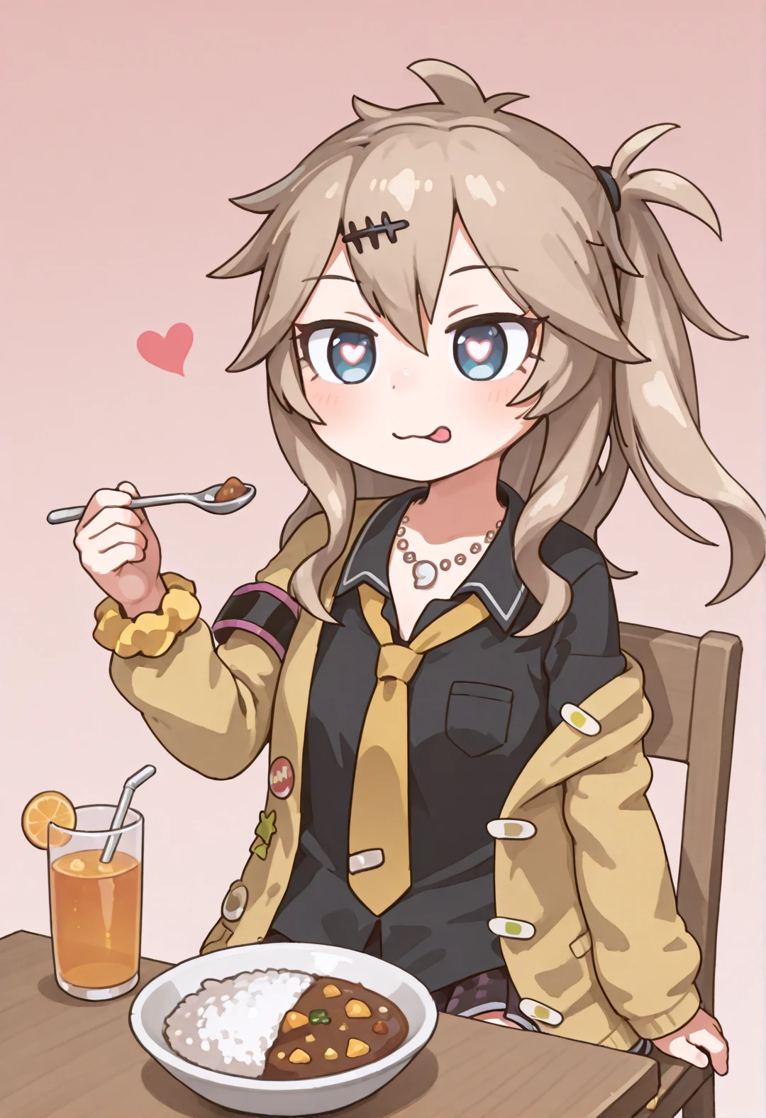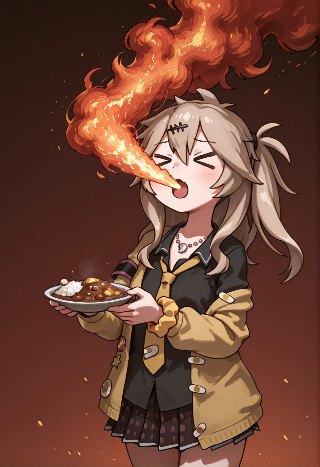 KasukabeTsumugiSKMTAHR, kasukabe tsumugi, blue eyes, brown hair, side ponytail, hairclip, kasukabetsumugiskmtahrcostume, magatama necklace, yellow cardigan, open cardigan, off shoulder, black shirt, yellow loose necktie, pleated miniskirt, black armband, wrist scrunchie, white loose socks, black loafers, Negative Prompts: