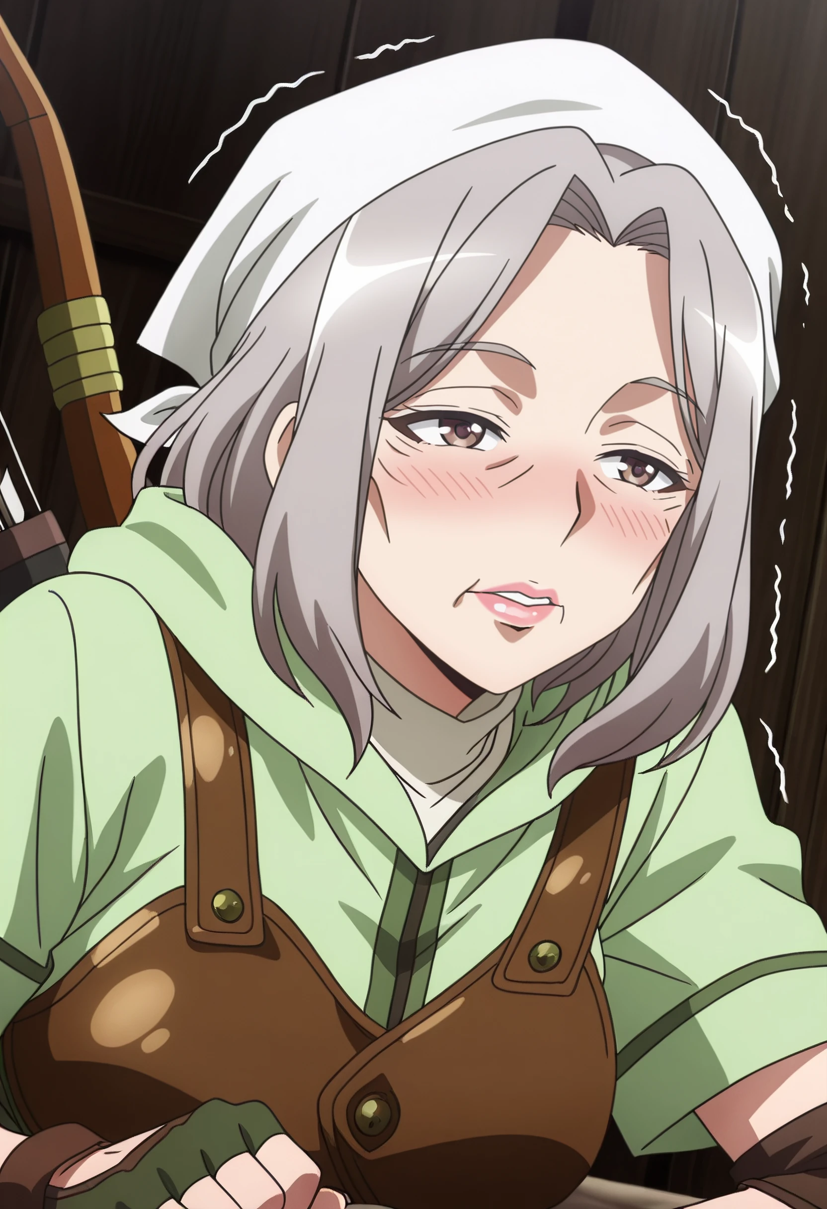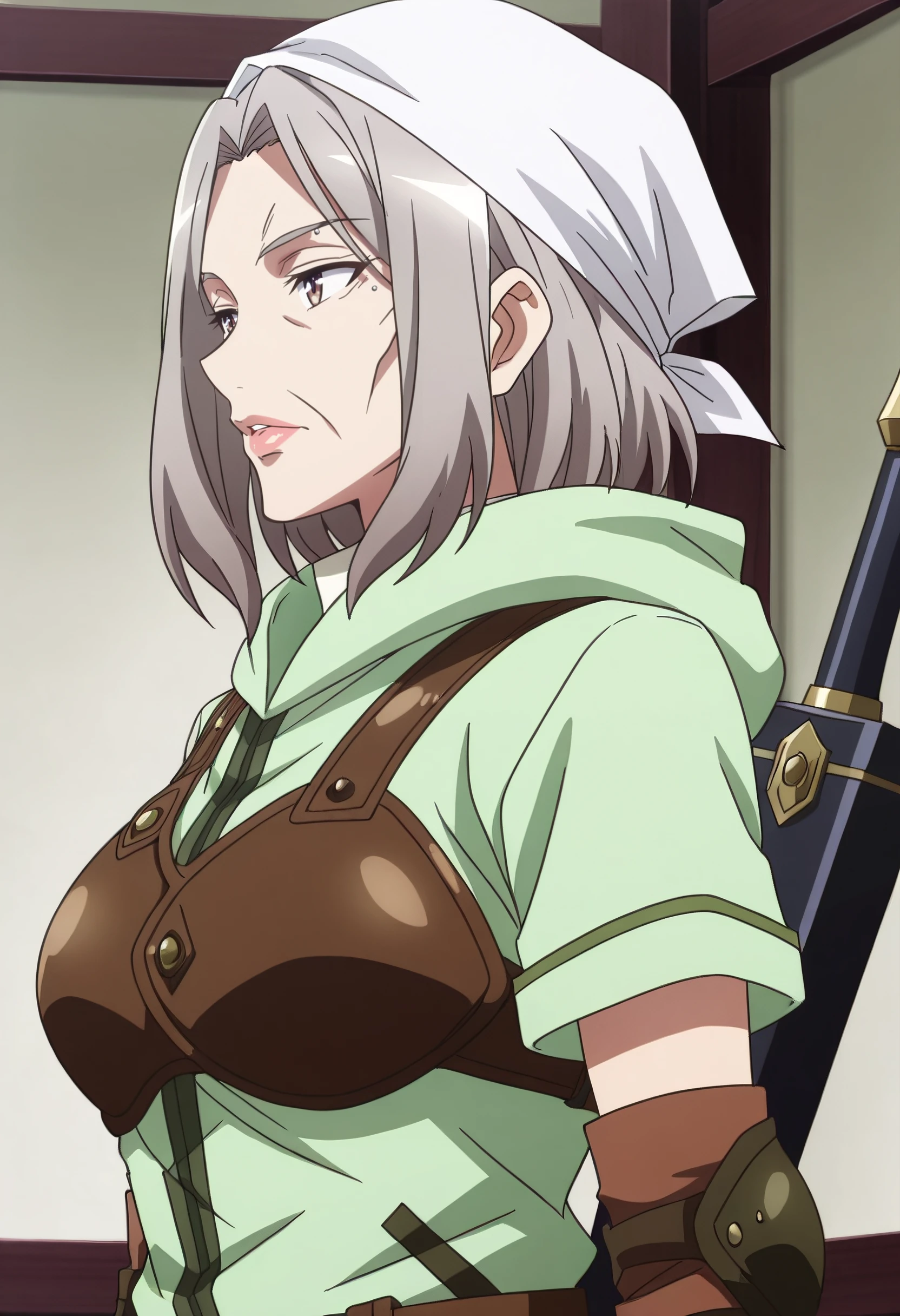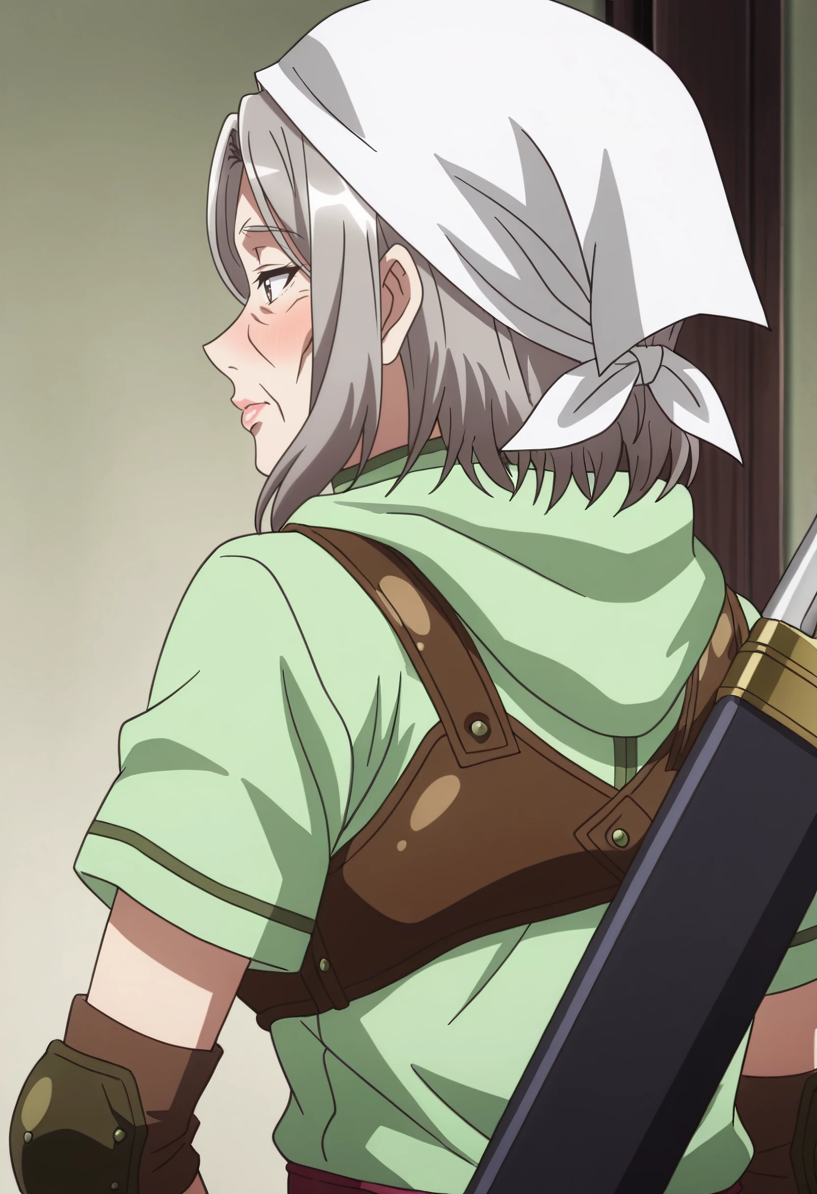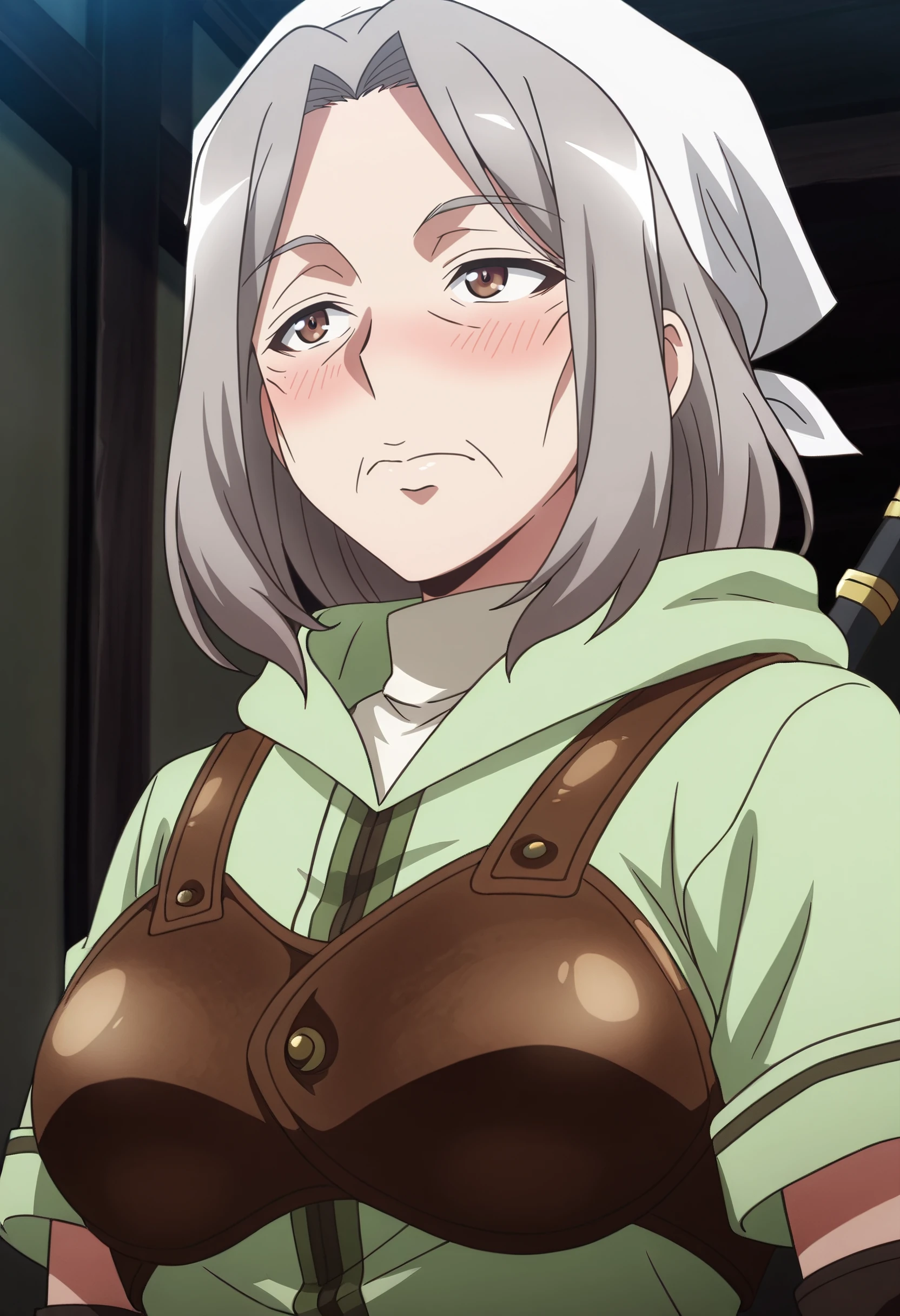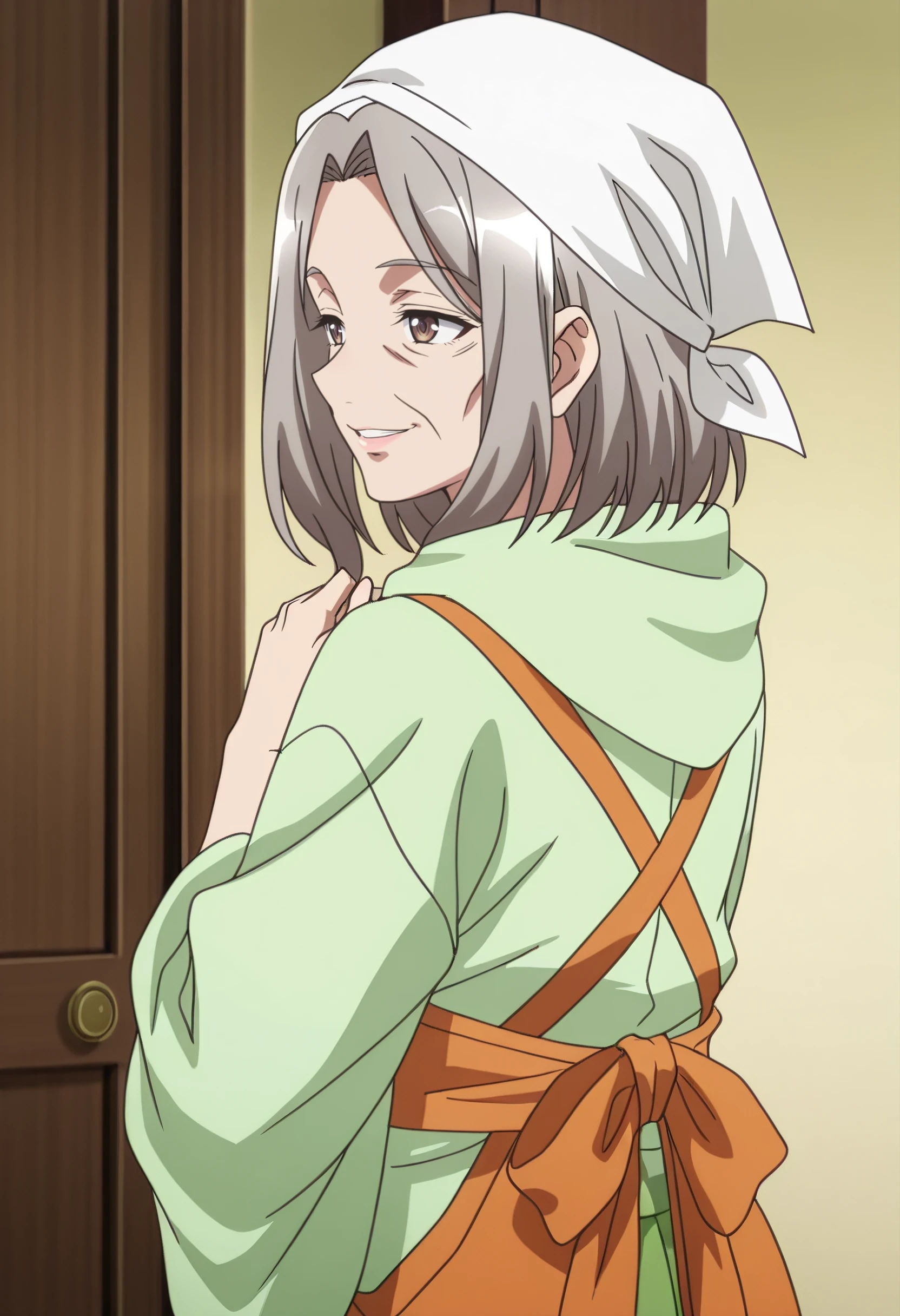 JHNHoxie, brown hair, grey hair, headscarf, brown eyes, short hair, old, old woman,